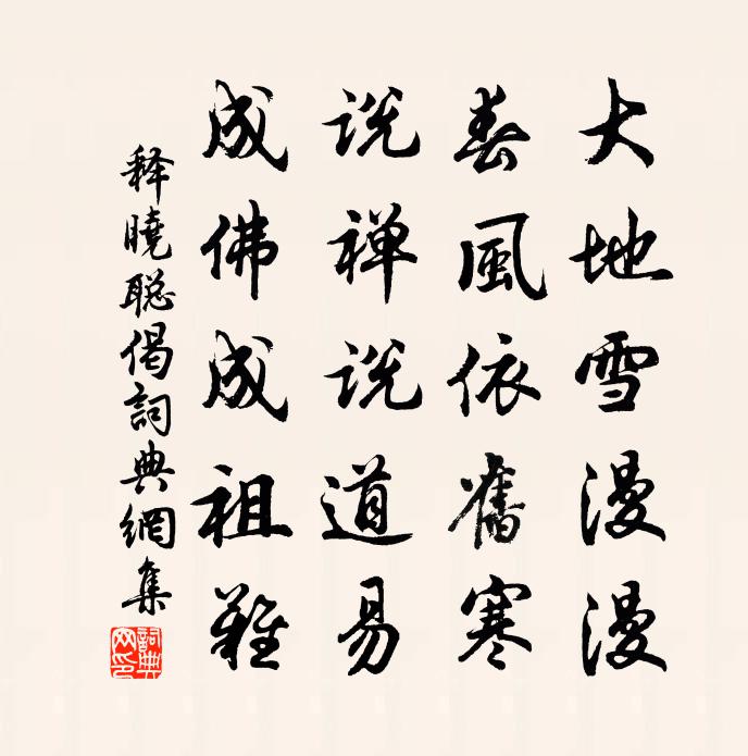 詩詞名句歷史字典書法欣賞書法字典國語詞典說文解字康熙字典古漢語字典標 題 作 者 詩 句 偈作者:釋曉聰 朝代:宋代偈原文大地雪漫漫,春風依舊寒。說禪說道易,成佛成祖難。詩詞問答問:偈的作者是誰?答:釋曉聰問:偈寫於哪個朝代?答:宋代釋曉聰偈書法欣賞偈書法作品詩詞推薦酬鄧山房尊師仇遠〔宋代〕山房閒伴白雲棲,琴不須彈聽者稀。北道主人新拜號,西湖隱士舊傳衣。粵亡未合鴟夷去,蜀遠難隨杜宇歸。亦欲贈刊字湯生德清馬廷鸞〔宋代〕岐陽雨漬鐫功石,浯水苔昏頌德碑。渺渺昊天須有定,煩君椎鑿待明時。玉抱肚佚名〔宋代〕若論玄妙,聽周風一訣。把嬰兒奼女,木金間隔。從頭分別。先擒六賊三屍滅。後捉玉兔飲鳥烏血。仗劍鋒,麾魔贈梅處士張籍〔唐代〕早聞聲價滿京城,頭白江湖放曠情。講易自傳新注義,題詩不著舊官名。近移馬跡山前住,多向牛頭寺里行。天子次韻子瞻鎖院賜酒燭蘇頌〔宋代〕暮召從容對浴堂,歸來院吏寫宣忙。郢醪獨賜尊常滿,龍燭初然淚有香。起草才多封卷速,把麻人眾引聲長。百官戲詠園中春草陸游〔宋代〕童子爭尋鵓鴿飯,醫翁日曝蝦蟆衣。欲賡楚客詠餐菊,卻媿周人歌採薇。美人宮棋張籍〔唐代〕紅燭台前出翠娥,海沙鋪局巧相和。趁行移手巡收盡,數數看誰得最多。挽恭靖司法兄九首劉宰〔宋代〕沉酣博塞兩防微,男業詩書女治絲。遺訓一編昭日月,宗門於此卜興衰。夜聞方響雍陶〔唐代〕方響聞時夜已深,聲聲敲著客愁心。不知正在誰家樂,月下猶疑是遠砧。頌古二十五首釋崇岳〔宋代〕大道透長安,言端語亦端。臘盡雪消去,春來依舊寒。喜晴釋文珦〔宋代〕經旬雨不斷,今日喜新霽。杖策東皋行,桑柘陰翳翳。蠶老欲登箔,菜麥亦可刈。田園足生理,外此盡誤計。父老次韻韓川奉祠西太乙宮四首黃庭堅〔宋代〕泰壇下瑞雲黃,雨師灑道塵香。便面猶承墜露,金鉦半吐東牆。題竹李群玉〔唐代〕一頃含秋綠,森風十萬竿。氣吹朱夏轉,聲掃碧霄寒。相見歡·花前顧影粼毛奇齡〔清代〕花前顧影粼粼。水中人。水面殘花片片繞人身。 私自整,紅斜領,茜兒巾。卻訝領間巾里刺花新。頌古九十八首釋印肅〔宋代〕未解空時決定疑,速教歸去莫令遲。諸方罕辨無聲句,師子還生師子見。湖亭釋文珦〔宋代〕一堤楊柳青絲輭,百頃芙蕖錦障開。中有閒人心似水,坐看沙鳥鏡中來。寄滿子權王令〔宋代〕西北風吹數紙詩,神門樞鑰鬼關機。九原黃土英靈活,萬古青天霹靂飛。我是懦夫無壯志,近思近日竊餘輝。高樓三衢官舍和王府教汪元量〔宋代〕十年牢落走窮荒,萬里歸來行路長。坐上佳賓能鼓瑟,窗前細雨好燒香。武淹某澤常思漢,甫寓鄜州只念唐。秉燭送黃司錄黃彥平〔宋代〕異縣傷流落,同官及老成。詩書尚家法,譜系更宗盟。歲暮一樽酒,陽春千里行。雙旌定何處,撫字振新聲。南歌子向子諲〔宋代〕江左稱岩桂,吳中說木犀。水沈為骨鬱金衣。卻恨疏梅惱我、得香遲。葉借山光潤,花蒙水色奇。年年勾引賦新詩名句推薦豪華盡成春夢,留下古今愁。康與之《訴衷情令·長安懷古》 身多疾病思田裡,邑有流亡愧俸錢。韋應物《寄李儋元錫》 寡助之至,親戚畔之;多助之至,天下順之。孟子《孟子·公孫丑章句下·第一節》 更吹羌笛關山月,無那金閨萬里愁王昌齡《從軍行七首》 陽春布德澤,萬物生光輝。佚名《長歌行》 黃雲隴底白雲飛,未得報恩不能歸。李頎《古意》 不效艾符趨習俗,但祈蒲酒話昇平。殷堯藩《端午日》 無半點閒愁去處,問三生醉夢何如。喬吉《折桂令·七夕贈歌者》 發言玄遠,口不臧否人物。房玄齡《晉書·列傳·第十九章》 秦地羅敷女,採桑綠水邊。李白《子夜吳歌·春歌》
