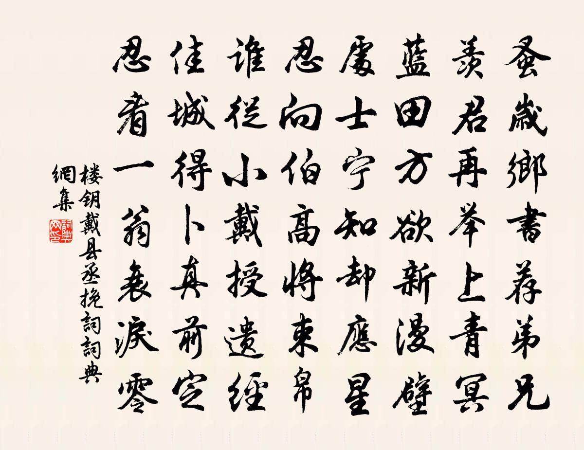 詩詞名句歷史字典書法欣賞書法字典國語詞典說文解字康熙字典古漢語字典標 題 作 者 詩 句 戴縣丞輓詞作者:樓鑰 朝代:宋代戴縣丞輓詞原文蚤歲鄉書薦弟兄,羨君再舉上青冥。藍田方欲新漫壁,處士寧知卻應星。忍向伯高將束帛,誰從小戴授遺經。佳城得卜真前定,忍看一翁衰淚零。詩詞問答問:戴縣丞輓詞的作者是誰?答:樓鑰問:戴縣丞輓詞寫於哪個朝代?答:宋代樓鑰戴縣丞輓詞書法欣賞戴縣丞輓詞書法作品詩詞推薦春暉草楊維楨〔元代〕宜男花,春暉草,小草報春暉,葉好花亦好。花上青蚨綴枝滿,阿奶花開春日短。疾風捲地起,勁草偃如麻。借問游石門洞李洪〔宋代〕溪壑縈紆礙去舟,石門雄峭未曾游。雲深飛瀑自成雨,洞辟雙扉最上頭。紫府丹台疑有路,碧岩紅樹飽經秋。追懷次韻和沖卿元日梅堯臣〔宋代〕天心欲銷變,元會罷來朝。新歲起今日,舊年猶昨宵。凍雲低覆闕,殘雪稍封條。又聽驅儺鼓,群邪不可饒。和書樓叔題小蓬萊王邁〔宋代〕月砌雲階不染埃,疑從天上幻將來。一龕儼坐鐘兼呂,二老相從聃與萊。丹劑好從金鼎煉,玄關須要玉匙開。他年此軒釋智愚〔宋代〕一梁對一柱,綽綽自橫陳。誰擬復誰即,溫然無故新。失調名張鎡〔宋代〕翠鬢佩明珂。度紋波。親到曾入夢,聽雲和。洞庭香、隨月影來過。無塵土、敢涴弓羅。正似夢時風韻、更嬌多。惜花張九成〔宋代〕數日生寒緊杜門,今朝步屧到前村。可憐桃李都飛盡,細雨斜風更斷魂。依韻和任司封見寄吟邵雍〔宋代〕王侯貴盛不勝言,圖畫中山得一觀。不似夫君行坐看,貪嵩又更愛天壇。惜牡丹徐夤〔唐代〕今日狂風揭錦筵,預愁吹落夕陽天。閒看紅艷只須醉,謾惜黃金豈是賢。南國好偷夸粉黛,漢宮宜摘贈神仙。良時和余方叔題傅材甫筠欲韻陳文蔚〔宋代〕一區投老將焉卜,揚雄草玄那可續,何似山中種修竹,白駒皎皎人如玉。山深九夏無炎溽,往來不著市廛足。主人八聲甘洲 禊日禁酤吳存〔元代〕甚無情一信楝花風,卷盡市簾青。對樓台寂寂,管弦悄悄,煙雨冥冥。屋角提壺笑我,不上五峰亭。此日流觴節,熊丁謂〔宋代〕高山多蟄獸,爾族載聲詩。趙夢膺天命,周畋得帝師。當前忠至矣,碎掌果於斯。好俟東胡獻,神靈錫祐時。頌古釋慧空〔宋代〕咄哉王老師,赤窮身也賣。吃些油糍歸,至今被人怪。夜直東觀孔武仲〔宋代〕蕭散愛閒官,因循亦厚顏。聊休俗士駕,獨宿道家山。風幔自舒捲,月窗重閉關。其如江海夢,已與雁飛還。過司空曙村居盧綸〔唐代〕南北與山鄰,蓬庵庇一身。繁霜疑有雪,枯草似無人。遂性在耕稼,所交唯賤貧。何言張掾傲,每重德璋親。鳳棲梧長筌子〔元代〕逃暑繩床聊慰興。翠籜森森,幾處花陰襯。萱草池塘人不問。綠荷暗竊薰風信。懶把霜紈嫌力困。沉李嚼冰,煮茗宗人作尉唐昌官署幽勝而又博學精富得以言談…留書屋壁鄭谷〔唐代〕公堂瀟灑有林泉,只隔苔牆是渚田。宗黨相親離亂世,春秋閒論戰爭年。遠江驚鷺來池口,絕頂歸雲過竹邊。風雨與陳去非夏致宏孫信道游南澗同賦四首張嵲〔宋代〕三日山中游,溪山未全究。卻羨畲田人,春晴斸煙岫。折紅梅吳感〔宋代〕喜冰澌初泮,微和漸入、東郊時節。春訊息,夜來頓覺,紅梅數枝爭發。玉溪仙館,不是個、尋常標格。化工別與入山採藥遇異人朱真靜〔宋代〕緊著芒鞋高擊裾,野猿相狎許同群。綠蘿林里採茶去,踏碎青山一片雲。名句推薦譬之若水火然,善用之則為福,不能用之則為禍呂不韋《呂氏春秋·紀·孟秋紀》 少年聽雨歌樓上。紅燭昏羅帳。蔣捷《虞美人·聽雨》 娶妻莫恨無良媒,書中自有顏如玉。趙恆《勸學詩》 男兒何不帶吳鉤,收取關山五十州。李賀《南園十三首·其五》 飛雲當面化龍蛇,夭矯轉空碧。秦觀《好事近·夢中作》 強欲登高去,無人送酒來。岑參《行軍九日思長安故園》 白髮戴花君莫笑,六么催拍盞頻傳。歐陽修《浣溪沙·堤上遊人逐畫船》 野戰格鬥死,敗馬號鳴向天悲。李白《戰城南》 逢人且說三分話,未可全拋一片心。佚名《增廣賢文·上集》 孝當竭力,忠則盡命。周興嗣《千字文·全文》