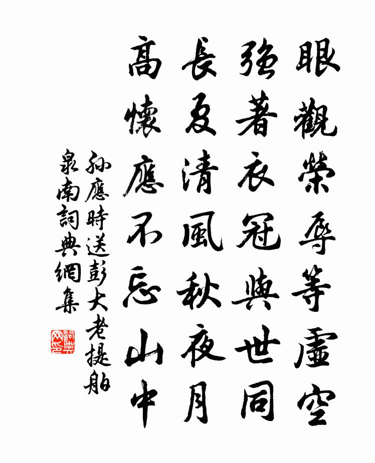 詩詞名句歷史字典書法欣賞書法字典國語詞典說文解字康熙字典古漢語字典標 題 作 者 詩 句 送彭大老提舶泉南作者:孫應時 朝代:宋代送彭大老提舶泉南原文眼觀榮辱等虛空,強著衣冠與世同。長夏清風秋夜月,高懷應不忘山中。詩詞問答問:送彭大老提舶泉南的作者是誰?答:孫應時問:送彭大老提舶泉南寫於哪個朝代?答:宋代孫應時送彭大老提舶泉南書法欣賞送彭大老提舶泉南書法作品詩詞推薦聖人之孝十首孟子林同〔宋代〕如何年稍長,汲汲子思師。知是為兒日,三遷感母慈。九日登堯山書事夏竦〔宋代〕滿頭 * 鬢毛斑,曾議皇王對爾顏。今日臨風輕霸跡,堯山應合勝牛山。送胡仲方二首項安世〔宋代〕鄧林擢乾皆楩梓,丹穴生雛即鳳凰。年少一來無比並,老翁千歲有輝光。幕中潤澤江湖遠,筆下才情錦繡張。未必徐審知置酒會者三人以為此春酒以介眉壽分韻趙蕃〔宋代〕餓死因細腰,半額由廣眉。是知風化速,有類形影移。時人走功名,我輩陳詩書。雖病勿是疚,雖貧勿自悲。和答魏道輔寄懷十首黃庭堅〔宋代〕雷行萬物春,天震而地撼。閉塞成冬冰,楚越自肝膽。貂狐諒柔溫,藜藿自羹糝。相思牛羊下,城鼓寒紞紞。雜興陸游〔宋代〕靈府寧容一物侵?此身只合老山林。何由挽得銀河水,淨洗群生忿欲心?連州斛嶺寨井鄭俠〔宋代〕斛嶺寨,行雲際,下視長江入地底。汲江登嶺行三里,躋扳峻險為艱爾。將率居民幾半千,度歲終年苦無水。爰自與諸客攜酒尋去年梅花有感白居易〔唐代〕馬上同攜今日杯,湖邊共覓去春梅。年年只是人空老,處處何曾花不開。詩思又牽吟詠發,酒酣閒喚管弦來。樽前春晚書懷二首奉簡陳益之陳傅良〔宋代〕百舌喜太甚,杜鵑恨何深。睍睆斯黃鸝,律中宮之音。物情自不齊,天運初無心。道人獨領會,杖藜立芳陰。梅溪鋪翁賜坡〔宋代〕村北村南春水,山前山後人家。夜來何處飛雨,流出碧桃數花。題龍池山人施肩吾〔唐代〕主人家在龍池側,水中有魚不敢食。終朝採藥供仙廚,卻笑桃花少顏色。六一泉徐集孫〔宋代〕惠勤已蛻老歐仙,物逐人非井便乾。不是坡翁重到此,此泉安得到今寒。漢江行次韓偓〔唐代〕村寺雖深已暗知,幡竿殘日迥依依。沙頭有廟青林合,驛步無人白鳥飛。牧笛自由隨草遠,漁歌得意扣舷歸。竹園浣溪沙 次韻禮院孟子周僉院秋夜曲二疊虞集〔元代〕天闊秋高 * 長。浮塵消盡霧蒼茫。澄澄孤月轉危牆。金井有聲惟墜露,玉階無色乍疑霜。不聞人語只吟*。過包尊師山院劉長卿〔唐代〕賣藥曾相識, * 此復聞。杏花誰是主,桂樹獨留君。漱玉臨丹井,圍棋訪白雲。道經今為寫,不慮惜鵝群。送春長句呈李泰伯祖無擇〔宋代〕盡日臨風把酒巵,宜春台上送春歸。已看綠樹陰陰靜,猶有殘花帖帖飛。歲月任從隨手過,功名未必與心違。我緣隴西諺佚名〔唐代〕郎驅女驅,十馬九駒。安陽大角,十牛九犢。送穆寂赴舉皎然〔唐代〕天子錫玄纁,傾山禮隱淪。君拋青霞去,榮資觀國賓。劍光既陸離,瓊彩何璘玢。夙駕別情遠,商弦秋意新。冥冥偈頌一百零二首釋慧遠〔宋代〕當年四月初八,老胡舊病再發。雲門遇水脫鞵,且莫隨佗孟八。九龍吐水沫金軀,七步周行總不如。稽首歸依乾屎予元豐戊午歲自楚至宋由柘城至福昌年二十有張耒〔宋代〕宋玉台前官樹林,十年孤客獨沾襟。白頭青鬢隔存歿,落日斷霞無古今。暮雲梁苑雁鶩暗,久泛吳船江海深。閱世名句推薦衰柳寒蟬一片愁,誰肯教白衣送酒?盧摯《沉醉東風·重九》 今日獨來香徑里,更無人跡有苔錢。韓偓《寒食日重遊李氏園亭有懷》 憂勞可以興國,逸豫可以亡身歐陽修《伶官傳序》 不系雕鞍門前柳,玉容寂寞見花羞,冷風兒吹雨黃昏後。喬吉《春閨怨·不系雕鞍門前柳》 驚回千里夢,已三更。起來獨自繞階行。岳飛《小重山·昨夜寒蛩不住鳴》 松江上,念故人老矣,甘臥閒雲。吳文英《沁園春·送翁賓暘游鄂渚》 不論平地與山尖,無限風光盡被占羅隱《蜂》 祁祁傷豳歌,萋萋感楚吟謝靈運《登池上樓》 蟲有虺者,一身兩口,爭食相齕遂相殺也,人臣之爭事而亡其國者,皆虺類也。韓非及後人《韓非子·說林下》 是非成敗轉頭空。楊慎《臨江仙·滾滾長江東逝水》