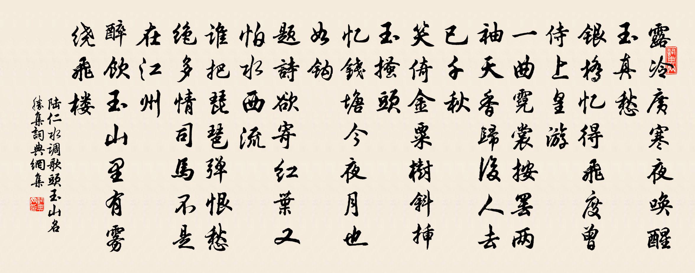 詩詞名句歷史字典書法欣賞書法字典國語詞典說文解字康熙字典古漢語字典標 題 作 者 詩 句 水調歌頭 玉山名勝集作者:陸仁 朝代:元代水調歌頭 玉山名勝集原文露冷廣寒夜,喚醒玉真愁。銀橋憶得飛度,曾侍上皇游。一曲霓裳按罷,兩袖天香歸後,人去已千秋。笑倚金粟樹,斜插玉搔頭。憶錢塘,今夜月,也如鉤。題詩欲寄紅葉,又怕水西流。誰把琵琶彈恨,愁絕多情司馬,不是在江州。醉飲玉山里,有霧繞飛樓。詩詞問答問:水調歌頭 玉山名勝集的作者是誰?答:陸仁問:水調歌頭 玉山名勝集寫於哪個朝代?答:元代問:水調歌頭 玉山名勝集是什麼體裁?答:詞陸仁水調歌頭 玉山名勝集書法欣賞水調歌頭 玉山名勝集書法作品詩詞推薦送子野歐陽修〔宋代〕四時慘舒不可調,冬夏寒暑易鬱陶。春陽著物大軟媚,獨有秋節最勁豪。金方堅剛屏炎瘴,兌氣高爽清風飈。煙霞早行馮時行〔宋代〕馬入寒林驚宿鴉,羸僮呵手怯霜華。已經殘月路數里,知這安眠人幾家。嚦嚦曉鳥天外唱,疏疏煙樹嶺頭斜。前程偶作二首趙蕃〔宋代〕舊箑已成揮,還披御臘衣。乘除因人事,變化亦天機。道路飄零久,形容少壯非。無徒微祿眷,長與故人違。宴清都曹勛〔宋代〕野水澄空,遠山隨眼,筍輿乘興廬阜。天池最極,雲溪最隱,翠迷歸路。三峽兩龍翔翥。盡半月、猶貪杖屨。閒引後赤壁賦蘇軾〔宋代〕是歲十月之望,步自雪堂,將歸於臨皋。二客從予過黃泥之坂。霜露既降,木葉盡脫, 人影在地,仰見明月,顧梅花十絕追和張文潛韻王之道〔宋代〕花前願步濺狂瀾,花外扶疏竹數竿。帶雪精神清更好,冰肌元慣朔風寒。偈頌二十九首釋雲〔宋代〕支提山里作上元,若校諸方真箇異。大蟲舌上打鞦韆,蟭螟眼裡放夜市。燈籠倒退舞三台,露柱趨前弄鱉鼻。可惜白玉蟾〔宋代〕人間何似神霄府,我今面目蒙塵土。年來無夢到神霄,一度傷懷淚如雨。風前無奈倚欄乾,雪裡不堪聞杜宇。此情午飯高橋院李流謙〔宋代〕招提下馬憩逡巡,野飯親烹澗底芹。二月韶華聽啼鳥,百年心事信行雲。不禁烈日花光薄,更抹微菸草色薰。老衲前後植木犀樓上月台盡見諸山張鎡〔宋代〕盛世適親逢,樓台等地雄。無形兼有象,俱在太和中。賢者之孝二百四十首齊侯無野林同〔宋代〕我母亦君母,吾翁即君翁。分羹何太忍,請質可堪從。挽陸運使詩項安世〔宋代〕八秩公何憾,淋浪我自悲。向來淮士里,最得阜陵知。故國人誰識,長身帝所思。竟隨龍馭去,應赴白雲期。和吳夢授韻王炎〔宋代〕卷舒有道在隨時,隱約何須感慨為。末路老夫甘退縮,華途吾友尚驅馳。準繩行義當趨正,淘練文章自出奇。舉世送任壽朋赴襄陽令項安世〔宋代〕潭心山頂碑何在,鳳翥龍翔夢亦非。野鍤狼煙參井畝,城開雁坡入江圻。蟠胸橐帙千年當,手到雞鋒一映微。應待送韓進鄆州寧親司馬光〔宋代〕車馬儼何之,東岡舊有陂。三年別親意,千里達家時。去仕元戎幕,來為太學師。寧須負斗米,不復斷機絲。物色句王大受〔宋代〕江平不見灘。月岩陳宓〔宋代〕常時百步馬先疲,今日岩前故不遲。回首兔宮猶未遠,會須千里巧相隨。卜運算元蔡伸〔宋代〕玉斧斫冰輪,中有乘鸞女。鬢亂釵橫襟袖涼,只恐輕飛舉。青冥縹緲間,自有 * 侶。不向巫山十二峰,朝暮為雲又三首范祖禹〔宋代〕能助君成聖,惟知練必從。徽音推二後,盛治見三宗。虛扆翔丹鳳,仙輴駕玉龍。淒涼厚陵路,墓木拱高峰。憶事吳融〔唐代〕去年花下把金卮,曾賦楊花數句詩。回首朱門閉荒草,如今愁到牡丹時。名句推薦過頭飯好吃,過頭話難聽!佚名《增廣賢文·下集》 倚高寒、愁生故國,氣吞驕虜。張元乾《賀新郎·寄李伯紀丞相》 綠蓑江上秋聞笛,紅袖樓頭夜倚欄。曹雪芹《香菱詠月·其三》 海風吹不斷,江月照還空。李白《望廬山瀑布水二首》 中軍置酒飲歸客,胡琴琵琶與羌笛。岑參《白雪歌送武判官歸京》 屈指數春來,彈指驚春去。高觀國《卜運算元·泛西湖坐間寅齋同賦》 一寸相思一寸灰。蘇軾《南鄉子·集句》 君子成人之美,不成人之惡;小人反是。孔子弟子《論語·顏淵篇》 內不失真,而外不殊俗王通《中說·卷六·禮樂篇》 雲中誰寄錦書來,雁字回時,月滿西樓。李清照《一剪梅·紅藕香殘玉簟秋》