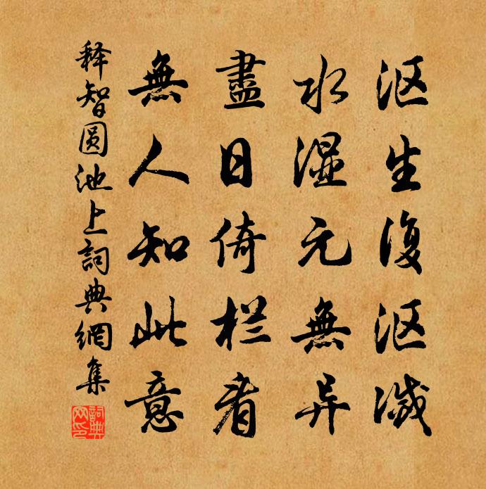 詩詞名句歷史字典書法欣賞書法字典國語詞典說文解字康熙字典古漢語字典標 題 作 者 詩 句 池上作者:釋智圓 朝代:宋代池上原文漚生復漚滅,水濕元無異。盡日倚欄看,無人知此意。詩詞問答問:池上的作者是誰?答:釋智圓問:池上寫於哪個朝代?答:宋代釋智圓池上書法欣賞池上書法作品詩詞推薦贈白蓮社主圓淨大師釋智圓〔宋代〕社客盡卿相,草堂雲樹間。景分廬岳秀,人類遠公閒。夜定開明月,秋吟對暮山。唯應謝康樂,時得扣松關。春周垕〔宋代〕不論山顛與水涯,春來何處不榮華。野紅妖綠渾如畫,一崦人家桃杏花。次韻太守向公登樓眺望二首秦觀〔宋代〕庖煙起處認孤村,天色清寒不見痕。車輞湖邊梅濺淚,壺公祠畔月銷魂。封強儘是春秋國,廟食多懷將相恩。試問關山月顧非熊〔唐代〕海上清光發,邊營照轉淒。深閨此宵夢,帶月過遼西。次韻李校書雨中至四聖觀三絕句項安世〔宋代〕花片灑行廓,苔痕上赭牆。阜陵游幸處,花草亦悲涼。水龍吟(巽吾賦溪南海棠,花下有相憶之句讀之不可為懷和韻並述江東旅行)劉辰翁〔宋代〕征衫春雨縱橫,何曾濕得飛花透。知君念我,溪南徙倚,誰家紅袖。藉草成眠,簪花倚醉,狂歌扶手。嘆故人何處如夢令佚名〔宋代〕韻似江梅標緻。美似江梅多麗。清似臘梅香,白似雪梅香膩,非是。非是。我道梅花似你。宿鱸風亭李洪〔宋代〕暫解塵纓鎖與韁,鱸風秋色似鱸鄉。從今第四橋南去,蟹籪漁磯屬漫郎。過九疑馬大同〔宋代〕人與韶音渺莫聞,山如羽衛自森森。不封不樹知何處,漫說零陵古到今。相和歌辭。烏夜啼王建〔唐代〕庭樹烏,爾何不向別處棲?夜夜夜半當戶啼。家人把燭出洞戶,驚棲失群飛落樹。一飛直欲飛上天,回回不離舊棲西窗陸游〔宋代〕西窗偏受夕陽明,好事能來慰此情。看畫客無寒具手,論書僧有折釵評。姜宜山茗留閒啜,豉下湖蓴喜共烹。酒炙宣義池上劉得仁〔唐代〕修篁夾綠池,幽絮此中飛。何必青山遠,仍將白髮歸。鳥啼亦有恨,鷗習總無機。樹起秋風細,西林磬入微。攤破醜奴兒向滈〔宋代〕自笑好痴迷。只為俺、忒セ雛兒。近來都得傍人道,帖兒上面,言兒語子,那底都是虛脾。樓上等多時。兩地里、踏莎行 香頰啼痕沈禧〔元代〕朔雪砭肌,東風浹髓。不由中酒人憔悴。丁香暗結雨中愁,相思滴盡枝頭淚。恨積巫山,情隨湘水。斑斑點得殘妝用厚後弟強甫韻劉克莊〔宋代〕辭大叢林卓小庵,豈知捷徑在終南。狂歌不曉花十八,餓死休貪芧四三。漢有子云尤苦思,晉惟逸少不清談。君看道貴如愚釋重顯〔宋代〕雨過雲凝曉半開,數峰如畫碧崔嵬。空生不解岩中坐,惹得天花動地來。和鵝湖三先生韻蔡權〔宋代〕朱陸豪雄夙所欽,本仁祖義渾同心。高明頓足先登岸,邃密為山漸到岑。易簡支離爭誚切,禪關俗學互浮沉。撐眉贈趙崇侍御(一作贈趙常六韻)方乾〔唐代〕貴達合逢明聖日,風流又及少年時。才因出眾人皆嫉,勢欲摩霄自不知。正直早年聞苦節,從容此日見清規。卻教偈頌一百五十首釋心月〔宋代〕披牯牛皮,輥瞎驢隊。帶水拖泥,東倒西{左犭右屯}。黃梅七百無人會。寺閣司空圖〔唐代〕昔歲登臨未衰颯,不知何事愛傷情。今來攬鏡翻堪喜,亂後霜須長几莖。名句推薦尺之木必有節目,寸之玉必有瑕適。呂不韋《呂氏春秋·覽·離俗覽》 寒山吹笛喚春歸,遷客相看淚滿衣。李益《春夜聞笛》 倩何人喚取,紅巾翠袖,搵英雄淚!辛棄疾《水龍吟·登建康賞心亭》 好事不出門,壞事傳千里。佚名《增廣賢文·上集》 今春看又過,何日是歸年。杜甫《絕句二首》 梅須遜雪三分白,雪卻輸梅一段香。盧鉞《雪梅·其一》 小桃灼灼柳鬖鬖,春色滿江南。黃庭堅《訴衷情·小桃灼灼柳鬖鬖》 愁里高歌梁父吟,猶如金玉戛商音。鄭思肖《二礪》 勢有不可得,事有不可成。韓非及後人《韓非子·觀行》 妖嬈艷態,妒風笑月,長殢東君。李清照《慶清朝·禁幄低張》