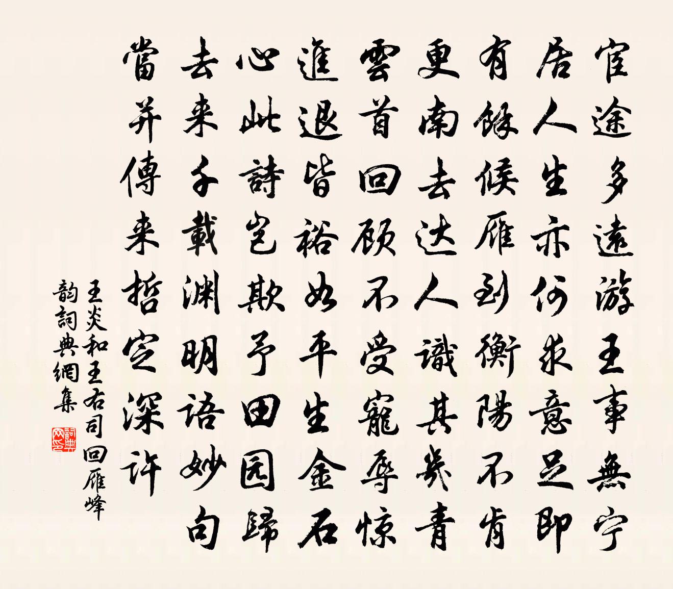 詩詞名句歷史字典書法欣賞書法字典國語詞典說文解字康熙字典古漢語字典標 題 作 者 詩 句 和王右司回雁峰韻作者:王炎 朝代:宋代和王右司回雁峰韻原文宦途多遠遊,王事無寧居。人生亦何求,意足即有餘。候雁到衡陽,不肯更南去。達人識其幾,青雲首回顧。不受寵辱驚,進退皆裕如。平生金石心,此詩豈欺予。田園歸去來,千載淵明語。妙句當並傳,來哲定深許。詩詞問答問:和王右司回雁峰韻的作者是誰?答:王炎問:和王右司回雁峰韻寫於哪個朝代?答:宋代王炎和王右司回雁峰韻書法欣賞和王右司回雁峰韻書法作品詩詞推薦獨坐吟邵雍〔宋代〕天告自丁寧,人多不肯聽。四時皆有景,萬物豈無情。禍福眼前事,是非身後名。誰能事閒氣,浪與世人爭。句孫升〔宋代〕慈竹筍抽疑夏籜,木犀花發認春香。再和袁起岩韻楊萬里〔宋代〕一歲驩聲沸此宵,遊人麗服正飄飄。病夫未暇磚引玉,惡語翻成李報瑤。天遣素娥提雪月,江涵公子更風標。君家題王憲使滄浪閣劉植〔宋代〕城池浸空碧,鑒影復觀心。孺子去何在,此歌傳至今。一奩涼月白,萬井市聲沉。坎止寧勞問,憑欄意獨深。湖南雪中留別戎昱〔唐代〕草草還草草,湖東別離早。何處愁 * ,歸鞍雪中道。出門迷轍跡,雲水白浩浩。明日武陵西,相思鬢堪老。鷓鴣天佚名〔宋代〕九陌遊人起暗塵。一天燈霧鎖彤雲。瑤台雪映無窮玉,閬苑花開不夜春。攢寶騎,簇雕輪。漢家宮闕五侯門。景陽曉霜過寶應縣三首楊萬里〔宋代〕落木枯林一夜蘇,枝枝節節糝瓊酥。看來忘卻臘前景,一色李花三月初。淳熙乙未登科是夏再中教官得綠紹興府教授秋項安世〔宋代〕五星高會記當年,笑語喧江夜不眠。今日江頭看獨往,人生聚散亦堪憐。宣州雜詩二十首梅堯臣〔宋代〕斫漆高崖畔,千筒不一盈。野糧收橡子,山屋點松明。只見樹堪種,曾無田可耕。兒孫何所樂,向此是平生。長安閒居白居易〔唐代〕風竹松煙晝掩關,意中長似在深山。無人不怪長安住,何獨朝朝暮暮閒?頌古一百則釋正覺〔宋代〕痴兒刻意止啼錢,良駟追風顧影鞭。雲掃長空巢月鶴,寒清入骨不成眠。和梁簽判潁州西湖十三題臨勝閣蘇頌〔宋代〕近郭溪流一衣帶,中流鳧嶼小蓬萊。西園勝事憑高盡,到者踟躕不忍回。催公靜碾茶黃庭堅〔宋代〕雪裡過門多惡客,春陰只惱有情人。睡魔正仰茶料理,急遣溪童碾玉塵。烈女秋陳普〔宋代〕陽台春夢逐浮雲,燈影西風獨閉門。一點清心霜六月,半簾紅葉雨黃昏。守符終古漸台水,墜血經今金谷園。何事偈頌一百一十七首釋紹曇〔宋代〕一點心燈,靈明炳煥。去古來今,清光無間。不同萬斛金蓮,惑亂痴人賞翫。今朝上元節,拈出普請看。擬方尋思浣溪沙晏幾道〔宋代〕團扇初隨碧簟收。畫檐歸燕尚遲留。靨朱眉翠喜清秋。風意未應迷狹路,燈痕猶自記高樓。露花菸葉與人愁。贈鼓琴文照大師劉發〔宋代〕寶琴何所得,所得甚幽微。聊借絲桐韻,還超智慧機。霜風悲玉軫,江月入珠徽。向此諸緣盡,人間孰是非。四聖贊釋師體〔宋代〕稽首普賢,不可思議。出頭露面,開言吐氣。拍盲擔板,忘恩斷義。事無寸長,熏天炙地。安晚先生送自贊太上感應篇帙首御題諸惡莫作陳起〔宋代〕稽首玄真像,當年助我軍。龜蛇裨聖武,龍鳳煥奎文。劍聳燒空焰,旗翻渡海雲。上公傳琬琰,分惠感慇勤。棲霞會飲諸僚曾惇〔宋代〕月近中秋好,風因小雨清。山眉煙處遠,江練夜深橫。我病自不飲,君詩俱有聲。放歌能取醉,不必喚嘉榮。名句推薦嫁女擇佳婿,毋索重聘;娶媳求淑女,勿計厚奩。朱柏廬《朱子家訓·全文》 一往情深深幾許?深山夕照深秋雨。納蘭性德《蝶戀花·出塞》 小不忍,則亂大謀。孔子弟子《論語·衛靈公篇》 冥冥寒食雨,客意向誰親?劉一止《冥冥寒食雨》 海風吹不斷,江月照還空。李白《望廬山瀑布水二首》 便做無情,莫也愁人苦朱淑真《蝶戀花·送春》 鳥宿池邊樹,僧敲月下門。賈島《題李凝幽居》 萬里無人收白骨,家家城下招魂葬。張籍《征婦怨》 睢睢而盱盱,而誰與居?大白若辱,盛德若不足。列子及其弟子《列子·黃帝》 渭北春天樹,江東日暮雲。杜甫《春日憶李白》