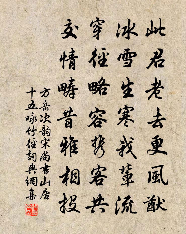 詩詞名句歷史字典書法欣賞書法字典國語詞典說文解字康熙字典古漢語字典標 題 作 者 詩 句 次韻宋尚書山居十五詠竹徑作者:方岳 朝代:宋代次韻宋尚書山居十五詠竹徑原文此君老去更風猷,冰雪生寒我輩流。穿徑略容攜客共,交情疇昔雅相投。詩詞問答問:次韻宋尚書山居十五詠竹徑的作者是誰?答:方岳問:次韻宋尚書山居十五詠竹徑寫於哪個朝代?答:宋代方岳次韻宋尚書山居十五詠竹徑書法欣賞次韻宋尚書山居十五詠竹徑書法作品詩詞推薦觀冷泉亭放水樓鑰〔宋代〕冷泉淺濁使人愁,開放黃波去不休。岸側細泉穿亂石,始知別是一清流。瓦亭聊句蘇舜元〔宋代〕陰霜策策風呼虓,羌賊膽開凶{左凶右炎}豪。赤膠脆折乳馬健,漢野秋穟黃雲高。驅先老尩伏壯黠,裹以山壑鬼訓子詹初〔宋代〕呼爾群兒,示爾兒知。儉則本立,學則智資。時逐勿逐,古聖是規。守道安貧,我所慕思。競勢趨豪,我心實悲。郭氏山林十六詠笙鶴亭陸游〔宋代〕茲山多異域,飛仙亦稅駕。勿遣俗客來,恐妨笙鶴下。次韻書事朱翌〔宋代〕西風昨夜入庭梧,況味今年似舊事。想見防秋有長策,幽人真欲反吾廬。溪上謠林曾〔宋代〕溪翁兒女枕溪住,時把釣竿倚芳樹。沉吟獨坐忍傷心,釣得魚來放將去。蠅虎陳師道〔宋代〕物微趣下世不數,隨力捕生得稱虎。匿形注目搖雨股,卒然一擊勢莫御。十中失一 * 取,吻間流血腹如鼓。郤行關山月徐陵〔南北朝〕關山三五月,客子憶秦川。思婦高樓上,當窗應未眠。星旗映疏勒,雲陣上祁連。戰氣今如此,從軍復幾年?和漁具十絕牟巘五〔宋代〕輕圓兀其顛,不受暑雨厄。時將篷 * ,旋轉卷七澤。正月三日郊外馬上作強至〔宋代〕長日牽人事,新年散馬蹄。和風吹凍柳,殘雪點春泥。意愜境自勝,興來杯屢攜。徘徊羨飛鳥,曉逐野雲低。雨中花慢姬翼〔元代〕一點靈源,澄湛照徹,多生浩劫情塵。有不夜壺天風物,亘古仍存。踞閫玉麟哮吼,對床石女談論。海童微念,寥哀徐朝議恭人潘氏王之道〔宋代〕城見三千歲,人終八十春。從夫安樂近,拜佛率陀新。婉孌書彤管,淒涼嘆棘薪。中郎有賢子,遺澤擢平津。松坡釋了惠〔宋代〕白頭棄鑊下煙扉,正是欣逢快便時。豈謂傍山根腳在,至今留得礙人枝。送襄州李觀察蘇頌〔宋代〕半符雙節鎮關東,漢沔從來地望雄。帕首諸侯趨道左,題襟群彥寄邦中。江魴鱠玉飧盤貴,霜橘堆金燕豆豐。心厭病後夏初雜書近況十首方回〔宋代〕今年春夏極窮忙,日檢醫書校藥方。甫得木瓜治膝腫,又須荊芥沐頭瘍。一生辛苦身多病,四至平和脈尚強。壽及桐廬方正父家藏唐翰林畫白芍藥予來領郡事因范仲淹〔宋代〕治亂興衰甚可嗟,徒憐水調訴榮華。開元盛事今何在,尚有霓裳寄此花。挽溪園周知郡王義山〔宋代〕記得年時試別頭,得君引我上瀛洲。當場獨步眇餘子,好手先拈第一籌。錦水曾尋香戟夢,洪崖去伴赤松游。瓣香和仲固春日村居即事十二絕胡寅〔宋代〕仙居何異武陵溪,泛出殘紅春水肥。擬欲泝流兼載酒,應容艇子傍苔磯。浣溪沙(聞王侍郎復命)洪皓〔宋代〕南北渝盟久未和。斯民塗炭死亡多。不知何日戢干戈。賴有興王如世祖,況聞謀帥得廉頗。藺卿全璧我蹉跎。送端州馮使君韓翃〔唐代〕白皙風流似有須,一門豪貴領蒼梧。三峰亭暗橘邊宿,八桂林香節下趨。玉樹群兒爭翠羽,金盤少妾揀明珠。懷君名句推薦翠華想像空山里,玉殿虛無野寺中。杜甫《詠懷古蹟五首·其四》 相思了無益,悔當初相見。朱彝尊《憶少年·飛花時節》 玉樓金闕慵歸去,且插梅花醉洛陽朱敦儒《鷓鴣天·西都作》 草綠裙腰山染黛,閒恨閒愁儂不解文廷式《天仙子·草綠裙腰山染黛》 雪雲散盡,放曉晴池院。楊柳於人便青眼。李元膺《洞仙歌·雪雲散盡》 但箭雁沈邊,梁燕無主。劉辰翁《蘭陵王·丙子送春》 謙尊而光,卑而不可逾,君子之終也。佚名《易傳·彖傳上·謙》 君子泰而不驕,小人驕而不泰。孔子弟子《論語·子路篇》 九日登高處,群山入望賒。趙時春《原州九日》 醉不成歡慘將別,別時茫茫江浸月。白居易《琵琶行 / 琵琶引》