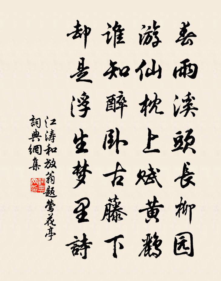 詩詞名句歷史字典書法欣賞書法字典國語詞典說文解字康熙字典古漢語字典標 題 作 者 詩 句 和放翁題鶯花亭作者:江濤 朝代:宋代和放翁題鶯花亭原文春雨溪頭長柳園,遊仙枕上賦黃鸝。誰知醉臥古藤下,卻是浮生夢裡詩。詩詞問答問:和放翁題鶯花亭的作者是誰?答:江濤問:和放翁題鶯花亭寫於哪個朝代?答:宋代江濤和放翁題鶯花亭書法欣賞和放翁題鶯花亭書法作品詩詞推薦次韻答元素蘇軾〔宋代〕不愁春盡絮隨風,但喜丹砂入頰紅。流落天涯先有讖,摩挲金秋會當同。蘧蘧未必都非夢,了了方知不落空。莫把城隍廟賽雨二首羊士諤〔唐代〕零雨慰斯人,齋心薦綠蘋。山風簫鼓響,如祭敬亭神。積潤通千里,推誠尊一卮。回飆經畫壁,忽似偃雲旗。浣溪沙王大簡〔宋代〕拂面涼生酒半醒。廉纖小雨晚初晴。過雲無定月虧盈。庭戶不關春悄悄,闌乾倚遍夜深深。幾迴風竹誤人聽。疏懶為四明何君賦林景熙〔宋代〕野意雲同散,閒門草自新。不知世網密,為謝客車頻。風月兼忘我,山林亦恕人。鹹陽歡黃犬,榮辱古為鄰。裘父見和複次韻曾協〔宋代〕郢質由來迥不同,曾當巧匠運斤風。肯過異縣尋痴叔,聊遣高談慰病翁。骯髒吾甘才苕霅,飛騰君合上昆蓬。祗今餘生方回〔宋代〕餘生如涸魚,斗水足可活。父子自相濡,不望江湖闊。使吾道當亨,時平己身達。運往年歲莫,滋厭耳根聒。與其嘉泰壬戍歸省墳墓感仲叔舊所惠詩及延慶堂夢姜特立〔宋代〕延慶堂中夢,人言積善家。翠娥環繞句,今日定如何。寄王岐賀鑄〔宋代〕未從名宦兩蹉跎,可但詩狂與酒魔。紫陌塵埃日馳逐,青樓燈火夜經過。當時豪縱年方少,今日疏慵病更多。唯見行香子 贈濱州小胡王處一〔元代〕有個真方。誰肯承當。聚煙霞、馥郁清涼。充盈法體,補益神光。定本根源,無生忍,返嘉祥。元氣充食,渴飲霞酬黃執禮見和胡寅〔宋代〕聞從軺車出,勤農不務夸。歡謠驅宿霧,飛蓋亂晨霞。醉偃風前草,詩裝錦上花。也將求二頃,輸稅補公家。頌古十首釋慧空〔宋代〕一箭射落天邊雁,千人萬人著眼看。不知此箭自何來,湖南長老何曾見。中書王舍人輞川舊居錢起〔唐代〕幾年家絕壑,滿徑種芳蘭。帶石買松貴,通溪漲水寬。誦經連谷響,吹律減雲寒。誰謂桃源里,天書問考槃。一從桓妒妻梅堯臣〔宋代〕昔聞桓司馬,娶妾貌甚都。其妻南郡主,悍妒誰與俱。持刀擁群婢,逕往將必屠。妾時在窗前,解鬟臨鏡梳。鬒髮輞川集二十首。文杏館裴迪〔唐代〕迢迢文杏館,躋攀日已屢。南嶺與北湖,前後復回顧。夜行船周密〔宋代〕寒菊欹風棲小蝶。簾櫳靜、半規涼月。夢不分明,恨無憑據,腸斷錦箋盈篋。哀角吹霜寒正怯。倚瑤箏、暗愁誰說和荀晉仲題法隆韻王之道〔宋代〕去來何所喜,一雨應澄清。憔悴有生理,嘆嗟成頌聲。酒壚從客醉,村畽問農耕。深得諏詢意,誰能繼此行。孫器之奉使淮浙至江為書見寄以詩謝之五首司馬光〔宋代〕岫貼晴天闊,舟緣石岸深。遙知作書處,纜裊綠波心。瑞鶴仙王吉昌〔元代〕衷情崇淡薄。盪浮萍、縱跡逐波淪落。聰明總不作。念掀天富貴,夢驚為錯。猛揮愛索。訪餘裕、真風綽綽。穀神癸巳十一月二十五辭家雪甚作愴然有懷利登〔宋代〕歲暮遊子歸,余始為行客。朔風萬里長,吹雪犯巾幘。臨行不言苦,不忍母心惻。乾坤迫短景,寒日易傾仄。冰池玉樓春石孝友〔宋代〕春生澤國芳菲早。樓外牆陰聞語笑。東君著意到西園,點破施朱渾未了。楚雲暮合吳天杳。天色沈沈雲擾擾。洞門名句推薦柴門聞犬吠,風雪夜歸人。劉長卿《逢雪宿芙蓉山主人》 君似孤云何處歸,我似離群雁。周紫芝《卜運算元·席上送王彥猷》 垓下美人泣楚歌,定陶美人泣楚舞,真龍亦鼠虎亦鼠。王象春《書項王廟壁》 紅燭背,繡簾垂,夢長君不知。溫庭筠《更漏子·柳絲長》 愁凝處,渺渺殘照紅斂吳文英《宴清都·秋感》 河水縈帶,群山糾紛。李華《弔古戰場文》 行到小溪深處,有黃鸝千百。秦觀《好事近·夢中作》 近者說,遠者來。孔子弟子《論語·子路篇》 那堪旅館經殘臘,只把空書寄故鄉。王建《維揚冬末寄幕中二從事》 稚子金盆脫曉冰,彩絲穿取當銀錚。楊萬里《稚子弄冰》