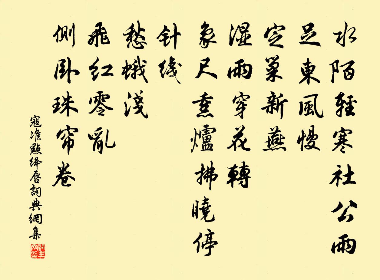 詩詞名句歷史字典書法欣賞書法字典國語詞典說文解字康熙字典古漢語字典標 題 作 者 詩 句 點絳唇作者:寇準 朝代:宋代點絳唇原文水陌輕寒,社公雨足東風慢。定巢新燕。濕雨穿花轉。象尺熏爐,拂曉停針線。愁蛾淺。飛紅零亂。側臥珠簾卷。詩詞問答問:點絳唇的作者是誰?答:寇準問:點絳唇寫於哪個朝代?答:宋代問:點絳唇是什麼體裁?答:詞問:寇準的名句有哪些?答:寇準名句大全寇準點絳唇書法欣賞點絳唇書法作品詩詞推薦梅花王安石〔宋代〕白玉堂前一樹梅,為誰零落為誰開。唯有春風最相惜,一年一度一歸來。德孺五丈和之字詩韻難而愈工輒復和成可發一黃庭堅〔宋代〕且然聊爾耳,得也自知之。獨笑真成夢,狂歌或似詩。照灘禽郭索,燒野得伊尼。早晚來同醉,僧窗臥虎皮。涵碧亭三首曹冠〔宋代〕杖藜乘興縱幽尋,野寺松篁藹翠陰。流水潺湲如有恨,白雲舒捲本無心。龍鍾誰識天津叟,高臥曾為梁甫吟。靜秦水龍吟慢/水龍吟佚名〔宋代〕玉皇金闕長春,民仰高天欣載。年年一度定佳期,風情多感慨。綺羅競交會。爭折花枝兩相對。舞袖翩翩歌聲妙,訪昭覺老陸游〔宋代〕久矣耆年罷送迎,喜聞革履下堂聲。游山笑我驀直去,過夏憐君太瘦生。庭際楠陰凝晝寂,牆頭鵲語報秋晴。功名題學公院池蓮李洞〔唐代〕竹引山泉玉甃池,栽蓮莫怪藕生絲。如何不似 * 客,坐對秋風待一枝。累日文符沓至悵然有感陸游〔宋代〕豪氣人言苦不除,固應屏跡向江湖。封侯萬里獨心在,餬口四方何事無?薄俗更堪開眼看,老翁寧辦折腰趨?鼠肝清夜辭十首白玉蟾〔宋代〕南山兮北隴,相對兮碧崔嵬。青松兮白石,暮煙兮猿哀。聞琵琶方響成才絕葛立方〔宋代〕赤鳥寶女眩新妝,九酘霞漿肯見觴。但聽琵琶喧啄木,誰知捍撥是龍香。喜春吟邵雍〔宋代〕春至已將詩探伺,春歸更用酒追尋。酒因春至春歸飲,詩為花開花謝吟。花謝花開詩屢作,春歸春至酒頻斟。情多念奴嬌趙善括〔宋代〕揚輝璧月,照層台縹緲,篷萊雲氣。玉宇清明仙語近,多少怨紅愁翠。問我殷勤,幾年塵土,依舊高標緻。廣寒別相和歌辭野田黃雀行僧貫休〔唐代〕高樹風多,吹爾巢落。深蒿葉暖,宜爾依薄。莫近鴟類,珠網亦惡。飲野田之清水,食野田之黃粟。深花中睡,土彈歌先秦無名〔先秦〕斷竹續竹。飛土逐宍。鴛鴦梅李龍高〔宋代〕莫是夷齊紀出身,又疑洛下見機雲。世人苦被風情累,也把妖名涴卻君。野步許棠〔唐代〕閒賞步易遠,野吟聲自高。路無人到跡,林有鶴遺毛。物外趣都別,塵中心枉勞。沿溪收墮果,坐石喚飢猱。喜雪二首吳潛〔宋代〕玄冥去歲失其官,今歲誰雲補過難。謝院撒鹽飛瑣瑣,隋堤翦帛散戈戈。檐儲宿肉喧山鵲,路沒遺蹤走野豻。管了更漏子馮延巳〔唐代〕風帶寒,枝正好,蘭蕙無端先老。情悄悄,夢依依,離人殊未歸。褰羅幕,憑朱閣,不獨堪悲搖落。月東出,雁南二疊劉克莊〔宋代〕漢魏諸賢韻已卑,六朝人物復何為。平生老子羞由徑,不識蟲兒與玉兒。在伯教授為考試之行不知其地漫成五詩送之趙蕃〔宋代〕峽州使君我所親,書去猶新報未聞。此士如今為第一,見之煩為致殷勤。玉汝贈永與冰蜜梨十顆梅堯臣〔宋代〕梨傳真定間,其甘曰如蜜。君得鹹陽中,味兼冰作質。遺之析朝酲,亦以蠲煩疾。吾兒勿多嗜,不比盤中栗。名句推薦飛錫離鄉久,寧親喜臘初。錢起《送外甥懷素上人歸鄉侍奉》 孝子之有深愛者,必有和氣;有和氣者,必有愉色;有愉色者,必有婉容。戴聖《禮記·祭義》 舊曲梅花唱,新正柏酒傳。孟浩然《歲除夜會樂城張少府宅》 黑雲翻墨未遮山,白雨跳珠亂入船。蘇軾《六月二十七日望湖樓醉書》 出南門即大海,一日兩潮,如萬丈銀堤破海而過。沈復《浮生六記·浪遊記快》 憶君心似西江水,日夜東流無歇時。魚玄機《江陵愁望寄子安》 運往無淹物,年逝覺已催。謝靈運《歲暮》 丹陽城南秋海陰,丹陽城北楚雲深。王昌齡《芙蓉樓送辛漸二首》 流水便隨春遠,行雲終與誰同。晏幾道《臨江仙·鬥草階前初見》 五原秋草綠,胡馬一何驕。李白《塞上曲》