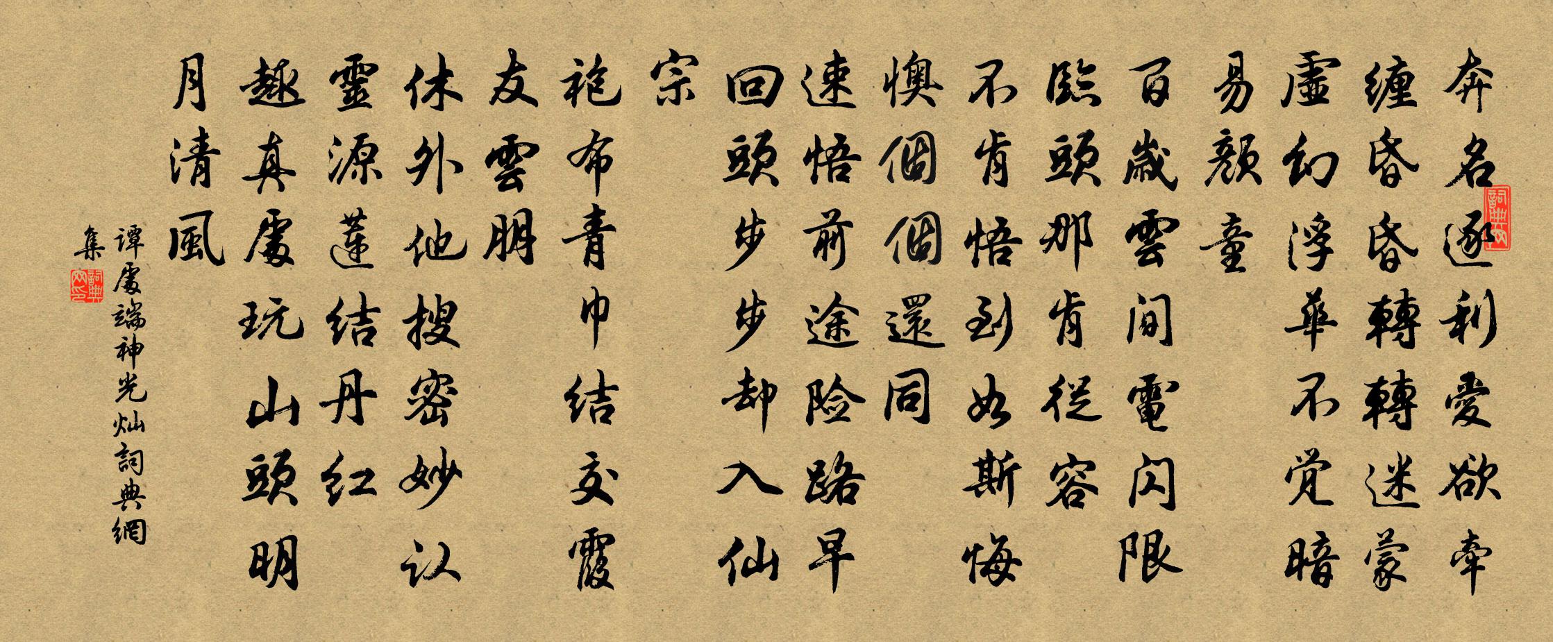 詩詞名句歷史字典書法欣賞書法字典國語詞典說文解字康熙字典古漢語字典標 題 作 者 詩 句 神光燦作者:譚處端 朝代:元代神光燦原文奔名逐利,愛1|1欲牽纏,昏昏轉轉迷濛。虛幻浮華,不覺暗易顏童。百歲雲間電閃,限臨頭、那肯從容。不肯悟,到如斯悔懊,個個還同。速悟前途險路,早回頭步步,卻入仙宗。袍布青巾,結交霞友雲朋。休外他搜密妙,認靈源、蓮結丹紅。趣真處,玩山頭明月清風。詩詞問答問:神光燦的作者是誰?答:譚處端問:神光燦寫於哪個朝代?答:元代問:神光燦是什麼體裁?答:詞譚處端神光燦書法欣賞神光燦書法作品詩詞推薦灸贅疣黃庶〔宋代〕贅疣在予手,累久至三四。初視君外物,於意不能置。居閒或灸灼,已沒出復繼。贅出與贅沒,曾莫生死異。天地鷓鴣天(席上作)范成大〔宋代〕樓觀青紅倚快晴。驚看陸地涌蓬瀛。南園花影笙歌地,東嶺松風鼓角聲。山繞水,水縈城。柳邊沙外古今情。坐中題龍隱岩方信孺〔宋代〕雨腳初收魚尾霞,滿溪流水半溪花。尋源曾識武陵洞,泛宅如浮苕水家。但得嵌空元有路,何如峭絕不容車。道人偈頌一百零二首釋紹曇〔宋代〕結夏已十日了也,寒山子作麽生。村詩吟落韻,竹管貯殘羹。結夏已十日了也,水牯牛作麽生。愛從荒草去,不向頌古二首釋彌光〔宋代〕生銕鑄就崑崙兒,頭輕腳重肚皮大。明眼衲僧薩普吒,九十日中看不破。看不破,笑倒嵩山破灶墮。三昧諸頌釋印肅〔宋代〕佛共眾生只此心,悟迷不間古同今。千名萬字何交涉,達法圓光許一針。江漢杜甫〔唐代〕江漢思歸客,乾坤一腐儒。片雲天共遠,永夜月同孤。落日心猶壯,秋風病欲疏。古來存老馬,不必取長途。題四畫釋善珍〔宋代〕桃花竹石鶴朝游,心憶平泉身海涯。化鶴歸來人不識,春風開盡碧桃花。正月二十八日避難至海陵從先流寓兄弟之招仍晁說之〔宋代〕脫身兵火欲何之,不料茲焉過所期。軒檻如僧縈橘柚,鄉關似夢識蒿藜。弟兄朋友談平昔,盜賊羌胡問幾時。共約春秋戰國門趙宣子周曇〔唐代〕門人曾不有提彌,連嗾呀呀孰敢支。臨難若教無苟免,亂朝爭那以獒為。絕句四首姚寬〔宋代〕一雨一風花欲零,在官在私蛙亂鳴。留春秋系金鴉腳,日日日斜樓上情。送歸使絕句七首羅公升〔宋代〕百年詩禮訓,惟彝仲容賢。慎勿如痴叔,膏明適自煎。水龍吟(重過舊隱)蔡伸〔宋代〕畫橋流水桃溪路,別是壺中佳致。南樓夜月,東窗疏雨,金蓮共醉。人靜迴廊,並肩攜手,玉芝香里。念紫簫聲斷酬齊上人強至〔宋代〕不見湯師久,病眠時序深。忽驚朱夏過,真負碧雲吟。他日虎溪約,同時鳳闕心。未論應去住,杖屨且相尋。送區弘南歸韓愈〔唐代〕穆昔南征軍不歸,蟲沙猿鶴伏以飛。洶洶洞庭莽翠微,九疑鑱天荒是非。野有象犀水貝璣,分散百寶人士稀。我遷偈頌二百零五首釋正覺〔宋代〕途中久客憶家山,一線蹊通入翠寒。望處霽雲收青練,跨門殘月墮金盤。十虛俱殞眼方闊,三世齊吞肚覺寬。變化仆所至,未嘗出遊。過長蘆,聞復禪師病甚,蘇軾〔宋代〕老去此生一訣,興來明日重遊。臥聞三老白事,半夜南風打頭。倚樓陸游〔宋代〕暮雲細細鱗千疊,新月纖纖玉一釣。嘆息化工真妙手,沖寒來倚水邊樓。十六觀經頌地觀第三釋遵式〔宋代〕琉璃寶地正觀時,諦了分明極樂國。八種清風鼓樂音,苦空無我無常曲。覓梅曾幾〔宋代〕欲尋梅去不禁寒,宜著書籤研滴間。聞道南坡開似雪,略分疏影到茶山。名句推薦盡做舊愁都忘卻,新愁何處著王庭筠《謁金門·雙喜鵲》 何處合成愁。吳文英《唐多令·惜別》 私勿與人,謀必辟。來俊臣《羅織經·治下卷第三》 浮生長恨歡娛少。宋祁《玉樓春·春景》 花無人戴,酒無人勸,醉也無人管。黃公紹《青玉案·年年社日停針線》 母欺子,子而不信其母,非以成教也。韓非及後人《韓非子·外儲說左上》 嗟萬事難忘,惟是輕別。周邦彥《浪淘沙慢·曉陰重》 瓊樓玉宇。分明不受人間暑。尋常豈是無三五。郭應祥《醉落魄·丙寅中秋》 忽憶故人天際去,計程今日到梁州。白居易《同李十一醉憶元九》 去年戰桑乾源,今年戰蔥河道。李白《戰城南》