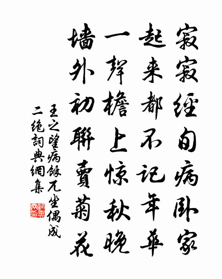 詩詞名句歷史字典書法欣賞書法字典國語詞典說文解字康熙字典古漢語字典標 題 作 者 詩 句 病餘兀坐偶成二絕作者:王之望 朝代:宋代病餘兀坐偶成二絕原文寂寂經旬病臥家,起來都不記年華。一聲檐上驚秋晚,牆外初聯賣菊花。詩詞問答問:病餘兀坐偶成二絕的作者是誰?答:王之望問:病餘兀坐偶成二絕寫於哪個朝代?答:宋代王之望病餘兀坐偶成二絕書法欣賞病餘兀坐偶成二絕書法作品詩詞推薦陳遺至孝劉義慶〔南北朝〕陳遺至孝。母好食鐺底焦飯,遺作郡主簿,恆裝一囊,每煮食,輒貯收焦飯,歸以遺母。後值孫恩掠郡,郡守袁山山陰作劉子翬〔宋代〕地勢東南盡,清江吳越分。修塗雜川陸,游役念良勤。相從二三子,心期同欣掀。逢幽不暫憩,何由解塵紛。抗跡次韻游龍門十絕洪咨夔〔宋代〕欲訪天池水發源,倒騎北斗挾飛仙。高低八節灘頭路,俯仰三生石上緣。雜曲歌辭。樂府顧況〔唐代〕暖谷春光至,宸游近甸榮。雲隨天仗轉,風入御簾輕。翠蓋浮佳氣,朱樓倚太清。朝臣冠劍退,宮女管弦迎。細草題所寓壁林昉〔宋代〕世路機關險似棋,未逢好著費支持。但能不作虧心事,何往非吾得意時。草著雨余青轉耐,發因閒裏白偏遲。一湖衡陽別妙喜老師釋了演〔宋代〕倒騎鐵馬渡瀟湘,澗草岩花不覆藏。回雁峰高親到頂,了無佛法可商量。七十九吟十首劉克莊〔宋代〕便有鳳從千仞下,更無虎守九重門。拔茅初喜仕途泰,起蕝乃知皇帝尊。早發橐皋王之道〔宋代〕春秋遺蹟舊山川,魯破吳亡久寂然。恰到前年征戰處,數間茅屋起炊煙。飲赴解試士友二首李昴英〔宋代〕少日諳場屋,斯文為細論。艱深成札闊,卑弱又西崑。與客為佳識,當年是解元。賀詩多辦取,盛事屬於門。桂枝香(過溧水感羊角哀左伯桃遺事)鞠華翁〔宋代〕丁丁起處。在縱牧九京,經燒殘樹。時見鳥鳶飢噪,鵂鶹妖呼。數間老屋團荒堵。算何人、瓣香來注。淡煙斜照,遣興袁枚〔清代〕愛好由來落筆難,一詩千改心始安。阿婆還是初笄女,頭未梳成不許看。劉生徐陵〔南北朝〕劉生殊倜儻。任俠遍京華。戚里驚鳴築。平陽吹怨笳。俗儒排左氏。新室忌漢家。高才被擯壓。自古共憐嗟。九日晁說之〔宋代〕日日無堪只歡嗟,誰教九日事豪華。寂寥難落方山帽,爛熳撫開野菊花。聞道鶴鸞趨鎬燕,忍將鴻雁聽邊笳。古來次韻酬率翁方岳〔宋代〕戍樓夢不到中州,杜牧新愁亦倦遊。留得荷鋤雙手在,山寒芋栗要人收。集杜工部句詠寒亭杜汪〔宋代〕湖南清絕地,長夏想為情。六月風日冷,炎天冰雪生。蓬萊如可到,心跡喜雙清。去郭軒楹敞,幽居不用名。至漢嘉簡李悅夫晁公溯〔宋代〕一別相望費歲時,盛山父老至今思。才高方朔三千牘,名配韋郎十二詩。論薦久聞章奏上,推遷獨怪璽書遲。少留鹽黃庚〔宋代〕同絺入貢載遺經,分賜群臣羨水晶,澗下作醎從海產,熬波出素似天成。享神潔白惟形似,富貴珍奇以寶名,此物晚寒題水仙花並湖山三首楊萬里〔宋代〕水仙怯暖愛清寒,兩日微暄嬾欲眠。料峭晚風人不會,留花且住伴詩仙。賀秘書歐陽巽齋先生遷居文天祥〔宋代〕先生挾冊當菑畲,不待辛勤有屋廬。宅樣只還齊里舊,鄉風好似潁川居。鏡湖今日賀外監,瀛館前年虞秘書。天下劉方平壁畫山皇甫冉〔唐代〕墨妙無前,性生筆先。回溪已失,遠嶂猶連。側徑樵客,長林野煙。青峰之外,何處雲天。名句推薦試澆橋下水,今夕到湘中。陳與義《臨江仙·高詠楚詞酬午日》 輕陰池館水平橋,一番弄雨花梢。陳子龍《畫堂春·雨中杏花》 諫爭輔拂之人,社稷之臣也,國君之寶也,明君之所尊厚也荀子《荀子·臣道》 綠葉兮素華,芳菲菲兮襲予;屈原《九歌》 一夜東風,枕邊吹散愁多少。曾允元《點絳唇·一夜東風》 晴雲滿戶團傾蓋,秋水浮階溜決渠。杜甫《柏學士茅屋》 紅橋路,正一派、畫船蕭鼓中流住。納蘭性德《摸魚兒·午日雨眺》 金風玉露一相逢,便勝卻人間無數。秦觀《鵲橋仙·纖雲弄巧》 細雨斜風作曉寒。淡煙疏柳媚晴灘。蘇軾《浣溪沙·元豐七年十二月二十四日從泗州劉倩叔游南山》 我居北海君南海,寄雁傳書謝不能。黃庭堅《寄黃幾復》