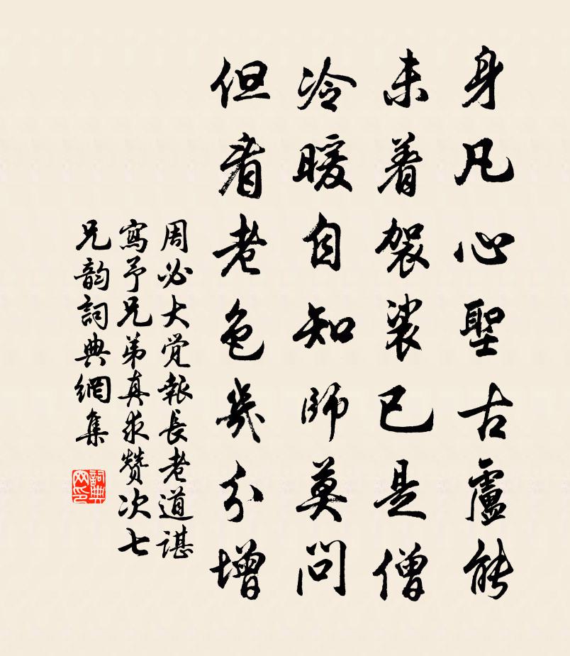 詩詞名句歷史字典書法欣賞書法字典國語詞典說文解字康熙字典古漢語字典標 題 作 者 詩 句 覺報長老道諶寫予兄弟真求贊次七兄韻作者:周必大 朝代:宋代原文身凡心聖古盧能,未著袈裟已是僧。冷暖自知師莫問,但看老色幾分增。詩詞問答問:《覺報長老道諶寫予兄弟真求贊次七兄韻》的作者是誰?答:周必大問:該詩寫於哪個朝代?答:宋代書法欣賞覺報長老道諶寫予兄弟真求贊次七兄韻書法作品詩詞推薦曾伯貢主簿輓詩二首楊萬里〔宋代〕我壯君初冠,相逢便定交。即今俱白首,赴告忽黃茅。人物王兼謝,詩聲島與郊。病來無氣力,不得奠蘭餚。於武原從送盧士舉皎然〔唐代〕落日獨歸客,空山匹馬嘶。蕭條古關外,岐路更東西。大澤雲寂寂,長亭雨淒淒。君還到湘水,寒夜滿猿啼。次韻方虛谷遷居邵桂子〔宋代〕家住千峰落照邊。移家三泖白鷗前。東鄰舊日秦侯隱,西路新巢銜叟還。當日釣游頻入夢,何事婚嫁送歸田。會須坐冰床至悅心殿乾隆〔清代〕筠沖錫宴有餘閒,瓊島韶光暖鏡間。尚可翠鸞輕舵試,徐過玉蝀一橋彎。凍酥岸覺看波漾,春到物知聽雁還。今日題水牯庵二首曾豐〔宋代〕堯自牽牛舜著鞭,雖勞未必適牛天。君今馴養犢成牯,飽臥太虛游自然。木蘭花慢楊子鹹〔宋代〕紫凋紅落後,忽十丈,玉虬橫。望眾綠幃中,藍田璞碎,鮫室珠傾。柔條系風無力,更不禁、連日峭寒清。空與蝶相和歌辭。班婕妤三首王維〔唐代〕玉窗螢影度,金殿人聲絕。秋夜守羅幃,孤燈耿不滅。宮殿生秋草,君王恩幸疏。那堪聞鳳吹,門外度金輿。怪來自湘赴廣道間雜詠古木李曾伯〔宋代〕古木列官道,春風老乾柯。炎涼知幾變,來往閱人多。減字木蘭花(公弼侄初授官,以此勸酒)葛勝仲〔宋代〕辛勤場屋。未遇知音甘陸陸。詔錄遺忠。一札天書下九重。鵝城初命。此去青雲應漸近。解褐恩新。今歲吾家第四湖州歌九十八首 其十一汪元量〔宋代〕昨夜三更淚濕腮,伍胥何事夢中來。三宮從此相分別,自勒潮頭白馬回。送僧賈島〔唐代〕大內曾持論,天南化俗行。舊房山雪在,春草岳陽生。曉了蓮經義,堪任寶蓋迎。王侯皆護法,何寺講鐘鳴。十月晦日作陸游〔宋代〕藤疏不覆架,桐落欲平溝。閏歲風霜晚,衰年日月遒。觀書方坐石,把釣又登舟。不是無羈束,閒人得自由。華清宮和杜舍人(一作張祜詩)趙嘏〔唐代〕五十年天子,離宮仰峻牆。登封時正泰,御宇日何長。上位先名實,中興事憲章。起戎輕甲冑,餘地復河湟。道帝李英才作墨梅於天慶觀壁袁說友〔宋代〕小折霜林半壁間,春風日日付毫端。秋高為借橫斜影,留與吾師歲晚看。賦雁史彌寧〔宋代〕雲慘胡天倦客程,西風失喜到江城。自傳屬國書來後,獵獵聲名動漢京。寒食日答李公擇三絕次韻蘇軾〔宋代〕從來蘇李得名雙,只恐全齊笑陋邦。詩似懸河供不辦,故欺張籍隴頭瀧。創木行馬廷鸞〔宋代〕矯首昂霄上,刳心泣露余。高門封植舊,暴客斧斤初。斲作有瑕玉,創為無用樗。終當宿威鳳,勿為汝欷歔。閔雨盧梅坡〔宋代〕百萬人家井水黃,江南大半田無秧。乖龍豈是為霖物,貪弄明珠簸日光。曉雨初霽陸游〔宋代〕曉來一雨洗塵痕,濃綠陰陰可一園。燕子聲中寂無事,獨穿苔徑出籬門。辛夷塢王維〔唐代〕木末芙蓉花,山中發紅萼。澗戶寂無人,紛紛開且落。名句推薦如何亡國恨,盡在大江東!屈大均《秣陵》 儉則傷事,侈則傷貨管仲《管子·乘馬》 誰憐散髻吹笙,天涯芳草關情。納蘭性德《清平樂·孤花片葉》 錦瑟無端五十弦,一弦一柱思華年。李商隱《錦瑟》 舊相思、偏供閒晝。吳文英《夜遊宮·春語鶯迷翠柳》 風裡落花誰是主?思悠悠。李璟《攤破浣溪沙·手卷真珠上玉鉤》 凡事謹守規模,必不大錯;一生但足衣食,便稱小康。王永彬《圍爐夜話·第五三則》 中池所以綠,待我泛紅光。沈約《詠芙蓉》 察己則可以知人,察今則可以知古。呂不韋《呂氏春秋·覽·慎大覽》 孟夏草木長,繞屋樹扶疏。陶淵明《讀山海經·其一》