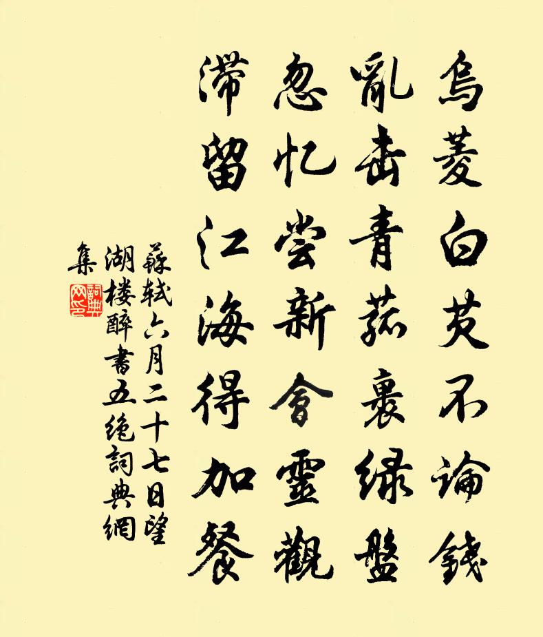 詩詞名句歷史字典書法欣賞書法字典國語詞典說文解字康熙字典古漢語字典標 題 作 者 詩 句 六月二十七日望湖樓醉書五絕作者:蘇軾 朝代:宋代原文烏菱白芡不論錢,亂擊青菰裹綠盤。忽憶嘗新會靈觀,滯留江海得加餐。詩詞問答問:《六月二十七日望湖樓醉書五絕》的作者是誰?答:蘇軾問:該詩寫於哪個朝代?答:宋代問:該詩是什麼體裁?答:七絕問:蘇軾的名句有哪些?答:蘇軾名句大全書法欣賞六月二十七日望湖樓醉書五絕書法作品譯文和注釋譯文湖裡生長的烏菱和白芡不用論錢,水中的雕胡米就像包裹在綠盤裡。忽然回憶起在會靈觀嘗食新谷之事,如要滯留在江海之上需多進飲食,保重身體啊。注釋烏菱:指老菱。菱角老則殼黑,故名。芡(qiàn):大型水生植物。青菰(gū):俗稱茭白。生於河邊、沼澤地。可作蔬菜。其實如米,稱雕胡米,可作飯。嘗新:古代於孟秋以新收穫的五穀祭祀祖先,然後嘗食新谷。標籤:西湖詩詞推薦西湖雜詠·春薛昂夫〔元代〕山光如淀,湖光如練,一步一個生綃面。叩逋仙,訪坡仙,揀西湖好處都游遍,管甚月明歸路遠。船,休放轉;杯念奴嬌·西湖雨感次素庵韻徐燦〔清代〕雨窗閒話,嘆浮生何必,是今非昨。幾遍青山酬對好,依舊黛眉當閣。灑道輪香,潤花杯滿,不似前秋惡。繡簾才浣溪沙·湖上朱橋響畫輪歐陽修〔宋代〕湖上朱橋響畫輪。溶溶春水浸春雲。碧琉璃滑淨無塵。當路遊絲縈醉客,隔花啼鳥喚行人。日斜歸去奈何春。錢塘湖春行白居易〔唐代〕孤山寺北賈亭西,水面初平雲腳低。幾處早鶯爭暖樹,誰家新燕啄春泥。亂花漸欲迷人眼,淺草才能沒馬蹄。最愛齊天樂 送童瓮天兵後歸杭詹玉〔宋代〕相逢喚醒京華夢,吳塵暗斑吟發。倚擔評花,認旗沽酒,歷歷行歌奇蹟。吹香弄碧。又坡柳風情,逋梅月色。畫鼓飲湖上初晴後雨二首·其一蘇軾〔宋代〕朝曦迎客艷重岡,晚雨留人入醉鄉。此意自佳君不會,一杯當屬水仙王。曉出淨慈寺送林子方楊萬里〔宋代〕畢竟西湖六月中,風光不與四時同。接天蓮葉無窮碧,映日荷花別樣紅。卜運算元·感舊蘇軾〔宋代〕蜀客到江南,長憶吳山好。吳蜀風流自古同,歸去應須早。還與去年人,共藉西湖草。莫惜尊前仔細看,應是容顏採桑子·輕舟短棹西湖好歐陽修〔宋代〕輕舟短棹西湖好,綠水逶迤,芳草長堤。隱隱笙歌處處隨。無風水面琉璃滑,不覺船移。微動漣漪,驚起沙禽掠岸高陽台 西湖春感張炎〔宋代〕接葉巢鶯,平波卷絮,斷橋斜日歸船。能幾番游,看花又是明年。東風且伴薔薇住,到薔薇、春已堪憐。更悽然。採桑子·天容水色西湖好歐陽修〔宋代〕天容水色西湖好,雲物俱鮮。鷗鷺閒眠,應慣尋常聽管弦。 風清月白偏宜夜,一片瓊田。誰羨驂鸞,人在舟中便小梁州·秋貫雲石〔元代〕芙蓉映水菊花黃,滿目秋光。枯荷葉底鷺鷥藏。金風盪,飄動桂枝香。〔麼〕雷峰塔畔登高望,見錢塘一派長江。春日西湖寄謝法曹歌歐陽修〔宋代〕西湖春色歸,春水綠於染。群芳爛不收,東風落如糝。參軍春思亂如雲,白髮題詩愁送春;遙知湖上一樽酒,能憶西湖雜詠·秋薛昂夫〔元代〕疏林紅葉,芙蓉將謝,天然妝點秋屏列。斷霞遮,夕陽斜,山腰閃出閒亭榭。分付畫船且慢者。歌,休唱徹;詩,西湖雜詠·夏薛昂夫〔元代〕晴雲輕漾,薰風無浪,開樽避暑爭相向。映湖光,逞新妝。 笙歌鼎沸南湖盪,今夜且休回畫舫。風,滿座涼;蓮長相思 游西湖康與之〔宋代〕南高峰,北高峰,一片湖光煙靄中。春來愁殺儂。郎意濃,妾意濃。油壁車輕郎馬驄,相逢九里松。醉太平·西湖尋夢王蘊章〔清代〕爐煙一窗,瓶花一床,更添十里湖光,對南屏晚妝。藕風氣香,竹風韻涼,等他月照迴廊,浴鴛鴦一雙。風入松·一春長費買花錢俞國寶〔宋代〕一春長費買花錢,日日醉湖邊。玉驄慣識西湖路,驕嘶過、沽酒樓前。紅杏香中簫鼓,綠楊影里鞦韆。(湖邊 一採桑子·群芳過後西湖好歐陽修〔宋代〕群芳過後西湖好,狼籍殘紅。飛絮濛濛。垂柳闌乾盡日風。笙歌散盡遊人去,始覺春空。垂下簾櫳。雙燕歸來細雨阮郎歸(西湖春暮)馬子嚴〔宋代〕清明寒食不多時。香紅漸漸稀。番騰妝束鬧蘇堤。留春春怎知。花褪雨,絮沾泥。凌波寸不移。三三兩兩叫船兒。名句推薦深澗飲渴虹,邃河生秋雷。惟鳳《姑射山詩題曾山人壁》 黃鶴樓前日欲低,漢陽城樹亂烏啼李夢陽《夏口夜泊別友人》 青苔滿階砌,白鳥故遲留。杜牧《題揚州禪智寺》 望天王降詔,早招安,心方足。宋江《滿江紅·喜遇重陽》 對飲食,勿揀擇。食適可,勿過則。李毓秀《弟子規·謹》 雲鎖嫩黃煙柳細,風吹紅蒂雪梅殘。閻選《八拍蠻·雲鎖嫩黃煙柳細》 世界微塵里,吾寧愛與憎。李商隱《北青蘿》 必得之事,不足賴也;必諾之言,不足信也。管仲《管子·形勢》 黯然銷魂者,唯別而已矣!江淹《別賦》 和大怨,必有餘怨;報怨以德,安可以為善?老子《老子·德經·第七十九章》