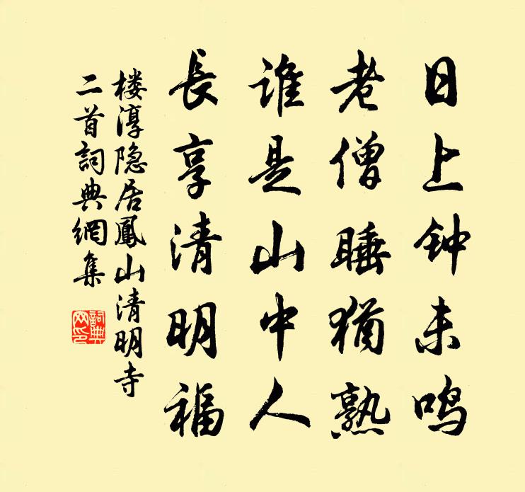 詩詞名句歷史字典書法欣賞書法字典國語詞典說文解字康熙字典古漢語字典標 題 作 者 詩 句 隱居鳳山清明寺二首作者:樓淳 朝代:宋代隱居鳳山清明寺二首原文日上鍾未鳴,老僧睡猶熟。誰是山中人,長享清明福。詩詞問答問:隱居鳳山清明寺二首的作者是誰?答:樓淳問:隱居鳳山清明寺二首寫於哪個朝代?答:宋代樓淳隱居鳳山清明寺二首書法欣賞隱居鳳山清明寺二首書法作品詩詞推薦釣魚硯倪德元〔宋代〕□□□□□□□,□□□□□□□。以文會友真足樂,寬我老懷自歲尤。盍簪況乃□□席,□□□□注黃流。□□登桂林宜樓和李帥柱間韻李曾伯〔宋代〕誰言南服遠王畿,面面青山總是詩。桂後梅前正清淑,倚樓但覺九秋宜。西軒雨中期象之夜話韓維〔宋代〕積雨空堂暮,清宵獨掩門。陳編徒自封,幽興欲何言。碧草生牆角,丹花發竹根。聊持靜者轍,一與道人論。和劉府判方逢辰〔宋代〕英雄牢落谷音空,敦薄猶存柳下風。善政有聲聞六邑,病射無自謁千峰。乾坤許大心知少,道義相交我輩同。珍重古劍強至〔宋代〕只因耕戰地,得此古龍泉。磨拭自今日,埋藏曾幾年。無將試蛟窟,宜待靜狼煙。寄語奸邪輩,當鋒莫向前。投秦太師王灼〔宋代〕今代堂堂有魏公,十方三際指揮中。勛名已恨古人隘,歌詠端知守筆窮。還第文饒槐蔽日,賭棋安石馬嘶風。此時齊天樂(壽謝丞)佚名〔宋代〕南牆槐竹風搖翠。歡聲為誰吹起。水秀龜神,松清鶴健,人在蓬壺深處。金猊噴霧。睹鬢雪青歸,臉霞紅駐。一點紹興祀九宮貴神十首佚名〔宋代〕均調大化,險驚下民。駿功有赫,誕舉明社。嘉觴中貳,執事惟寅。清明同矣,福祿攸臻。鷓鴣天晏幾道〔宋代〕梅蕊新妝桂葉眉,小蓮風韻出瑤池。雲隨綠水歌聲轉,雪繞紅綃舞袖垂。傷別易,恨歡遲,惜無紅錦為裁詩。行人詠白海棠曹雪芹〔清代〕秋容淺淡映重門,七節攢成雪滿盆。出浴太真冰作影,捧心西子玉為魂。曉風不散愁千點,宿雨還添淚一痕。獨倚答謝景山遺古瓦硯歌歐陽修〔宋代〕火數四百炎靈銷,誰其代者當塗高。窮奸極酷不易取,始知文章基扃牢。坐揮長喙啄天下,豪傑競起如蝟毛。董呂西遊鹹陽中詩陰鏗〔南北朝〕上林春色滿。鹹陽遊俠多。城斗疑連漢。橋星象跨河。影里看飛轂。塵前聽遠珂。還家何意晚。無處不經過。金丹詩四十八首張繼先〔宋代〕我身我命與天齊,只得金丹便出迷。靈質長來居玉殿,聖胎生就步雲梯。蜉蝣世界何須戀,螮蝀衣裳不必攜。烹煉筠溪八景詩谷岫陵雲陳著〔宋代〕毓秀山根插翠峰,如陵如阜起嶐嵷。堆高鹿苑沖銀漢,積擬鉅橋跨玉虹。斂厚難輸王廩粟,歲豐長守大夫松。乾坤登屋後城袁說友〔宋代〕笑傲愁如失,登臨酒半醒。故將雙眼碧,割斷半山青。土沃差宜竹,城高未著亭。可人東郭外,綃翠舞娉婷。寄題識山堂一首王阮〔宋代〕山體如如即我身,眼高才是箇中人。錦囊忽上玉樓去,誰復如化更識真。留守安撫司徒侍中生辰三首強至〔宋代〕宰衡倚賴更三聖,神器傳歸定兩朝。幾御銅符雙在手,尊榮金印六垂腰。流民相率歸仁政,疲俗新蒙罷橫徭。壽考下第別郜扶馬戴〔唐代〕窮途別故人,京洛泣風塵。在世即應老,他鄉又欲春。平生空志學,晚歲拙謀身。靜話歸休計,唯將海上親。余於沂流至安仁楊萬里〔宋代〕半篙新漲滿帆風,兩岸千山一抹中。慚愧棹郎能袖手,若非袖手更無功。唐昌觀玉蕊花王建〔唐代〕一樹籠:玉刻成,飄廊點地色輕輕。女冠夜覓香來處,唯見階前碎月明。名句推薦願為西南風,長逝入君懷。曹植《七哀詩》 千古興亡多少事?悠悠。不盡長江滾滾流。辛棄疾《南鄉子·登京口北固亭有懷》 君行四月草萋萋,柳花桃花半委泥。納蘭性德《送蓀友》 晨起開門雪滿山,雪晴雲淡日光寒。鄭燮《山中雪後》 函車之獸,離山必斃;絕波之鱗,宕流則枯。沈約《宋書·列傳·卷七十》 水溢芙蓉沼,花飛桃李蹊。薛道衡《昔昔鹽》 冷艷全欺雪,余香乍入衣。丘為《左掖梨花》 濁酒一杯家萬里,燕然未勒歸無計。范仲淹《漁家傲·秋思》 功過不宜少混,混則人懷惰隳之心洪應明《菜根譚·概論》 今夜送歸燈火冷,河塘,墮淚羊公卻姓楊。蘇軾《南鄉子·和楊元素時移守密州》