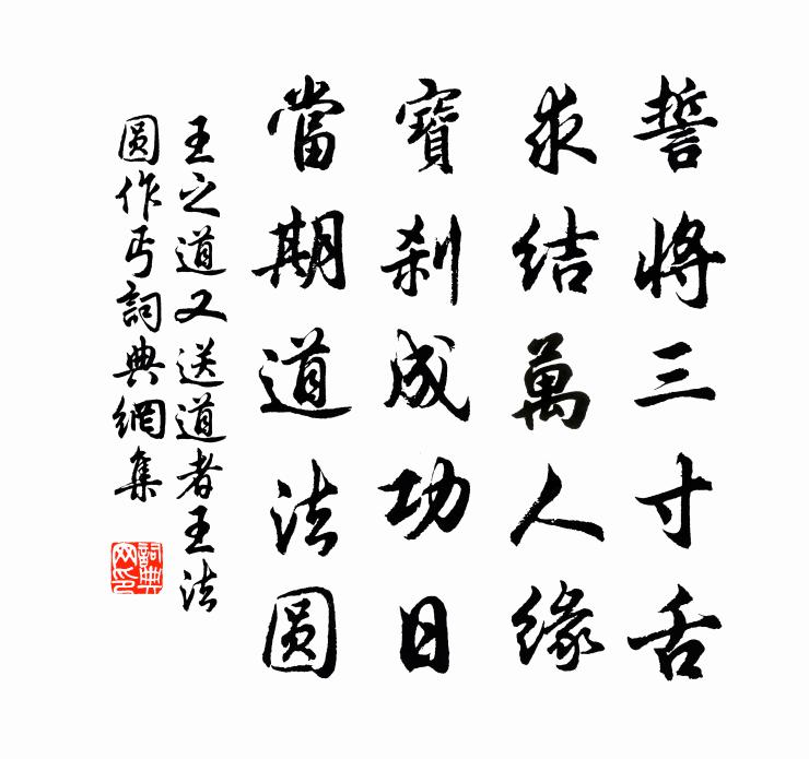詩詞名句歷史字典書法欣賞書法字典國語詞典說文解字康熙字典古漢語字典標 題 作 者 詩 句 又送道者王法圓作丐作者:王之道 朝代:宋代又送道者王法圓作丐原文誓將三寸舌,求結萬人緣。寶剎成功日,當期道法圓。詩詞問答問:又送道者王法圓作丐的作者是誰?答:王之道問:又送道者王法圓作丐寫於哪個朝代?答:宋代王之道又送道者王法圓作丐書法欣賞又送道者王法圓作丐書法作品詩詞推薦沅陵契丈用蕃將至辰州寄在伯兄韻作詩見屬用趙蕃〔宋代〕能事豈工刀與筆,閒情聊付詠而觴。生前憂累須陶寫,身後聲名盡在亡。北澗泛舟孟浩然〔唐代〕北澗流恆滿,浮舟觸處通。沿洄自有趣,何必五湖中。玄峰釋紹曇〔宋代〕極盡幽微裂萬差,天然鳥道絕安排。欲窮頂{左寧右頁}翻身句,妙密中防險崖。寄錢申伯二首張元乾〔宋代〕一點照今古,胸中殊瞭然。不妨為漫吏,可但號臞仙。為荔盟猶在,凝香句未傳。秋風稍涼冷,速辦下灘船。詠懷白居易〔唐代〕盡日松下坐,有時池畔行。行立與坐臥,中懷澹無營。不覺流年過,亦任白髮生。不為世所薄,安得遂閒情。送鄔傪之洪州覲兄弟皎然〔唐代〕年少足詩情,西江楚月清。書囊山翠濕,琴匣雪花輕。久別經離亂,新正憶弟兄。贈君題樂府,為是豫章行。清明日書事周文璞〔宋代〕蒼弁一如楚執珪,思想越吟身自低。澗水又如古智士,縱橫流轉多滑稽。雜花半開已倏落,如怨曠女離深閨。幽禽偈十三首釋慧空〔宋代〕祖師心印,堪作何用。無位真人,屎也不直。獨步青霄,徒夸好手。和泥合水,罕遇同流。蟾宮曲 夢中作鄭光祖〔元代〕敝裘塵土壓征鞍,鞭倦裊蘆花,弓箭蕭蕭,一逕入煙霞,動羈懷,西風禾黍,秋水蒹葭,千點萬點,老樹寒鴉,三逍遙詠宋太宗〔宋代〕隨緣心不見,性各本來真。惡事夸唇頰,愚痴似醉人。忙忙何物有,急急利名親。入定觀浮世,蒼生業感因。詠竹二首袁燮〔宋代〕去年種蒼玉,今歲抽華簪。初萌節已具,欲奮力未任。雷風驅急雨,滂沱三日霖。籜龍不許蟄,倏起騰深林。繞徑寄龔實之正言陸游〔宋代〕台省諸公歲歲新,平生敬慕獨斯人。山林不恨音塵遠,夢寐時容笑語親。學道皮膚雖脫落,憂時肝膽尚輪囷。至和子客崑山得薦嚴薦嚴長老時道人散朗開遠不敖陶孫〔宋代〕平生庾公塵,可涴通州泥。朅來海門上,日瘦氣慘淒。春風有相導,佚我以闥閨。前身定聞法,夢作三生猊。悟公禹穴錢公輔〔宋代〕一朵雲根壓眾嵐,古傳深坎自天鏨。藏書未必先王事,好怪惟聞太史探。洞府閒來何寂寞,龍髯垂處認{上髟下監雜詠十首方鳳〔宋代〕小哉蠻觸戰,鄙甚蛙黽怒。達人能大觀,本以和平故。偈頌六十五首釋普濟〔宋代〕不參禪,不問道。豎起鐵脊樑,死蛇鑽出劃。不是禪,不是道。雲門千歲僧,越山鼐長老。兩朱閣白居易〔唐代〕兩朱宮閣,南北宮相對起宮。借問何人家?貞元雙帝子。帝子 * 雙得仙,五雲飄搖飛上天。第宅亭台不將去,化過秦樓曾棟〔宋代〕曙色開晴,輕颸敷暖,日影才經檐角。倦來芳徑,且倚闌乾,觸地新愁粘著。長日如年,可堪恨雨絲絲,夢去漠漠小重山米友仁〔宋代〕雨過風來午暑清。榴花紅照眼,向人明。一枝低映寶釵橫。菖蒲酒,玉碗十分斟。引滿聽新聲。小軒簾半卷,遠山菊花盛開張埴〔宋代〕玉池吹醒芙蓉醉,回頭紅粉都無味。秋宮人去金錢飛,過我茅茨若相慰。起來采採為三嗅,猶是上天風露氣。餐英名句推薦秋到邊城角聲哀,烽火照高台。陸游《秋波媚·七月十六日晚登高興亭望長安南山》 河橋送人處,涼夜何其。周邦彥《夜飛鵲·河橋送人處》 嘶馬搖鞭何處去?曉禽霜滿樹。牛希濟《謁金門·秋已暮》 無功不賞,無罪不罰。荀子《荀子·王制》 食之以時,用之以禮。孟子《孟子·盡心章句上·第二十三節》 爽口物多終作疾,快心事過必為殃。馮夢龍《喻世明言·卷三》 鴛鴦俱是白頭時,江南渭北三千里。賀鑄《惜余春·急雨收春》 相見情已深,未語可知心。李白《相逢行二首》 明歲秋風知再會,暫時分手莫相思。曹雪芹《殘菊》 禍之所由生也,生自纖纖也。荀子《荀子·大略》