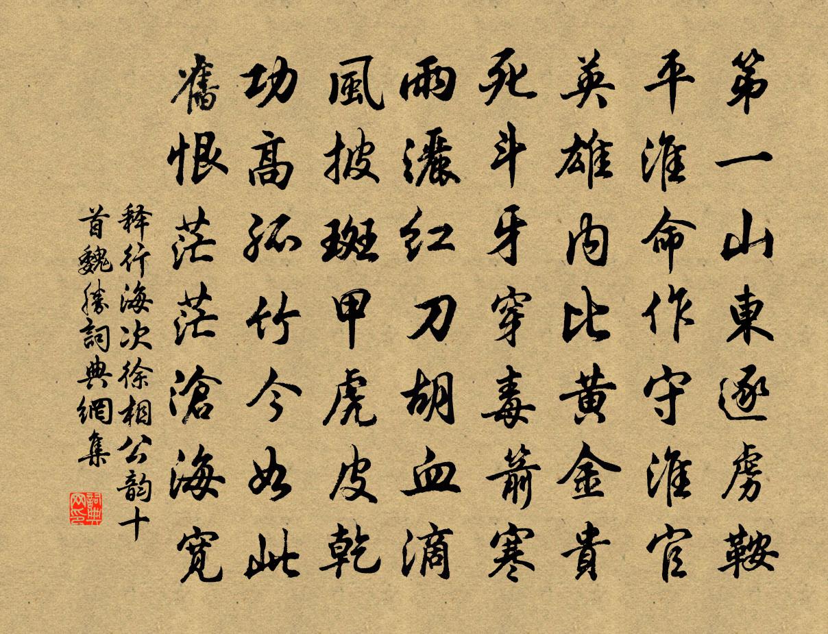 詩詞名句歷史字典書法欣賞書法字典國語詞典說文解字康熙字典古漢語字典標 題 作 者 詩 句 次徐相公韻十首魏勝作者:釋行海 朝代:宋代次徐相公韻十首魏勝原文第一山東逐虜鞍,平淮命作守淮官。英雄內比黃金貴,死斗牙穿毒箭寒。雨灑紅刀胡血滴,風披斑甲虎皮乾。功高孤竹今如此,舊恨茫茫滄海寬。詩詞問答問:次徐相公韻十首魏勝的作者是誰?答:釋行海問:次徐相公韻十首魏勝寫於哪個朝代?答:宋代釋行海次徐相公韻十首魏勝書法欣賞次徐相公韻十首魏勝書法作品詩詞推薦句許轂〔宋代〕一條碧水練鋪地,萬疊好山屏倚天。五更仇遠〔宋代〕杭城打六更,市樓已攢點。流年莫催人,老色將冉冉。入白水懷士特溫其劉子翬〔宋代〕曉山隨意開,夏氣含露澄。扶筇過巇嶮,飛仙亦凌兢。松濤淨可漱,嵐煙起如蒸。巨崿轉鼎鼎,危塍上層層。悠然曹溪陳岩〔宋代〕近水人家自是奇,水成灣處各開扉。波光一片青銅鏡,無數文禽照影飛。春秋戰國門顏叔子周曇〔唐代〕夜雨鄰娃告屋傾,一宵從寄念悲驚。誠知獨處從燒燭,君子行心要自明。從天平節度使游平流園曹鄴〔唐代〕池塘靜於寺,俗事不到眼。下馬如在山,令人忽疏散。明公有高思,到此遂長返。乘興挈一壺,折荷以為盞。入竹和程泰之閣學詠雪十二題飲雪袁說友〔宋代〕飲冰受命元非僻,齧雪充飢豈是狂。何似催班仙仗里,一堂均宴近臣觴。風涼原上作王昌齡〔唐代〕陰岑宿雲歸,煙霧濕松柏。風淒日初曉,下嶺望川澤。遠山無晦明,秋水千裏白。佳氣盤未央,聖人在凝碧。關門和宗易作屋之什陳傅良〔宋代〕欲因舊築倍勞形,昔在先生配二程。梅樹護持供北顧,萱堂潤色作東榮。但堪樽俎來三益,何必籓牆屏五兵。若徙贈法才師楊萬里〔宋代〕才公南華別,不見八年許。瓣香宗混融,隻眼半唐舉。聊將筍蕨觜,戲作冠劍語。天還在壺中,雲卻歸何處。愛女王邁〔宋代〕愛女有家後,沉痾未下床。問巫羞左道,市藥嘆空囊。攻悶三杯酒,祈安一瓣香。祠山訊息好,秋杪得還鄉。連日扶病領客殆不能支枕上懷故山偶成陸游〔宋代〕已強迂疏假印章,更扶衰病主杯觴。功名已判初心負,豪俠都無故態狂。靜覺此身猶外物,嬾思與世永相忘。清泉依韻奉酬慎思兄夜聽誦詩見詠之作張耒〔宋代〕昔遇晁公淮水東,士衡已聽語如鍾。五車講學知無敵,十載論文喜再逢。古匣劍光疑鬼泣,夜天虎嘯有風從。許侯送梵才上人歸天台吳育〔宋代〕幾年瓶缽帝城棲,看盡塵勞息盡機。詩妙偶因餘力到,名高卻與本心違。雲深路入千山去,歲晚身攜一錫歸。林下行旅鄭獬〔宋代〕卷衣上馬去駸駸,檐雨飄零楚客心。歸路漸驚紅葉老,舊山已落白雲深。莊鵬聊欲辭滄海,越鳥終須憶故林。初啟水調歌頭(遣懷)趙長卿〔宋代〕貪痴無了日,人事沒休期。白駒遇隙,百歲能得幾多時。自古腰金結綬,著意經營辛苦,回首不勝悲。名未能安穩折楊柳歌許虬〔清代〕居遼四十年,生兒十歲許。偶聽故鄉音,問爺此何語。臨川投贈黃彥平〔宋代〕今休昌黎伯,琳宮尚陸沉。極知延閣峻,仍記掖垣深。簡古元和樣,精微正始音。居然合廊廟,過聽著山林。讀史八首陳普〔宋代〕王莽當年似姬旦,煬皇前日肖曾參。擔囊揭篋何須逐,盜賊誰無仁義心。中梁山寺文同〔宋代〕台殿晻曖山嶕嶢,雲霞鮮明天泬寥。側身下望厭塵世,安得羽翼凌九宵。名句推薦有美一人,清揚婉兮。佚名《野有蔓草》 不肯畫堂朱戶,春風自在楊花。王安國《清平樂·春晚》 淒涼別後兩應同,最是不勝清怨月明中。納蘭性德《虞美人·曲闌深處重相見》 我有所念人,隔在遠遠鄉。白居易《夜雨》 殊方日落玄猿哭,舊國霜前白雁來。杜甫《九日五首·其一》 鞭個馬兒歸去也,心急馬行遲。辛棄疾《武陵春·走去走來三百里》 城門失火,殃及池魚。佚名《增廣賢文·上集》 始憐幽竹山窗下,不改清陰待我歸。錢起《晚春歸山居題窗前竹 / 暮春歸故山草堂詩》 鳳簫聲動,玉壺光轉,一夜魚龍舞。辛棄疾《青玉案·元夕》 救人須救急,施人須當厄。馮夢龍《醒世恆言·卷十》
