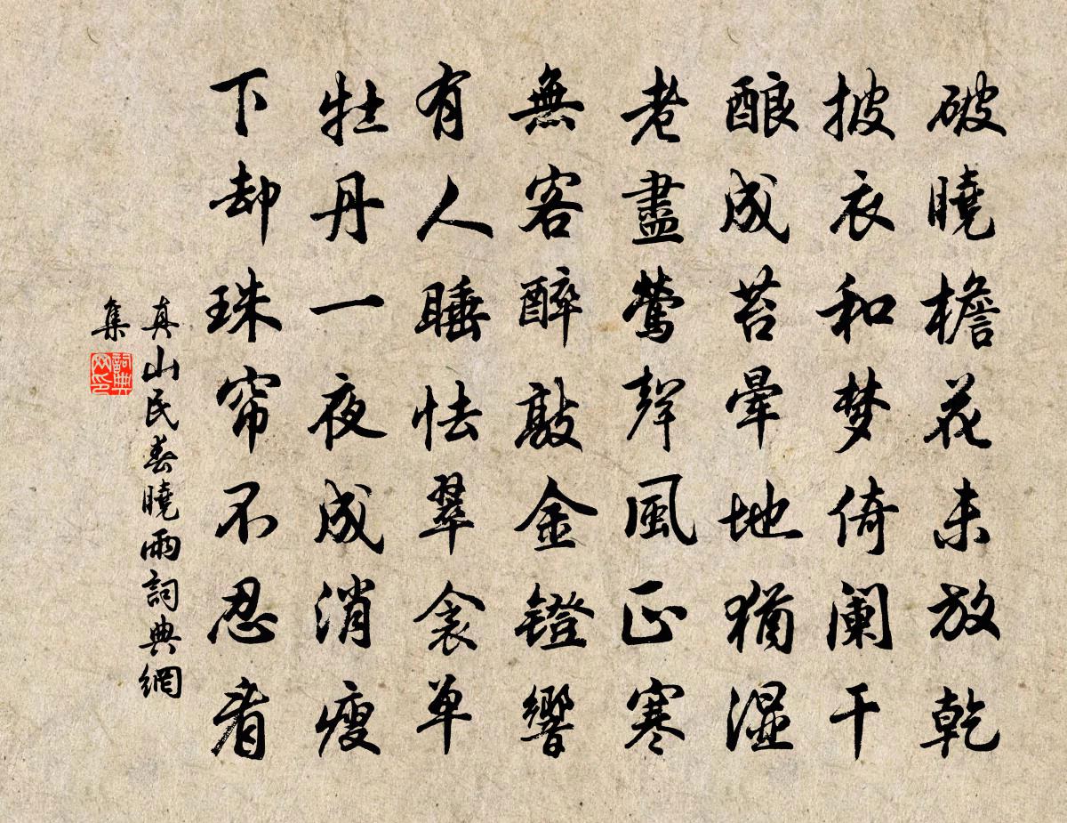 詩詞名句歷史字典書法欣賞書法字典國語詞典說文解字康熙字典古漢語字典標 題 作 者 詩 句 春曉雨作者:真山民 朝代:宋代春曉雨原文破曉檐花未放乾,披衣和夢倚闌乾。釀成苔暈地猶濕,老盡鶯聲風正寒。無客醉敲金鐙響,有人睡怯翠衾單。牡丹一夜成消瘦,下卻珠簾不忍看。詩詞問答問:春曉雨的作者是誰?答:真山民問:春曉雨寫於哪個朝代?答:宋代真山民春曉雨書法欣賞春曉雨書法作品詩詞推薦反舌釋文珦〔宋代〕毛羽誠無取,禽中號善鳴。能將一片舌,巧作百般聲。元是因風氣,曾非出性情。君看五月後,瘖默愧流鶯。贈石牛上人趙葵〔宋代〕萬里江山萬里天,疏鍾半夜落漁船。老來羨殺禪關客,一枕江聲抱月眠。踏莎行(送子權赴藤)朱敦儒〔宋代〕花漲藤江,草熏鴨步。錦帆蘭棹分春去。二翁元是一溪雲,暫為山北山南雨。綠酒多斟,白須休覷。飛丹約定煙霞奉和御製內苑嘉穀夏竦〔宋代〕淵聖欽明撫庶氓,齋居勵翼御彤庭。天田播種勤農事,雲稼流祥耀國經。瓊粒蕃滋爭結穟,龍枝屈曲競分形。搖風西城行釋文珦〔宋代〕閒蹤無滯留,有興即行樂。崎嶇歷重丘,窈窕窮遠壑。遂步西城道,修墉帶高閎。門前高梐枑,喧喧歌吹聲。老人菩薩蠻辛棄疾〔宋代〕江搖病眼昏如霧。送愁直到津頭路。歸念樂天詩。人生足別離。雲屏深夜語。夢到君知否。玉箸莫偷垂。斷腸天不被旨許浦蒐兵道中凍合舍舟行陸二首袁說友〔宋代〕已辦輕舟著腳登,笑渠河伯故陰凝。徵車政欲周阡陌,贏得天教一夜冰。挽故楊叔強承事詞郭印〔宋代〕家事毋關我,心君日日休。陰功歸子息,賢德視交遊。彝鼎千年古,圖書一室幽。榮封胡不早,只許到郊丘。蘇幕遮王哲〔元代〕問真修,聽我斷。莫著凡軀,物物頻思算。打破般般常內看。坐臥行住,須作骷髏觀。漸令成,常謹按。八畝瓊田相和歌辭。賈客詞劉駕〔唐代〕賈客燈下起,猶言發已遲。高山有疾路,暗行終不疑。寇盜伏其路,猛獸來相追。金玉四散去,空囊委路岐。揚州點絳唇謝應芳〔元代〕老眼猶明,著書未了餘生債。客來休怪。淡飯黃齋菜。踏雪觀梅,清興依然在。南門外。夜來尋載。扶醉馱驢背。送張平湖山遠許月卿〔宋代〕殷勤來訪別,去作子長游。雪霽月清甚,天寒雁過不。沙堤今相府,花苑古蘇州。歸路梅花好,還來問白鷗。感事四首歐陽修〔宋代〕仙境不可到,誰知仙有無。或乘九斑◇,或駕五雲車。朝倚扶桑枝,暮游崑崙墟。◇來幾萬里,誰復遇諸塗。富貴偈頌一百三十六首釋惟一〔宋代〕涅盤心,差別智。明之既難,會之不易。如千手異執千目異雇元同一身,似萬派爭流百川競注皆歸一水。差之毫釐縱筆陸游〔宋代〕老眼輕千乘,枯腸卻八珍。直令身潦倒,未害膽輪囷。酒里遺浮世,書中見古人。平生笑園綺,老蹋帝城塵。送湛番才叔倅新安徐照〔宋代〕大臣曾列薦,聲譽有人聞。古郡知臨水,黃山望似雲。道情因病長,公務被吟分。天上除書近,時危必用君。過盧子俞陳藻〔宋代〕番番留我殺雞多,老齒如今不奈何。本是年凶甘隔闊,論情非為酒來過。對酒王建〔唐代〕為病比來渾斷絕,緣花不免卻知聞。從來事事關身少,主領春風只在君。滿庭芳劉處玄〔元代〕三載施為,十全 * ,有些未及功圓。不曾行疏,所惠自然錢。也不修齋動眾,一麻麥、任潤靈田。非外覓,無中喜朝京闕楊億〔宋代〕七閩波渺邈,雙闕氣岧嶢。曉登雲外嶺,夜渡月中潮。願秉清忠節,終身立聖朝。名句推薦凡戰,所謂攻者,知彼者也。佚名《百戰奇略·第四卷·攻戰》 顧謂戚夫人,彼翁羽翼成。李白《山人勸酒》 聖人以智籠群愚,亦猶狙公之以智籠眾狙也。名實不虧,使其喜怒哉。列子及其弟子《列子·黃帝》 愁顏與衰鬢,明日又逢春。戴叔倫《除夜宿石頭驛》 空勞縴手,解佩贈情人。牛希濟《臨江仙·柳帶搖風漢水濱》 藍橋春雪君歸日,秦嶺秋風我去時。白居易《藍橋驛見元九詩》 蕭條庭院,又斜風細雨,重門須閉。李清照《念奴嬌·春情》 雨恨雲愁,江南依舊稱佳麗。王禹偁《點絳唇·感興》 雲間連下榻,天上接行杯。李白《與夏十二登岳陽樓》 閉口深藏舌,安身處處牢。馮夢龍《醒世恆言·卷三十五》