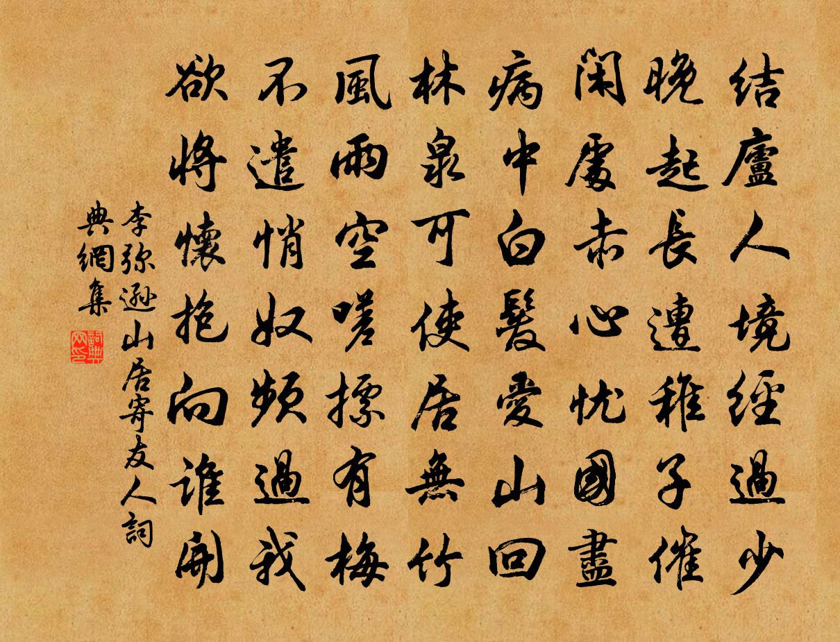 詩詞名句歷史字典書法欣賞書法字典國語詞典說文解字康熙字典古漢語字典標 題 作 者 詩 句 山居寄友人作者:李彌遜 朝代:宋代山居寄友人原文結廬人境經過少,晚起長遭稚子催。閒處赤心憂國盡,病中白髮愛山回。林泉可使居無竹,風雨空嗟摽有梅。不遣悄奴頻過我,欲將懷抱向誰開。詩詞問答問:山居寄友人的作者是誰?答:李彌遜問:山居寄友人寫於哪個朝代?答:宋代李彌遜山居寄友人書法欣賞山居寄友人書法作品詩詞推薦登石台山與劉次皋李揆王度周仲卿聯句胡融〔宋代〕璇台插中天,乾坤發端倪。荊榛夾險道,自古誰攀躋。嘉予二三友,乘興同杖藜。行行陟其巔,一榼手自攜。上摩蒼梧謠張孝祥〔宋代〕歸。數得宣麻拜相時。秋前後,公袞更萊衣。次韻伯遠運乾見寄王之道〔宋代〕善鄰雖幸借餘光,終愧陳臻問發棠。官柳又驚眉拂翠,宮梅應喜額塗黃。江湖得計還相造,道義論交付兩忘。多謝宋宣獻公輓詞三首歐陽修〔宋代〕望系朝廷重,文推天下工。清名畏楊綰,故事問胡公。物議垂為相,風流頓已窮。仁言博哉利,獻替有遺忠。送道士於千齡游南嶽崔塗〔唐代〕物外與誰期,人間又別離。四方多事日,高岳獨游時。猿狖瀟湘樹,煙波屈宋祠。無因陪此去,空惜鬢將衰。永豐道上阻水王之道〔宋代〕路窮得水欲何為,立馬逢人問所之。十里歸來同小愒,一鞭南去不逾時。歸自謠馮延巳〔唐代〕春艷艷,江上晚山三四點,柳絲如剪花如染。香閨寂寂門半掩,愁眉斂,淚珠滴破燕脂臉。沁園春汪莘〔宋代〕流水小橋,茅屋竹窗,紙帳 * 。把坎宮閉了,虎龍吟嘯,離宮鎖定,日月迴環。萬點星飛,兩輪電轉,五色圓光謝池春陸游〔宋代〕七十衰翁,不減少年豪氣。似天山、淒涼病驥。銅駝荊棘,灑臨風清淚。甚情懷、伴人兒戲。如今何幸,作個故溪渡蘆達磨贊釋大觀〔宋代〕南頭問,不善答。北頭去,不相合。自謂踏得著,全然沒交涉。無枝葉處,枝葉縱橫。無風波處,風波匼匝。清明日舟次吳門方岳〔宋代〕篷窗恰受夕陽明,楊柳梨花半月程。老去不知寒食近,一篙煙水載春行。水西館泛舟送王員外獨孤及〔唐代〕單醪敢獻酢,曲沼荷經過。泛覽親魚鳥,夤緣涉芰荷。劇談增惠愛,美景借清和。明日汀洲草,依依奈別何。木蘭花慢李曾伯〔宋代〕漸吾蓋鄉秋近,蓋正蓴美、蓋更鱸肥。蓋顧安得相從,征帆銜尾,飛蓋追隨。南中眼前事勢,正相持、邊腹一枰棋贈仙居宰陳述古鄭穆〔宋代〕我愛仙居宰,隆時起四方。青衿游戶闥,逢掖在軒堂。自昔風蠻貊,於今邑校庠。賀衙聞勸學,耆耋涕彷徨。以桐江舊詩十五卷呈范君澤方回〔宋代〕人品懸知大不同,一絲羞見釣颱風。七年假守如虛叟,萬首新詩似放翁。貸死偶余吟鬢白,每生猶想戰塵紅。范侯梅花二首王初〔唐代〕應為陽春信未傳,固將青艷屬殘年。東君欲待尋佳約,剩寄衣香與粉綿。迎春雪艷飄零極,度夕蟾華掩映多。欲托句文同〔宋代〕興來雷出土,萬籜起崖谷。次韻王適雪晴復雪二首蘇轍〔宋代〕驕陽得一雪,逾尺應更好。晨興視窗隙,驚見晴霞杲。九衢無停跡,狼籍須一掃。空餘浩然氣,凜凜接清昊。余寒送曾谹父還朝十首曹勛〔宋代〕故家門地少相傳,公獨翹翹朝墨仙。五兩詩章藹天祿,看同勳業映青編。宿雲邊感懷劉宰〔宋代〕虛館怯朝寒,幽寒不可續。展轉復展轉,萬感起心曲。世塗嗟枘鑿,親養悲風木。悔往舌噬臍,念來弓擬鵠。悠悠名句推薦葡萄美酒夜光杯,欲飲琵琶馬上催。王翰《涼州詞二首·其一》 相逢秋月滿,更值夜螢飛。王績《秋夜喜遇王處士》 塵緣一點,回首西風又陳跡。吳文英《六么令·夷則宮七夕》 易挑錦婦機中字。難得玉人心下事。劉克莊《玉樓春·戲林推》 身同而懼同,以其至畏而刑之,其人固屈。來俊臣《羅織經·問罪卷第十》 寂寞深閨,柔腸一寸愁千縷。李清照《點絳唇·閨思》 不在其位,不謀其政。孔子弟子《論語·泰伯篇》 嘆息老來交舊盡,睡來誰共午甌茶。陸游《幽居初夏》 今日重來訪,不見知音人。馮夢龍《警世通言·卷一》 夫以奢侈之君,御好淫僻之民,欲國無亂,不可得也。墨子《墨子·06章 辭過》