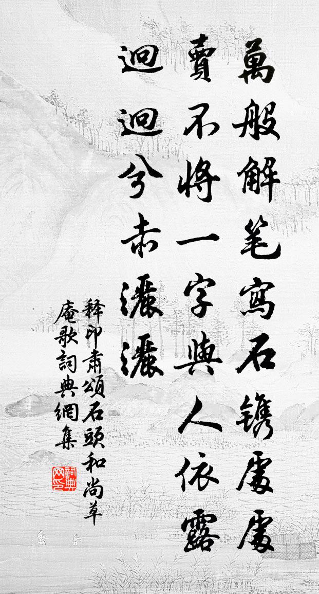 詩詞名句歷史字典書法欣賞書法字典國語詞典說文解字康熙字典古漢語字典標 題 作 者 詩 句 頌石頭和尚草庵歌作者:釋印肅 朝代:宋代頌石頭和尚草庵歌原文萬般解,筆寫石鐫處處賣。不將一字與人依,露迥迥兮赤灑灑。詩詞問答問:頌石頭和尚草庵歌的作者是誰?答:釋印肅問:頌石頭和尚草庵歌寫於哪個朝代?答:宋代釋印肅頌石頭和尚草庵歌書法欣賞頌石頭和尚草庵歌書法作品詩詞推薦頌古十九首釋法全〔宋代〕東司上不說佛法,喚來與伊劈面踏。不用重論報佛恩,將此深心奉塵剎。答朱公綽牡丹宋祁〔宋代〕珍卉分清賞,飛郵附翠籠。蹄金點鬢密,璋玉鏤跗紅。香惜持來遠,春應摘後空。玩時仍把酒,恨不與君同。華亭道間張榘〔宋代〕移船過九曲,滿袖貯西風。木落山容老,荷枯水面空。客懷詩句里,時事酒杯中。莫聽雲間鶴,寧呼天外鴻。檐卜林曾協〔宋代〕可人濃翠護微黃,寶樹森森自看行。居士飯余無一事,坐來還印寂然香。呈景彝偶書王珪〔唐代〕一從奉詔銀台路,下馬成詩奪鳳毫。東觀已陪窺秘籙,南宮又接較群髦。芝封紫掖文章貴,星近端門氣象高。今是醉中錄近詩因題卷後陸游〔宋代〕鵝兒色淺酒醺人,雞距鋒圜筆絕倫。滿引一杯書數紙,要知林下有閒身。途中寄上尚書晏相公二十韻梅堯臣〔宋代〕驚飆書入林鴉亂書飛,舞空落葉相追隨。秋權摧物不見跡,但使萬古生愁悲。登山臨水昔感別,身作旅人安得宜。晴野晁公溯〔宋代〕草色熏晴野,溪痕上白沙。鳴鳩行哺子,晚樹續開花。多事真堪砂,浮生每自嗟。坐來歸興動,城郭欲吹笳。田園居之右辟小室曰耕雨醉題壁上方岳〔宋代〕南岡北岡鳴鵓鳩,高田低田俱怒流。一蓑煙雨駕觳觫,老手猶在吾何憂。燈火半生書作崇,幾欲送窮窮不去。吁嗟積雪未晴正旦朝賀大慶殿口號八章程公許〔宋代〕玉階再拜卷班回,一炷心香憫動灰。六合風塵須一洗,八荒壽域會重開。盆梅倒植刳朽根作古怪僧復接杏花其上小詩吊錢時〔宋代〕倒植盤梅已反常,無端更接杏花芳。東君可是能時樣,姑射山人也艷妝。學士院端午貼子二十七首 夫人閣四首蘇轍〔宋代〕修廈欺晴日,重簾度細風。群仙不煩促,長在廣寒宮。尋芳空茂木,鬥草得幽蘭。歌舞纖絺健,嬉遊玉佩珊。新煮虞美人晏幾道〔宋代〕一弦彈盡仙韶樂,曾破千金學。玉樓銀燭夜深深,愁見曲中雙淚、落香襟。從來不奈離聲怨,幾度朱弦斷。未知誰奉寄子高盧兄五十韻蘇泂〔宋代〕君才如驌驦,道里未可量。讀書患脈絡,如海東赴洋。五年隔異縣,信若參與商。昨者戒車馬,故意改未嘗。我家效寒山體曹勛〔宋代〕嗟我世間人,有山只暫聚。富貴空中花,遇合風裡絮。夜夜植業種,朝朝奔苦趣。佛有妙蓮花,讀取平等句。過池陽舊治和呂子西韻袁說友〔宋代〕浮沈宦海幾春秋,歲晚重來舊典州。昔日青山雖在眼,故侯白髮已盈頭。吟邊感慨關情久,忙裡工夫著意偷。聞說瑞鶴仙(壽虞守·三月初十)歐陽光祖〔宋代〕得毛韓經學。振祖風,挺挺凌煙勳業。文章世為甲。果妙齡秀髮,薦膺衡鶚。名登雁塔。訪梅仙,種河陽桃李,從送陸郎中錢起〔唐代〕事邊仍戀主,舉酒復悲歌。粉署含香別,轅門載筆過。鶯聲出漢苑,柳色過漳河。相憶情難盡,離居春草多。城上李商隱〔唐代〕有客虛投筆,無憀獨上城。沙禽失侶遠,江樹著陰輕。邊遽稽天討,軍須竭地征。賈生遊刃極,作賦又論兵。減字木蘭花黃庭堅〔宋代〕黔中士女游晴晝。花信輕寒羅袖透。爭尋穿石道宜男,更買江魚雙貫柳。竹枝歌好移船就。依倚風光垂翠袖。滿傾名句推薦綠葉青跗映丹萼,與君裴回上金閣。王勃《落花落》 弱水三千,我只取一瓢飲。曹雪芹《紅樓夢·第九十一回》 輦轂繁華事可傷,師師垂老過湖湘劉子翬《汴京紀事》 建官惟賢,位事惟能。佚名《尚書·周書·武成》 相思不作勤書禮,別後吾言在訂頑。王守仁《諸門人送至龍里道中二首》 落葉滿空山,何處尋行跡。韋應物《寄全椒山中道士》 出不入兮往不反,平原忽兮路超遠。屈原《國殤》 自知者不怨人,知命者不怨天。荀子《荀子·榮辱》 事先敗而後成,曰失之東隅,收之桑榆;事將成而終止,曰為山九仞,功虧一簣。程登吉《幼學瓊林·卷一·地輿》 風日薄、度牆啼鳥聲亂。盧祖皋《宴清都·初春》