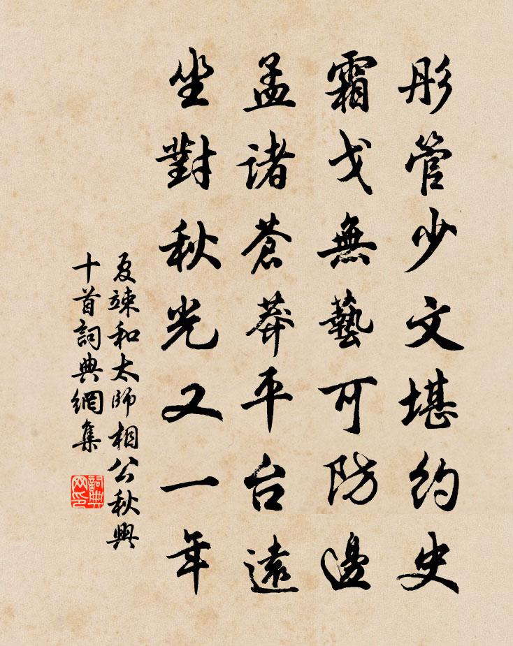 詩詞名句歷史字典書法欣賞書法字典國語詞典說文解字康熙字典古漢語字典標 題 作 者 詩 句 和太師相公秋興十首作者:夏竦 朝代:宋代和太師相公秋興十首原文彤管少文堪約史,霜戈無藝可防邊。孟諸蒼莽平台遠,坐對秋光又一年。詩詞問答問:和太師相公秋興十首的作者是誰?答:夏竦問:和太師相公秋興十首寫於哪個朝代?答:宋代夏竦和太師相公秋興十首書法欣賞和太師相公秋興十首書法作品詩詞推薦頌古十二首釋法泰〔宋代〕無星秤子兩頭平,拈起應須見得明。若向箇中爭分兩,知渠錯認定盤星。送春四錫〔宋代〕花菲菲,柳依依,留春不住送春歸。春歸何處堪圖畫,春盡江南日暮時。黃鸝啼多芳草遠,青梅子重楊花飛。人生趙司法詩集自題近道蓋取工部所貽元隱大詩中樂雷發〔宋代〕和遍陶翁飲酒詩,醉籠天地入鴟夷。細看官爵成何物,肯帶奚囊過九疑。減字木蘭花王之道〔宋代〕鱉頭龜手。孤坐書生能意就。暖體溫膚。繡被春寒想見無。雪詞工巧。高壓君房天下妙。白髮欺人。甚矣吾衰懶是偈頌七十六首釋師觀〔宋代〕斷人性命,不勞餘刃。四海一家,風恬浪靜。釣灘李白〔唐代〕磨盡石嶺墨,潯陽釣赤魚。靄峯尖似筆,堪畫不堪書。 穀神歌呂岩〔唐代〕我有一腹空谷虛,言之道有又還無。言之無兮不可舍,言之有兮不可居。谷兮谷兮太玄妙,神兮神兮真大道。保之薛公肅訪山中偶出不值公肅留詩次其韻李流謙〔宋代〕一舸初從帝所還,彩衣照日眩斕斑。今君已出雲天近,我尚無錢可買山。湖莊雜詩曹彥約〔宋代〕雨後人家菜麥香,旋渦流水亂橫塘。青春未有闌珊意,付與遊人處此忙。偈六十三首釋道寧〔宋代〕一人發真歸源,十方虛空,悉皆鎖殞。渾家不是不進步,無奈當門荊棘生。八盜張耒〔宋代〕挾弓持矛八人者,暮出永寧循白馬。袁村飲酒呼主翁,主翁倉皇問以弓。朝飯南山民獻彘,主人贈刀其姓李。道逢朝中措郭世模〔宋代〕青燈聽雨夜荒涼。歸夢苦難長。坐想玉奩鴛錦,空餘臂粉衣香。枕邊共語,窗前執手,簾外啼妝。也是平生薄倖,漫成三首張耒〔宋代〕閉門春風作往還,誰家有花堪醉眠。柳腰榆莢爭入眼,江梅一枝遠如天。平江送王騰叔陳藻〔宋代〕交情早已有何蕃,為我揚聲梁楚間。秋暮姑蘇身自到,春來行李處猶難。十年為客思新切,一第從人奏凱還。莫笑雩祀樂章。雍和褚亮〔唐代〕紺筵分彩,寶圖吐絢。鳳管晨凝,雲歌曉囀。肅事蘋藻,虔申桂奠。百穀斯登,萬箱攸薦。謝韓秀才送松栽四首馮時行〔宋代〕新拓藤蘿住翠巒,移根千本到雲端。初乘雨露迎春種,便作雲霄蔽日看。岩穴從今增氣象,伏苓可擬救衰殘。知君偈頌一百零九首釋可湘〔宋代〕灌頂雲收,峨眉月晝。父翁一片肝腸,宛如生鐵鑄就。弟應兄呼,全機漏逗。蘇州菱,邵伯藕。有為予言烏龍高嶮不可到處有僧岩居不知其年陸游〔宋代〕嶮絕無微徑,淙潺有細流。寒岩依作屋,墮毳拾為裘。木客求相識,毛人約共游。百年如一瞬,塵世幾公侯。紹興以後祀五方帝六十首佚名〔宋代〕沆碣西顥,功載萬世。乘金宅兌,侑我明祀。嘉觴布蘭,牲玉潔精。神之燕虞,肅用有成。滿江紅(同襄陽帥泛湖)劉過〔宋代〕獵獵風蒲,畫船轉、碧灣沙浦。都不是、蓼汀桃岸,橘洲梅渚。指點山公騎馬地,經是羊祜登山處。悄一如、人在名句推薦春水迷天,桃花浪、幾番風惡。張元乾《滿江紅·自豫章阻風吳城山作》 秋容淺淡映重門,七節攢成雪滿盆。曹雪芹《詠白海棠》 夜雨連明春水生,嬌雲濃暖弄陰晴。蘇舜欽《初晴游滄浪亭》 把酒祝東風,且莫恁、匆匆去。王安石《傷春怨·雨打江南樹》 我閉南樓看道書,幽簾清寂在仙居。李白《早秋單父南樓酬竇公衡》 攜籮驅出敢偷閒,雪脛冰須慣忍寒。范成大《雪中聞牆外鬻魚菜者求售之聲甚苦有感》 水墨畫疏窗,孤影淡瀟湘。納蘭性德《木蘭花慢·立秋夜雨送梁汾南行》 萬里橋邊多酒家,遊人愛向誰家宿。張籍《成都曲》 何處寄想思,南風搖五兩。王維《送宇文太守赴宣城》 柳如眉,雲似發,鮫綃霧縠籠香雪。魏承班《漁歌子·柳如眉》