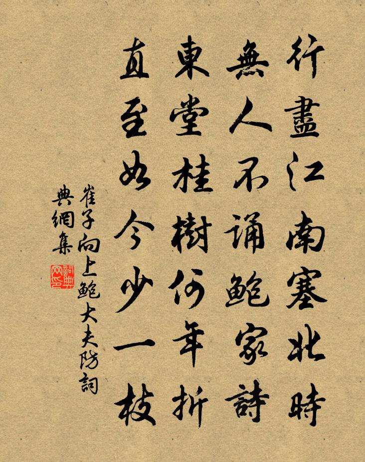 詩詞名句歷史字典書法欣賞書法字典國語詞典說文解字康熙字典古漢語字典標 題 作 者 詩 句 上鮑大夫(防)作者:崔子向 朝代:唐代上鮑大夫(防)原文行盡江南塞北時,無人不誦鮑家詩。東堂桂樹何年折,直至如今少一枝。詩詞問答問:上鮑大夫(防)的作者是誰?答:崔子向問:上鮑大夫(防)寫於哪個朝代?答:唐代問:上鮑大夫(防)是什麼體裁?答:七絕崔子向上鮑大夫(防)書法欣賞上鮑大夫(防)書法作品注釋全唐詩:卷314-17詩詞推薦送王侍御赴江西兼寄李袁州韓翃〔唐代〕中朝理章服,南國隨旌旆。臘酒湘城隅,春衣楚江外。垂簾白角簟,下箸鱸魚鱠。雄筆佐名公,虛舟應時輩。按俗得古杉於劉坑陳宓〔宋代〕劉坑有嘉木,根柯煉青銅。雲是昔參天,森環梵王宮。陵谷欻遷改,風雷行地中。於今五百載,漁父忽相逄。沒淵山居陸游〔宋代〕客至何曾共劇談,行 * 有老農諳。覓官肯信山居樂,食淡方知飯味甘。一脈泉通澆藥圃,萬重雲鎖釣魚庵。好奇題軍山徐秀才居曾致堯〔宋代〕買斷軍峰不計錢,屋前屋後水潺潺。青春花發簾帷外,白日雲浮棟宇間。金鼎欲成紅氣溢,玉芝初種紫苗慳。未知莫將仕輓詞樓鑰〔宋代〕自嘆清才久陸沉,晚從內典用工深。諦觀烱烱死生際,寧復紛紛利祿心。載酒今誰問奇字,遺經古亦勝黃金。十年光啟丁未別山司空圖〔唐代〕草堂琴畫已判燒,猶托鄰僧護燕巢。此去不緣名利去,若逢逋客莫相嘲。長亭怨張炎〔宋代〕之北,遂作此曲記橫笛、玉關高處。萬里沙寒,雪深無路。破卻貂裘,遠遊歸後與誰譜。故人何許。渾忘了、江南至日述事時江海大捷曾幾〔宋代〕觀台四望楚氛開,雲物輪囷瑞九垓。大雪山陰消得盡,微陽井底放令回。江心皁幟千艘沒,海角黃旗一騎來。想像出山相贊釋子益〔宋代〕捏雙源,衣露肘。謂悟明星,有甚分虹。本為修行利濟人,誰知變作不唧{左口右留}。林酒庫輓詞戴栩〔宋代〕靜夢鍾催漏,榮恩露眩花。能鐫題墓語,終認讀書家。壤樂齊裘褐,風酸送旐車。竹軒孫幾輩,又減雁行斜。感恩多牛嶠〔唐代〕兩條紅粉淚,多少香閨意。強攀桃李枝,斂愁眉。陌上鶯啼蝶舞,柳花飛。柳花飛,願得郎心,憶家還早歸。自從偈頌一百五十首釋心月〔宋代〕與麽也在我,不與麽也在我。明眼漢擔拄杖繞天下橫行,為什麼透這些子不得。年老逢春十三首邵雍〔宋代〕年老逢春春莫猜,老年方自少年回。人情少悅酒不解。天氣卻寒花未開。堤外有風斜送柳,牆陰經雨半生苔。去年冬至之二日兄弟兒侄偕過西山道院歸而微雪虞儔〔宋代〕忽然薄暮暗江天,沖面涼風馬不前。五色書雲占昨日,六花瑞雪應明年。向來水旱民何罪,此去流移天盍憐。逗曉原州贈王補之洛苑同年張舜民〔宋代〕汴上相從又幾星,尚淹符竹守臨涇。不須怪我頭添白,且喜逢君眼暫青。舊任再游空寂寞,同年屈數半凋零。何當華嚴塔楊蟠〔宋代〕石下有靈骨,千年生玉芝。山神每藏護,不使世人知。春日偶題四首張耒〔宋代〕漫漫東風百草長,夭桃如笑柳如妝。惟憑酒作青春敵,收拾風光入醉鄉。孟子仁者無敵陳普〔宋代〕仁人所在人心萃,魚爵叢淵固自歸。天命到頭還不外,東征西怨豈容違。次韻范伯廉機宜病起見寄喻良能〔宋代〕夫君自是穎囊錐,何事翻為滄海遺。造化小兒聊戲劇,山林大藥豈無資。得閒因病還應樂,信手揮毫卻有詩。休嘆自戲三絕句。身報心白居易〔唐代〕心是身王身是宮,君今居在我宮中。是君家舍君須愛,何事論恩自說功?名句推薦江山如有待,花柳自無私。杜甫《後游》 其服不同,其行猶一也。墨子《墨子·48章 公孟》 山際見來煙,竹中窺落日。吳均《山中雜詩》 舉目山河異,偏傷周顗情。李白《金陵新亭》 春風來不遠,只在屋東頭。于謙《除夜太原寒甚》 仁不異遠,義不辭難班固《漢書·紀·武帝紀》 應知早飄落,故逐上春來。何遜《詠早梅 / 揚州法曹梅花盛開》 秋晚佳晨重物華,高台復帳駐鳴笳。宋祁《九日置酒》 誰謂含愁獨不見,更教明月照流黃。沈佺期《古意呈補闕喬知之 / 古意 / 獨不見》 撥雪尋春,燒燈續晝。毛滂《踏莎行·元夕》