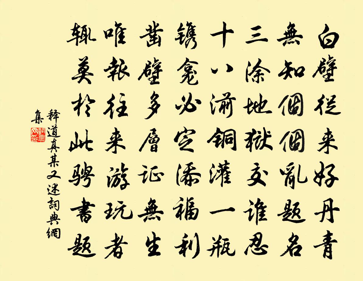 詩詞名句歷史字典書法欣賞書法字典國語詞典說文解字康熙字典古漢語字典標 題 作 者 詩 句 某又述作者:釋道真 朝代:宋代某又述原文白壁從來好丹青,無知個個亂題名。三塗地獄交誰忍,十八湔銅灌一瓶。鐫龕必定添福利,鑿壁多層證無生。唯報往來遊玩者,輒莫於此騁書題。詩詞問答問:某又述的作者是誰?答:釋道真問:某又述寫於哪個朝代?答:宋代釋道真某又述書法欣賞某又述書法作品詩詞推薦題釣台對嚴氏樓三首滕岑〔宋代〕扁舟江上幾曾經,山崦層樓似畫屏。豈料今為倚樓客,誰能添我入丹青。途中柳李中〔唐代〕翠色晴來近,長亭路去遙。無人折煙縷,落日拂溪橋。寄從兄憲兼示二弟徐鉉〔唐代〕別路吳將楚,離憂弟與兄。斷雲驚晚吹,秋色滿孤城。信遠鴻初下,鄉遙月共明。一枝棲未穩,回首望三京。蒼梧謠/歸字謠張孝祥〔宋代〕歸。獵獵薰風颭繡旗。攔教住,重舉送行杯。結客少年場行沈彬〔唐代〕重義輕生一劍知,白虹貫日報讎歸。片心惆悵清平世,酒市無人問布衣。樊學士送菊次韻答之陳著〔宋代〕 * 有名花,淵明無酒官。酒多人自醉,花好月同看。老未厭人世,天教共歲寒。未應攜不去,高步蓬萊山。句宋綬〔宋代〕神歸梁小廟,禮袝漢餘陵。太上皇后合端午帖子詞汪應辰〔宋代〕寶殿名康壽,皇心在祝延。願從重五日,更閱萬千年。任洛陽丞請告一首韋應物〔唐代〕方鑿不受圓,直木不為輪。揆材各有用,反性生苦辛。折腰非吾事,飲水非吾貧。休告臥空館,養病絕囂塵。游魚次張以道韻張鎡〔宋代〕無愁便是樂無涯,看破紛紛眼裡花。旋洗杯盂將酒試,重糊窗戶把風遮。丹房火鼎頻添水,衣櫃香爐就焙茶。判卻道衛甥送酒李石〔宋代〕親旁未敢酌貪泉,白髮風燈喜懼年。渠輩相夸玉蕊佩,我貧正欠杖頭錢。題余氏聚遠樓魏了翁〔宋代〕若向天機識得親,是間看不盡青春。須知聚遠惟方寸,說與樓前望眼人。江湖集壬午初秋贈寫真陳生楊萬里〔宋代〕居士一丘壑,深衣折角巾。誰曾令子見,忽漫寫吾真。更不遊方外,於何頓若人。呼見一笑看,下筆可能親。千秋歲王哲〔元代〕汨汨塵寰擾。苦苦尤深窈。長系絆、不分曉。日生還恁地,夜夢魂驚杳。聽分表。都緣劫劫波波紹。急急心開肇。沖嗇書事曹勛〔宋代〕山居終日不開門,室有南窗氣自溫。人籟暫休天籟息,月華將冷照黃昏。聞揚州柴給事有弄璋之慶寄詩賀之楊億〔宋代〕華堂何夕夢熊羆,衛氏如今有一兒。三日懸弧應是喜,十年結實未為遲。預知駟馬門閭盛,暗想天麟骨法奇。曾忝寄題栝蒼陳伯予主簿平楚亭陸游〔宋代〕琵琶洲上暮山奇,五十餘年役夢思。與子定交雖可樂,念身垂老亦成悲。遠遊倦似風枝鵲,愁思多於繭盎絲。安得菩薩蠻(雪樓賞牡丹席上用楊民瞻韻)辛棄疾〔宋代〕紅牙籤上群仙格。翠羅蓋底傾城色。和雨淚闌乾。沈香亭北看。東風休放去。怕有流鶯訴。試問賞花人。曉妝勻未秋日登樓李新〔宋代〕洗遍山光暮雨收,落霞孤鶩點清秋。蜀天地暖知無雁,不怕愁聲穩上樓。次韻兩蘇公講筵唱和四首晁補之〔宋代〕白髮歸聯侍從榮,未應江海嘆飄零。禽魚不與鈞天觀,想見群龍舞洞庭。名句推薦盡道豐年瑞,豐年事若何羅隱《雪》 願我如星君如月,夜夜流光相皎潔。范成大《車遙遙篇》 古之人,得志,澤加於民;不得志,修身見於世。窮則獨善其身,達則兼善天下。孟子《孟子·盡心章句上·第九節》 旌蔽日兮敵若雲,矢交墜兮士爭先。屈原《國殤》 鐵馬雲雕久絕塵,柳營高壓漢營春。溫庭筠《過五丈原 / 經五丈原》 春草如有情,山中尚含綠李白《金門答蘇秀才》 兩個黃鸝鳴翠柳,一行白鷺上青天。杜甫《絕句》 試問春歸誰得見?飛燕,來時相遇夕陽中。辛棄疾《定風波·暮春漫興》 蓮香隔浦渡,荷葉滿江鮮。劉孝威《採蓮曲·金槳木蘭船》 小軒獨坐相思處,情緒好無聊。石孝友《眼兒媚·愁雲淡淡雨瀟瀟》