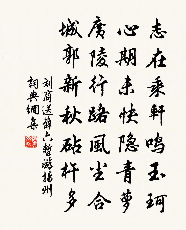 詩詞名句歷史字典書法欣賞書法字典國語詞典說文解字康熙字典古漢語字典標 題 作 者 詩 句 送薛六暫游揚州作者:劉商 朝代:唐代送薛六暫游揚州原文志在乘軒鳴玉珂,心期未快隱青蘿。廣陵行路風塵合,城郭新秋砧杵多。詩詞問答問:送薛六暫游揚州的作者是誰?答:劉商問:送薛六暫游揚州寫於哪個朝代?答:唐代問:送薛六暫游揚州是什麼體裁?答:七絕劉商送薛六暫游揚州書法欣賞送薛六暫游揚州書法作品注釋全唐詩:卷304-21詩詞推薦上明達皇后冊寶五首真宗〔宋代〕何成熙事,虛徐翠楹。神保聿歸,雲車夙正。鑒我休德,神交惚恍。留祉降祥,千秋是享。九日觀萬堂小酌懷正仲及梅所鍊師舒岳祥〔宋代〕極目冥鴻顥氣初,人生快意食鱸魚。剪來萸菊觸新酒,麾去蚊蠅府舊書。騷雅劉郎今健否,清修周老近何如。篆畦芭蕉雨謝翱〔宋代〕吳楚燈前侶,芭蕉海上身。涼宵知過雨,病葉與羈人。白屋愁看曉,滄洲宿語貧。西南多苦竹,應與越禽鄰。雨中聽琴者彈別鶴操白居易〔唐代〕雙鶴分離一何苦,連陰雨夜不堪聞。莫教遷客孀妻聽,嗟嘆悲啼(訁尼)殺君。送吳襄陽換承宣使歸奉時請二首項安世〔宋代〕去年荊府參謀去,今歲襄州太守歸。捐我漢南江北卻,從今樂事賞心稀。南風日日菰蒲長,秋水年年鱖鯽肥。已斷夢中作陸游〔宋代〕征途遇秋雨,數士集郵亭。酒拆官壺綠,山圍草市青。劇談猶激烈,瘦影各伶俜。四海皆兄弟,悠然共醉醒。元夕龜藏夜坐舒岳祥〔宋代〕冷火寒齋酒一樽,黃柑分遺及諸孫。菜園羅帛燈千眼,說著承平暗斷魂。好事近(送春)蔡幼學〔宋代〕日日惜春殘,春去更無明日。擬把醉同春住,又醒來岑寂。明年不怕不逢春,嬌春怕無力。待向燈前休睡,與留連送荻栽與秀才朱觀徐鉉〔唐代〕羨子清吟處,茅齋面碧流。解憎蓮艷俗,唯欠荻花幽。鷺立低枝晚,風驚折葉秋。贈君須種取,不必樹忘憂。紫金翅賈似道〔宋代〕紫頭青項翅如金,腿腳兼黃肉帶蜜。必須生有紫黑鉗,咬殺秋蟲人失色。河陰新城雍陶〔唐代〕高城新築壓長川,虎踞龍盤氣色全。五里似雲根不動,一重如月暈長圓。河流暗與溝池合,山色遙將睥睨連。自有緣識宋太宗〔宋代〕玄珠玄珠存今古,總在眼前無一睹。圓似明珠照十方,或來或去寒無雨。本是真,玄中聖,天仙地仙收不盡。虛無風入松(閏元宵)張炎〔宋代〕向人圓月轉分明。簫鼓又逢迎。風吹不老蛾兒鬧,繞玉梅、猶戀香心。報導依然放夜,何妨款曲行春。錦燈重見麗戲徐觀空張汝勤〔宋代〕學詩如學禪,所貴在觀妙。肺肝劇雕鏤,乃自鑿其竅。冥心游象外,何物可供眺。空山散雲霧,仰避日初照。曠觀浣溪沙曹勛〔宋代〕玉柱檀槽立錦筵。低眉信手曲初傳。鳳凰飛上四條弦。楊柳已吹三疊韻,何須人在九江船。夜涼人與月嬋娟。賦雪虞儔〔宋代〕風回雪急巧穿帷,黃竹歌殘更斂眉。燕集幾家尋鵠鷺,獵圍何處問狐狸。長飢政自愁黃獨,高臥誰能管竊脂。賴有過莆城懷別劉後村中書因以奉寄胡仲弓〔宋代〕當日揚清激濁流,身危肯作稻粱謀。不從黨錮諸賢死,竊祿偷生亦可羞。中京紀事蘇頌〔宋代〕邊關本是苦寒地,況復嚴冬入虜鄉。一帶土河猶未凍,數朝晴日但凝霜。上心固已推恩信,天意從茲變燠暘。最是道士步虛詞 四庾信〔南北朝〕凝真天地表。絕想寂寥前。有象猶虛豁。忘形本自然。開經壬子世。值道甲申年。回雲隨舞曲。流水逐歌弦。石髓僧如展及韋載同游碧澗寺各賦詩…不復撰成徒以四韻為識元稹〔唐代〕重吟前 * 生句,豈料逾旬便隔生。會擬一來身塔下,無因共繞寺廊行。紫毫飛札看猶濕,黃字新詩和未成。縱使名句推薦為有雲屏無限嬌,鳳城寒盡怕春宵。李商隱《為有》 年年陌上生秋草,日日樓中到夕陽。晏幾道《鷓鴣天·醉拍春衫惜舊香》 天長地久有時盡,此恨綿綿無絕期。白居易《長恨歌》 提三尺劍以定四海吳兢《貞觀政要·卷八·論貢賦》 歌沉玉樹,古寺空有疏鍾發。李綱《六么令·次韻和賀方回金陵懷古鄱陽席上作》 待何年歸去,談笑各爭雄。顧太清《高山流水·次夫子清風閣落成韻》 黃河曲里沙為岸,白馬津邊柳向城。高適《夜別韋司士》 書卷多情似故人,晨昏憂樂每相親。于謙《觀書》 天涯靜處無征戰,兵氣銷為日月光。常建《塞下曲四首·其一》 居安思危。思則有備,有備無患左丘明《左傳·襄公·襄公十一年》