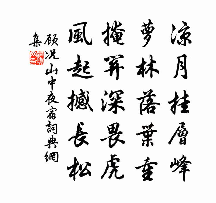 詩詞名句歷史字典書法欣賞書法字典國語詞典說文解字康熙字典古漢語字典標 題 作 者 詩 句 山中夜宿作者:顧況 朝代:唐代山中夜宿原文涼月掛層峰,蘿林落葉重。掩關深畏虎,風起撼長松。詩詞問答問:山中夜宿的作者是誰?答:顧況問:山中夜宿寫於哪個朝代?答:唐代問:山中夜宿是什麼體裁?答:五絕顧況山中夜宿書法欣賞山中夜宿書法作品注釋全唐詩:卷267_30詩詞推薦題游帷觀真君殿後伊用昌〔唐代〕日日祥雲瑞氣連,儂家應作大神仙。筆頭灑起風雷力,劍下驅馳造化權。更無戎夷添禮樂,永教胡虜絕烽煙。列仙送李郎尉武康岑參〔唐代〕潘郎腰綬新,霅上縣花春。山色低官舍,湖光映吏人。不須嫌邑小,莫即恥家貧。更作東征賦,知君有老親。昇平公主舊第羅隱〔唐代〕乘鳳仙人降此時,玉篇才罷到文詞。兩輪水磑光明照,百尺鮫綃換好詩。帶礪山河今盡在,風流樽俎見無期。壇場句幸夤遜〔唐代〕巧剪銀花亂,輕飛玉葉狂。元宵懷都城簡胡令俊民時胡連夕在告朱翌〔宋代〕天豁晴光合,檐收雪汗乾。燈期欣在候,火令不為難。方喜春風動,猶憐暮色寒。仙晨今夜樂,帝所舊年觀。鬱郁偈頌三十八首釋如淨〔宋代〕不曾生,不曾死,洞裡桃花紅照水。可憐開眼被渠瞞,人間天上風波起。白鷺汀顧況〔唐代〕靃靡汀草碧,淋森鷺毛白。夜起沙月中,思量捕魚策。旴士張季攜所注三略訪西山先生既跋其書余復劉克莊〔宋代〕張生快士非拘儒,袖出一編相斫書。撲虱拍蚊吾不忍,斷蛇刺虎子何粗。新栽梅白居易〔唐代〕池邊新種七株梅,欲到花時點檢來。莫怕長洲桃李妒,今年好為使君開。春晚旅次有懷劉滄〔唐代〕晚出關河綠野平,依依雲樹動鄉情。殘春花盡黃鶯語,遠客愁多白髮生。野水亂流臨古驛,斷煙凝處近孤城。東西賀新郎·西湖文及翁〔宋代〕一勺西湖水。渡江來,百年歌舞,百年酣醉。回首洛陽花石盡,煙渺黍離之地。更不復、新亭墮淚。簇樂紅妝搖畫題淨明寺周日明〔宋代〕幽幽古寺中,石徑受苔封。白日無一事,青山只四峰。野蔬為佛供,澗水替人舂。僧因煎新茗,林間拾墜松。木犀花羅與之〔宋代〕秋影連蜷隱士攀,渾無蜂蝶涴林間。何人說與陶元亮,未必東籬勝小山。偈頌二十二首釋道生〔宋代〕雨雪落紛紛,檐頭水滴滴。良哉觀世音,草里跳不出。跳不出,也大屈,水裡烏龜鑽鐵壁。寄征夫宋伯仁〔宋代〕待君群未歸,寄書書不去。寄書書可去,有意殊難語。深夜彈琵琶,思君何在處,知君在何處。不禁春事已闌珊,送李主簿夷行之官河陰四首賀鑄〔宋代〕夙昔一樽酒,相從清泗濱。回首欻四載,長安逢故人。交情久益淡,辭筆老加新。送子復西去,勞生悲重陳。史忠定蚤作帖贊岳珂〔宋代〕危微精一,傳之在心。二典勛華,光於有臨。大原自天,端倪孰尋。豈無疇咨,培高浚深。寢明以昌,舉元難壬。重入洛陽東門李紳〔唐代〕商顏重命伊川叟,時事知非入洛人。連野碧流通御苑,滿階秋草過天津。每慚清秩容衰齒,猶有華簪寄病身。驅馬歸途值去客曾豐〔宋代〕歲晚乾坤閉未開,地中方蟄振天雷。山雲已覺成輕出,塞雁何為獨遠來。失學齊侯隨馬去,甘為墨子叱車回。從今謝中書施捨人宴集喻良能〔宋代〕紫微高義篤同年,邃宇開筵近臘寒。綠蟻醅濃粘玉盞,紫駝峰美照金盤。醺酣上頰生春意,文字清談卜夜闌。更辱名句推薦有兼聽之明,而無矜奮之容;有兼覆之厚,而無伐德之色。荀子《荀子·正名》 戰必覆人之軍,攻必凌人之城。商鞅《商君書·賞刑》 矜高倨傲,無非客氣降伏得,客氣下而後正氣伸洪應明《菜根譚·概論》 予若洞庭葉,隨波送逐臣。李白《送郄昂謫巴中》 晚年唯好靜,萬事不關心。王維《酬張少府》 春風疑不到天涯,二月山城未見花。歐陽修《戲答元珍》 君王選玉色,侍寢金屏中。李白《怨歌行》 麥浪翻晴風颭柳,已過傷春候。納蘭性德《四和香·麥浪翻晴風颭柳》 無為其所不為,無欲其所不欲。孟子《孟子·盡心章句上·第十七節》 春無主!杜鵑啼處,淚灑胭脂雨陳子龍《點絳唇·春日風雨有感》