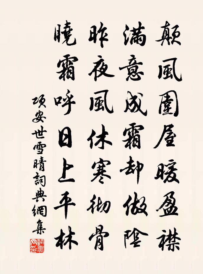 詩詞名句歷史字典書法欣賞書法字典國語詞典說文解字康熙字典古漢語字典標 題 作 者 詩 句 雪晴作者:項安世 朝代:宋代雪晴原文顛風圍屋暖盈襟,滿意成霜卻做陰。昨夜風休寒徹骨,曉霜呼日上平林。詩詞問答問:雪晴的作者是誰?答:項安世問:雪晴寫於哪個朝代?答:宋代項安世雪晴書法欣賞雪晴書法作品詩詞推薦觀吳偃畫松施肩吾〔唐代〕君有絕藝終身寶,方寸巧心通萬造。忽然寫出澗底松,筆下看看一枝老。題江心寺蒲壽宬〔宋代〕聞說東甌勝,茲游心頗降。江心浮一寺,水面立雙幢。路絕帆當戶,潮回月漾窗。悠悠懷古思,把酒酹漁釭。宿清都觀趙蕃〔宋代〕涪翁逍遙果安在,玉局清都今何如。遺蹤羽化不可問,朗誦二詩行繞除。滕子京魏介之二同年相訪丹陽郡范仲淹〔宋代〕長江天下險,涉者利名驅。二公訪貧交,過之如坦途。風波豈不惡,忠信天所扶。相見乃大笑,命歌倒金壺。同年春貼子皇后閣五首真德秀〔宋代〕寶勝千春字,瓊樽九醖香。六宮齊上壽,地久配天長。續長恨歌范成大〔宋代〕金杯瀲灩曉妝寒,國色天香勝牡丹。白鳳詔書來已暮,六宮鉛粉半春闌。九日獨酌三首蘇轍〔宋代〕平昔交遊今幾人,後生誰復款吾門。茅檐適性輕華屋,黍酒忘形敵上樽。東圃旋移花百本,西軒恨斫竹千根。舍南題陳岩庵寄諸兄弟呂聲之〔宋代〕地接丹丘姥嶺賒,山盤曲折狀如蛇。每因過此瞻雙隴,何必從旁置萬家。孝弟本根時潤澤,詩書種子日萌芽。到來【南呂】金字經_增葉雲中山張可久〔元代〕增葉雲中山行萬里封侯貴,一場春夢中,破帽青鞋策短筇。逢,南山採藥翁。桃花洞,白雲千萬重。訪吾丘道士細中隱堂詩蘇軾〔宋代〕都城更幾姓,到處有殘碑。古隧埋蝌蚪,崩崖露伏龜。安排壯亭榭,收拾費金貲。岣嶁何須到,韓公浪自悲。青玉案周邦彥〔宋代〕良夜燈光簇如豆。占好事、今宵有。酒罷歌闌人散後。琵琶輕放,語聲低顫,滅燭來相就。玉體偎人情何厚。輕惜次韻子由召伯埭見別三首秦觀〔宋代〕冠蓋紛紛不我謀,掩關聊與古人游。會須匹馬淮西去,雲巘風溪遂所求。過臨淮張耒〔宋代〕沖寒發孤城,帶雪入異縣。春陰舟楫回,遠眼煙木亂。朝來雲間塔,別我忽不見。春流背客去,應過前日岸。懷居華之高壽魯齋先生七十金履祥〔宋代〕金華之高,其色蒼蒼。維華降神,生何及王。暮春詞釋行海〔宋代〕春風盪槳落花時,江鼓冬冬舞柘枝。雨洗櫻紅蠶豆綠,金衣公子可憐誰。獻大京兆薛常侍能鄭谷〔唐代〕恥將官業競前途,自愛篇章古不如。一炷香新開道院,數坊人聚避朝車。縱游藉草花垂酒,閒臥臨窗燕拂書。唯有贈林逋處士釋智圓〔宋代〕深居猿鳥共忘機,荀孟才華鶴氅衣。滿砌落花春病起,一湖明月夜漁歸。風搖野水青蒲短,雨過閒園紫蕨肥。塵土自常州還江陰途中作李嘉祐〔唐代〕處處空籬落,江村不忍看。無人花色慘,多雨鳥聲寒。黃霸初臨郡,陶潛未罷官。乘春務征伐,誰肯問凋殘。喜遷鶯李綱〔宋代〕江天霜曉。對萬頃雪浪,雲濤彌渺。遠岫參差,煙樹微茫,閱盡往來人老。淺沙別浦極望,滿目餘霞殘照。暮雲斂鵲橋仙張元乾〔宋代〕靚妝艷態,嬌波流盼,雙靨橫渦半笑。尊前燭畔粉生光,更低唱、新翻轉調。花房結子,冰枝清瘦。醉依香濃寒峭名句推薦擬把傷離情緒,待曉寒重說。納蘭性德《好事近·簾外五更風》 子規夜半猶啼血,不信東風喚不回。王令《送春》 處顛者危,勢豐者虧。王充《論衡·卷一·累害篇》 丈夫志,當景盛,恥疏閒。蘇舜欽《水調歌頭·滄浪亭》 春無蹤跡誰知。除非問取黃鸝。黃庭堅《清平樂·春歸何處》 咬定青山不放鬆,立根原在破岩中。鄭燮《竹石》 如何亡國恨,盡在大江東!屈大均《秣陵》 命里有時終須有,命里無時莫強求。佚名《增廣賢文·上集》 但憑闌無語,煙花三月春愁。鄭覺齊《揚州慢·瓊花》 三分春色二分愁,更一分風雨。葉清臣《賀聖朝·留別》