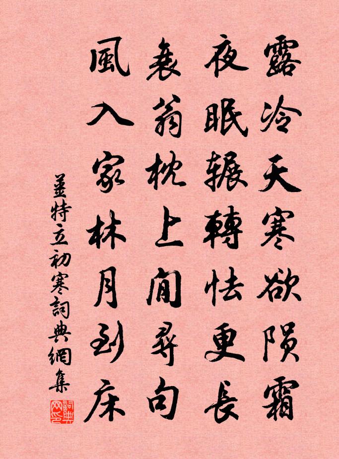 詩詞名句歷史字典書法欣賞書法字典國語詞典說文解字康熙字典古漢語字典標 題 作 者 詩 句 初寒作者:姜特立 朝代:宋代初寒原文露冷天寒欲隕霜,夜眠輾轉怯更長。衰翁枕上閒尋句,風入家林月到床。詩詞問答問:初寒的作者是誰?答:姜特立問:初寒寫於哪個朝代?答:宋代姜特立初寒書法欣賞初寒書法作品詩詞推薦丁亥九月十六夜偕李監倉宿龍臥山中聽雨看月林亦之〔宋代〕相喚此山來,狂風吹我衣。把酒桂花下,山雲片段飛。掩門雨初滴,開門月還上。倚樹看月明,半山聞雨響。人間寄家書有懷歲寒五友二首錢時〔宋代〕坐擁雲根興未涯,江樓時復夢歸家。庭前一點梅初破,近日新添幾個花。竊觀太守內翰尚書佳什因以元韻述懷郭仲荀〔宋代〕蚤學詩書愧不成,慨然投筆就功名。少年徵逐臨窮塞,晚歲優遊寓赤城。世路炎涼何足校,宦途寵辱固堪驚。祠庭知足濮肅〔宋代〕知足自不辱,古人乃患辱。但安童叟嬉,寧與紛華觸。白日一卷書,興來還秉燭。小塘道中小雨二首項安世〔宋代〕隱隱輕雷動,昏昏野市迷。嫩雲時綻日,暖雨半含淒。時節新裝束,小家小鼓鼙。晚來扶路看,往往醉如泥。行香子 謝公主惠香二首王處一〔元代〕悚息回惶。廣啟心香。謝清頒、檀髓沉香。金爐篆起,法界飄香。獻玉虛尊,諸天帝,普聞香。仰祝吾皇。稽首焚有感晁說之〔宋代〕天邊鴻雁會記飛,白髮婆娑敢庶幾。哭子淚乾心尚折,還山計就事仍非。交遊幾處聞捐玦,岩阜何人自採薇。海角用趙帥韻為孟阜解嘲陳傅良〔宋代〕恨無毫髮老波瀾,世有曹劉亦後班。堪笑燕人夸璞臘,欲隨圭璧上三壇。閒意陸游〔宋代〕柴門雖設不曾開,為怕人行損綠苔。妍日漸催春意動,好風時卷市聲來。學經妻問生疏字,嘗酒兒斟瀲灩杯。安得進經筵講禮記徹章詩劉克莊〔宋代〕惟王建邦國,以禮定乾坤。大分嚴堂陛,彌文及冠昏。徐行非曰遜,亟拜不為煩。臣豈容私量,人誰越短垣。秦惟希有鳥吟何夢桂〔宋代〕穹壤紛眾羽,固有仁不仁。鴞鳳雖異性,同為陰陽根。惟彼希有鳥,於禽集大成。力可振海岳,翂翐似無能。鯤鵬清平樂俞國寶〔宋代〕數聲烏鵲。院宇寒蕭索。楊柳梢頭秋過卻。無葉可供風落。可人猶有芙蕖。向人泠澹妝梳。雲外征鴻過盡,夕陽依簡盧陟韋應物〔唐代〕可憐白雪曲,未遇知音人。恓惶戎旅下,蹉跎淮海濱。澗樹含朝雨,山鳥哢餘春。我有一瓢酒,可以慰風塵。和趙章泉見寄二首劉宰〔宋代〕先生人物眇應劉,千載詩亡獨泝流。五字還堪薦郊廟,一官何事老林丘。章泉樂處知何似,南澗良朋亦健不。欲拜菩薩蠻(詠足)蘇軾〔宋代〕塗香莫惜蓮承步。長愁羅襪凌波去。只見舞迥風。都無行處蹤。偷穿宮樣穩。並立雙趺困。纖妙說應難。須從掌上悼王思中卷剛中〔宋代〕風前不見玉壺水,追想欷歔淚欲橫。官小僅能離令尹,家貧還祗似書生。深沉每見仁人勇,惠愛常留長者名。不負十月三日鄭秀才惠菊植之晏齋窗前尊酒偶乏與趙蕃〔宋代〕旋聽寒梢縛短籬,菊窠三兩帶花移。莫嗟已落重陽後,自是江南秋到遲。菊開便是東坡節,酒盡空喔清晝詩。竹隱漁父歌和凝〔唐代〕白芷汀寒立鷺鷥,苹風輕剪浪花時。煙冪冪,日遲遲,香引芙蓉惹釣絲。病後暑雨書懷陸游〔宋代〕發毛蕭颯疾初平,雲物輪囷氣未清。水漲小亭無路到,雨多幽草上牆生。窗昏頓減讎書課,屋老時聞墮瓦聲。止酒西江月佚名〔宋代〕蹴踘場中年少,鞦韆架上佳人。三三兩兩趁芳辰。玩賞風光美景。日暖風和明媚,更加花草香馨。紅顏移步出閨門名句推薦醉翁之意不在酒,在乎山水之間也。歐陽修《醉翁亭記》 五馬如飛龍,青絲結金絡。李白《陌上桑》 無花無酒過清明,興味蕭然似野僧。王禹偁《清明》 畫虎畫皮難畫骨,知人知面不知心。佚名《增廣賢文·上集》 二月春花厭落梅。仙源歸路碧桃催。渭城絲雨勸離杯。晏幾道《浣溪沙·二月春花厭落梅》 竹外桃花三兩枝,春江水暖鴨先知。蘇軾《惠崇春江晚景 / 惠崇春江曉景》 愁無限,消瘦盡,有誰知?閒教玉籠鸚鵡念郎詩。納蘭性德《相見歡·落花如夢淒迷》 義典則弘,文約為美。劉勰《文心雕龍·銘箴》 綺席凝塵,香閨掩霧。晏殊《踏莎行·碧海無波》 歡笑情如舊,蕭疏鬢已斑。韋應物《淮上喜會梁川故人 / 淮上喜會梁州故人》