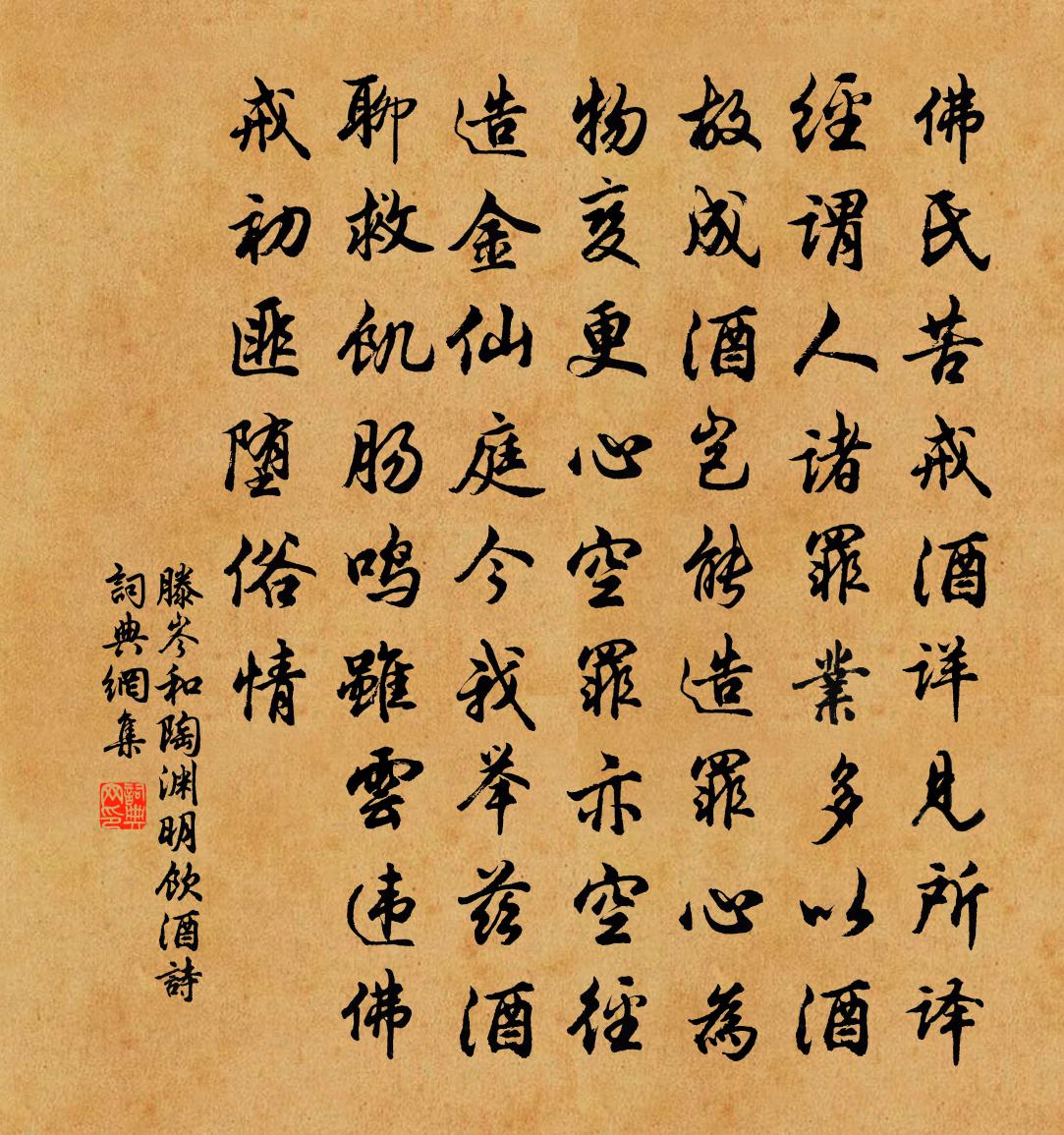 詩詞名句歷史字典書法欣賞書法字典國語詞典說文解字康熙字典古漢語字典標 題 作 者 詩 句 和陶淵明飲酒詩作者:滕岑 朝代:宋代和陶淵明飲酒詩原文佛氏苦戒酒,詳見所譯經。謂人諸罪業,多以酒故成。酒豈能造罪,心為物變更。心空罪亦空,徑造金仙庭。今我舉茲酒,聊救飢腸鳴。雖雲違佛戒,初匪墮俗情。詩詞問答問:和陶淵明飲酒詩的作者是誰?答:滕岑問:和陶淵明飲酒詩寫於哪個朝代?答:宋代滕岑和陶淵明飲酒詩書法欣賞和陶淵明飲酒詩書法作品詩詞推薦陳宮釋智圓〔宋代〕龍盤龍踞景堪尋,王氣消亡信禍淫。結綺臨春何處是,數聲啼鳥暮煙深。晚春即事黃庚〔宋代〕園林芳事歇,風雨暗荒城。轉眼青春過,臨頭白髮生。啼鵑亡國恨,歸鶴故鄉情。三徑多荒草,東還計未成。謁金門盧祖皋〔宋代〕香漠漠。低卷水風池閣。玉腕籠紗金半約。睡濃團扇落。雨後涼生雲薄。女伴棹歌聲樂。採得雙蓮迎笑剝。柳陰多銓瑣方岳〔宋代〕綠漬苔痕蝕斷碑,摩挲名字笑衰遲。雲寒昨夜人何似,雨鎖重門春不知。莫倚離騷堪仆命,從來造物亦兒痴。轉頭歲暮悲詩鮑照〔南北朝〕霜露迭濡潤。草木互榮落。日夜改運周。今悲復如昨。晝色苦沉陰。白雪夜回薄。皦潔冒霜鴈。飄揚出風鶴。天寒詩本乾隆〔清代〕詩本例分上下編,率當一百冊余篇。丁年樂府補空白,戌歲盛京綴帙全。秋月春風景無問,山情水態句捐妍。即今得錢舍人書問眼疾白居易〔唐代〕春來眼暗少心情,點盡黃連尚未平。唯得君書勝得藥,開緘未讀眼先明。相和歌辭。昭君詞佚名〔唐代〕跨鞍今永訣,垂淚別親賓。漢地行將遠,胡關逐望新。交河擁塞路,隴首暗沙塵。唯有孤明月,猶能遠送人。答裴侍御先行至石頭驛以書見招期月滿泛洞庭李白〔唐代〕君至石頭驛,寄書黃鶴樓。開緘識遠意,速此南行舟。風水無定準,湍波或滯留。憶昨新月生,西檐若瓊鉤。今來都門送杜樞院區仕衡〔宋代〕赫赫中興業,黼扆咨明輔。鋒車召黃岩,端笏拜西府。昔簉講筵班,倏接儀曹武。庶幾進讜言,袞職萬一補。璚琚次韻酬清修老方岳〔宋代〕玉堂老作清修記,曾許渠為我輩人。仿佛三生虎溪笑,偶然一見面如春。對雨獨酌韓維〔宋代〕褰簾雨正繁,附火寒已薄。修竹搖清音,芳梅綻朱萼。感此時運駛,對酒成獨酌。多謝枝上禽,飛鳴慰寂寞。子魚方岳〔宋代〕桃花水暖正魚肥,子脹連胞迸腹腴。黃栗玉燖春寸寸,水晶鹽醋粟銖銖。鮫人泣下甘孥戮,龍析刑淫並孕刳。老子守閘書事時已退居五首曹勛〔宋代〕十年壯節下清都,鷁首常辭負弩驅。一棹西來黃篾舫,閘胥指點右樵漁。祁四再赴江南別詩岑參〔唐代〕萬里來又去,三湘東復西。別多人換鬢,行遠馬穿蹄。山驛秋雲冷,江帆暮雨低。憐君不解說,相憶在書題。寄題鎮江寶墨堂晁說之〔宋代〕常潤特令賜吳楚,從此錢氏政相宜。江山閱世無今古,金石何年有合離。小諫縱歌文史外,侍郎決策甲兵期。只尋夏初湖村雜題陸游〔宋代〕幽禽兩兩已成巢,新竹森森漸放梢。稻壟作陂先蓄水,野堂防漏卻添茅。偶然作劉長卿〔唐代〕野寺長依止,田家或往還。老農開古地,夕鳥入寒山。書劍身同廢,煙霞吏共閒。豈能將白髮,扶杖出人間。客思釋紹嵩〔宋代〕欲暮多羈思,客行悲故鄉。背關余古木,落葉墮寒霜。驛樹收殘雨,柴門掩夕陽。此身南復北,雙鬢易蒼浪。漁父詞(寶公)惠洪〔宋代〕來往獨龍岡畔路。杖頭落索間家具。後事前觀如目睹。非讖語。須知一念無今古。長笑老蕭多病苦。笑中與藥皆狼名句推薦經師易求,人師難得。令狐德棻《周書·列傳·卷四十五》 窈窕淑女,君子好逑。佚名《關雎》 養不教,父之過。教不嚴,師之惰。王應麟《三字經·全文》 觸簾風送景陽鍾,鴛被繡花重。顧敻《虞美人·觸簾風送景陽鍾》 何時詔此金錢會,暫醉佳人錦瑟旁。杜甫《曲江對雨》 欲治身,先治心;欲責人,先責己。宋濂、王褘《元史·列傳·卷二》 遙憶獨眠人,早寒驚夢頻。顧貞觀《菩薩蠻·山城夜半催金柝》 何當載酒來,共醉重陽節。孟浩然《秋登蘭山寄張五》 風乍暖,日初長,裊垂楊。陳子龍《訴衷情·春遊》 吳姬越艷楚王妃,爭弄蓮舟水濕衣。王昌齡《採蓮曲二首》