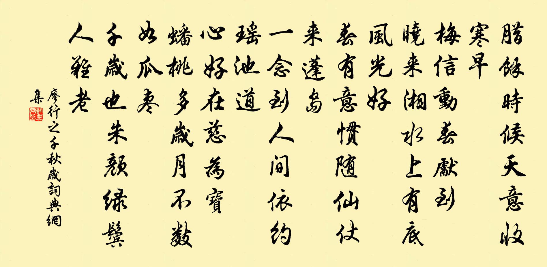 詩詞名句歷史字典書法欣賞書法字典國語詞典說文解字康熙字典古漢語字典標 題 作 者 詩 句 千秋歲作者:廖行之 朝代:宋代千秋歲原文臘餘時候,天意收寒早。梅信動,春先到。曉來湘水上,有底風光好。春有意,慣隨仙仗來蓬島。一念到人間,依約瑤池道。心好在,慈為寶。蟠桃多歲月,不數如瓜棗。千歲也,朱顏綠鬢人難老。詩詞問答問:千秋歲的作者是誰?答:廖行之問:千秋歲寫於哪個朝代?答:宋代問:千秋歲是什麼體裁?答:詞廖行之千秋歲書法欣賞千秋歲書法作品詩詞推薦答賓韋應物〔唐代〕斜月才鑒帷,凝霜偏冷枕。持情須耿耿,故作單床寢。送杜時可歸太學晁公溯〔宋代〕宴安不可懷,百年能幾何。況今五學開,皆以禮為羅。既書內舍籍,天門近嵯峨。雲胡久不歸,滯留蜀江沱。要須文宣王及其弟子贊宋高宗〔宋代〕紀伯子魯,聖學是務。厲己斯的,好問乃裕。周旋中規,容止可度。允矣昔賢,後世所慕。句高似孫〔宋代〕天差鶴管烹茶水,風來花吻煮蟹煙。初至封丘作高適〔唐代〕可憐薄暮宦遊子,獨臥虛齋思無已。去家百里不得歸,到官數日秋風起。石橋太史章〔宋代〕澗底輕雷噴玉泉,石橋僧度是何年。靈峰斗隔人間世,真境潛分洞裡天。施食曾聞龍就掌,談空應有虎當筵。道猷偈頌一百四十一首釋師範〔宋代〕春日晴,黃鶯鳴。山花似錦,汀草如茵。堪悲堪笑,公塘寨裹王節級到處巡捕,自已不知不覺,打失一雙眼睛。玉汝遺橄欖梅堯臣〔宋代〕南國青青果,涉冬知始摘。雖咀澀難任,竟當甘莫敵。來從萬里外,或以苦口擲。所投同木瓜,欲報無瓊璧。送屈突司馬充安西書記錢起〔唐代〕制勝三軍勁,澄清萬里餘。星飛龐統驥,箭發魯連書。海月低雲旆,江霞入錦車。遙知太阿劍,計日斬鯨魚。游峨眉十一首馮時行〔宋代〕薄宦非初志,幽棲有宿期。勝游宜數數,老境已垂開。山好無時見,雲閒逐處隨。誅茅或未可,細路有人知。芭蕉(數歲時作,傳於都下)路德延〔唐代〕一種靈苗異,天然體性虛。葉如斜界紙,心似倒抽書。蘇州十詠其三洞庭山范仲淹〔宋代〕吳山無此秀,乘暇一游之。萬頃湖光里,千家橘熟時。平看月上早,遠覺鳥歸遲。近古誰真賞,白雲應得知。崔五宅送劉跂入京李頎〔唐代〕行人惜寸景,系馬暫留歡。昨日辭小沛,何時到長安。鄉中飲酒禮,客里行路難。清洛雲鴻度,故關風日寒。維將六言雜興陸游〔宋代〕夢裡明明周孔,胸中歷歷唐虞。欲盡致君事業,先求養氣工夫。和丘師悅二首深夜卷剛中〔宋代〕鼓鼙傳永漏,風露結新寒。小爇金初冷,孤斟玉屢乾。感時方自嘆,假寐敢求安。且撥爐中火,清吟琢賢肝。酬淨因長老樓上翫月見懷有疑君魂夢在清都之王安石〔宋代〕道人心與世無求,隱几蕭然在此樓。坐對高梧傾曉月,看翻清露洗新秋。登臨更欲邀元亮,披寫還能擬惠休。顧我舟中夢覺黃載〔宋代〕夢覺三通鼓,連檣聞欠呵。世間半夜後,枕上醒人多。思想從天落,悲嘆奈曉何。南柯莫輕笑,未易到南柯。謝文灝元豐上文藁黃庭堅〔宋代〕虎豹文章非一斑,乳雉五色蜃胎寒。天生材器各有用,相如名獨重太山。風流小謝宣城後,少年如春膽如斗。裕陵木闌花慢 賦白蓮和字舜臣韻凌雲翰〔元代〕悵波翻太液,誰留住,蕊珠仙。向水殿雲廟,玉容花貌,幾度爭鮮。人間延秋無計掩霓裳、猶憶舞便畫裡傾城傾國送峽州推官余靖〔宋代〕決科讎漢策,佐郡得荊關。地勝詩鋒銳,兵銷檄筆閒。路岐高鳥外,城郭白雲間。婉畫應餘刃,何人薦禰還。名句推薦彩袖殷勤捧玉鍾。當年拚卻醉顏紅。晏幾道《鷓鴣天·彩袖殷勤捧玉鍾》 幸遇三杯酒好,況逢一朵花新。朱敦儒《西江月·世事短如春夢》 不可以一時之得意,而自誇其能;亦不可以一時之失意,而自墜其志。馮夢龍《警世通言·卷十七》 招魂楚些何嗟及,山鬼暗啼風雨。元好問《摸魚兒·雁丘詞 / 邁陂塘》 萬樹寒無色,南枝獨有花。道源《早梅》 朝真暮偽何人辨,古往今來底事無。白居易《放言五首·其一》 舊山松竹老,阻歸程。岳飛《小重山·昨夜寒蛩不住鳴》 弱柳青槐拂地垂,佳氣紅塵暗天起。盧照鄰《長安古意》 機中錦字論長恨,樓上花枝笑獨眠。皇甫冉《春思》 藏世界於一粟,佛法何其大;貯乾坤於一壺,道法何其玄。程登吉《幼學瓊林·卷四·釋道鬼神》