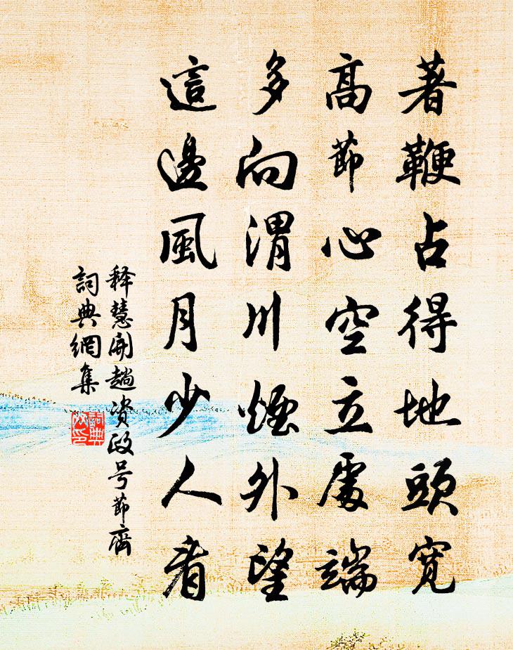 詩詞名句歷史字典書法欣賞書法字典國語詞典說文解字康熙字典古漢語字典標 題 作 者 詩 句 趟資政號節齊作者:釋慧開 朝代:宋代趟資政號節齊原文著鞭占得地頭寬,高節心空立處端,多向渭川煙外望,這邊風月少人看。詩詞問答問:趟資政號節齊的作者是誰?答:釋慧開問:趟資政號節齊寫於哪個朝代?答:宋代釋慧開趟資政號節齊書法欣賞趟資政號節齊書法作品詩詞推薦賀新郎 淮上中秋張野〔元代〕晚*收殘雨。喜晴空、冰輪飛上,月明三五。前歲錢塘江上看,去歲京華容與。今歲又、秋風淮浦。料得常娥應笑隋宮鮑溶〔唐代〕御街多行客,行客悲春風。楚老幾代人,種田煬帝宮。零落池台勢,高低禾黍中。送高三之桂林王昌齡〔唐代〕留君夜飲對瀟湘,從此歸舟客夢長。嶺上梅花侵雪暗,歸時還拂桂花香。遣興陸游〔宋代〕老子從來薄宦情,不辭落魄錦官城。生前猶著幾兩屐,身後更須千載名。樓外雪山森曉色,井邊風葉戰秋聲。一尊小蘇家佚名〔宋代〕雙月謳訁亞輾秋碧,細風斜掩神仙宅。麥門冬長馬鬣青,茱萸蕊綻蠅頭赤。流蘇斗帳懸高壁,彩鳳盤龍繳香額。堂長相思朱敦儒〔宋代〕海雲黃。橘洲霜。如箭灘流石似羊。溪船十丈長。人難量。水難量。過險方知著甚忙。歸休老醉鄉。送蘄春李十九使君赴郡白居易〔唐代〕可憐官職好文詞,五十專城未是遲。曉日鏡前無白髮,春風門外有紅旗。郡中何處堪攜酒,席上誰人解和詩。唯共送嘉州監押曹供奉梅堯臣〔宋代〕舊友尹師魯,嘗作送子文。文存人已歿,行復我何雲。平寺為郡尉,遐方宜撫軍。定過楊雄宅,野鶴自成群。又題牡丹上主人司空孫魴〔唐代〕一年芳勝一年芳,愛重賢侯意異常。手辟紅房看闊狹,自張青幄蓋馨香。白疑美玉無多潤,紫覺靈芝不是祥。只恐次韻宋待制晚春書懷林季仲〔宋代〕春事何曾解有窮,枝頭尋覓漫匆匆。去來燕認誰家戶,開落花因一夜風。萬古英雄殘照里,半生勳業醉魂中。騷人憶秦娥高觀國〔宋代〕棲烏驚。隔窗月色寒於冰。寒於冰。澹移梅影,冷印疏欞。幽香未覺魂先清。無端勾起相思情。相思情。惱人無睡袁術文同〔宋代〕四代司空倚世勞,可嗟不肖事奸豪。妄雲名字與讖合,直欲起應當塗高。周參政惠書唁及亡兒開二首李石〔宋代〕取士平軒鑒,吾兒死布衣。招魂荒草墓,冤鬼泣松扉。推挽無遺力,擠排已覺非。存亡佩陳誼,舍此更誰歸。贈右台監察鄧茂遷左台殿中劉懷一〔唐代〕惟昔參多士,無雙仰異才。鷹鸇同效逐,鵷鷺忝游陪。入仕光三命,遷榮歷二台。隔牆欽素躅,對問限清埃。紫署挽吳郎中程珌〔宋代〕志抗金堅厲,材成玉粹溫。時哉非不遇,命也更奚言。季子風流遠,吳公治行存。敬亭無恙否,愁絕暮雲昏。謝南平王賜山雞齊己〔唐代〕五色文章類彩鸞,楚人羅得半摧殘。金籠莫恨傷冠幘,玉粒頒慚剪羽翰。孤立影危丹檻里,雙棲伴在白雲端。上台浪淘沙曾覿〔宋代〕一線海門來。雪噴雲開。崑山移玉下瑤台。捲地西風吹不斷,直到蓬萊。羯鼓譟春雷。鼉舞蛟回。歌樓鼓吹夕陽催送真上人還蘭若崔峒〔唐代〕得道雲林久,年深暫一歸。出山逢世亂,乞食覺人稀。半偈初傳法,中峰又掩扉。愛憎應不染,塵俗自依依。仙人李賀〔唐代〕彈琴石壁上,翻翻一仙人。手持白鸞尾,夜掃南山雲。鹿飲寒澗下,魚歸清海濱。當時漢武帝,書報桃花春。甜羹陸游〔宋代〕山廚薪桂軟炊粳,旋洗香蔬手自烹。從此八珍俱避舍,天蘇陀味屬甜羹。名句推薦泥上偶然留指爪,鴻飛那復計東西。蘇軾《和子由澠池懷舊》 爆竹聲中一歲除,春風送暖入屠蘇。王安石《元日》 砌下落花風起,羅衣特地春寒。馮延巳《清平樂·雨晴煙晚》 千門萬戶曈曈日,總把新桃換舊符。王安石《元日》 丈夫非無淚,不灑離別間。陸龜蒙《別離》 暗教愁損蘭成,可憐夜夜關情張炎《清平樂·候蛩淒斷》 鐵衣霜露重,戰馬歲年深。戎昱《塞下曲·其六》 思歸若汾水,無日不悠悠。李白《太原早秋》 最喜小兒亡賴,溪頭臥剝蓮蓬。辛棄疾《清平樂·村居》 花氣襲人知驟暖,鵲聲穿樹喜新晴。陸游《村居書喜》