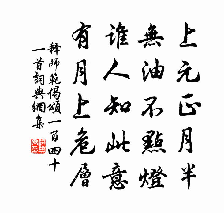 詩詞名句歷史字典書法欣賞書法字典國語詞典說文解字康熙字典古漢語字典標 題 作 者 詩 句 偈頌一百四十一首作者:釋師範 朝代:宋代偈頌一百四十一首原文上元正月半,無油不點燈。誰人知此意,有月上危層。詩詞問答問:偈頌一百四十一首的作者是誰?答:釋師範問:偈頌一百四十一首寫於哪個朝代?答:宋代釋師範偈頌一百四十一首書法欣賞偈頌一百四十一首書法作品詩詞推薦和僧嘯雲雙插法藏寺韻柴元彪〔宋代〕我來扣角二峰前,此寺因知五百年。草木尚涵唐雨露,鍾魚猶鎮宋山川。世情蒼狗浮雲外,客思孤鴻落日邊。閒拂雜詠 鏡台謝朓〔南北朝〕玲瓏類丹檻。苕亭似玄闕。對鳳懸清冰。垂御覽作乘。龍掛明月。照粉拂紅妝。插花理雲發。玉顏徒自見。常畏君鷓鴣天晏幾道〔宋代〕小玉樓中月上時。夜來惟許月華知。重簾有意藏私語,雙燭無端惱暗期。傷別易,恨歡遲。歸來何處驗相思。沈郎望隔牆花詩劉孝威〔南北朝〕隔牆花半隱,猶見動花枝。當由美人摘,詎止春風吹。偈頌二十五首釋如淨〔宋代〕結卻衲僧布袋頭,天童拈來作氣毬。腳尖趯出佛無數,付與叢林作馬牛。句劉鏜〔宋代〕村橋日落市聲散,山路月明人語歸。路逢楊嘉猷赴官嚴州徐照〔宋代〕詩合誠齋意,難將片石鐫。相逢歷在道,惜別未移船。野步僧同話,宵吟吏廢眠。思君還有夢,前到釣台邊。鄭德予同游桃花山次韻朱槔〔宋代〕江村卜築路斜斜,模寫癯仙四壁家。聞道讀書忘肉味,不緣避世宿桃花。青山自作千年調,白眼空驚一望賒。欲買抄書陸游〔宋代〕書生書習氣重書見書喜欲書狂。搗櫱書潢剡藤,辛苦補散亡。且作短檠伴,未暇名山藏。故家借簽帙,舊友餉朱黃湖亭釋文珦〔宋代〕一堤楊柳青絲輭,百頃芙蕖錦障開。中有閒人心似水,坐看沙鳥鏡中來。望蓬萊王吉昌〔元代〕真火運,五藏氣煎烹。陽伏六陰潛變化,化精為髓血為精。白乳體生成。元神聚,朝現保身榮。金骨換形形不朽,頌古二十六首釋嗣宗〔宋代〕舒無蹤,卷無跡,日午晴空轟霹靂。衲子驚迷失路頭,神號鬼哭知何極。自贊項安世〔宋代〕將軍下筆枉施功,羽箭賢冠事不同。桐柏宮中狂道士,枚回洲上病漁翁。夏日雜詠劉應龜〔宋代〕一片閒雲墮野塘,晚風吹浪溼菰蔣。白鷗不受人間暑,長向荷花共雨涼。荊南簽判向和卿用予六言見惠次韻奉酬四首黃庭堅〔宋代〕仕宦初不因人,富貴方來逼身。要是出群拔萃,乃成威鳳祥麟。東郊別業耿湋〔唐代〕東皋占薄田,耕種過餘年。護藥栽山刺,澆蔬引竹泉。晚雷期稔歲,重霧報晴天。若問幽人意,思齊沮溺賢。蟬徐集孫〔宋代〕高蹈槐梢與柳陰,爭鳴直到日西沉。初無識見偏容喙,不讀詩書卻好吟。風露細餐雖足飽,山林為計更宜深。所談南鄉子(重陽日寄懷永康彭道微使君,用坡舊韻)黃庭堅〔宋代〕臥稻雨余收。處處遊人簇遠洲。白髮又扶紅袖醉,戎州。亂折黃花插滿頭。青眼想風流。畫出西樓一幀秋。還把去真州驛文天祥〔宋代〕山川如識我,故舊更無人。 俯仰干戈跡,往來車馬塵。 英雄遺算晚,天地暗愁新。 北首燕山路,淒涼夜向晨陳伯順夫婦輓詞林亦之〔宋代〕晴春相見未多時,忽嘆霜蕪雪屋非。僵瑟樓前方悼往, * 台下竟同歸。讀書歷歷向秋樹,織錦悠悠空曉機。須信名句推薦浮雲終日行,遊子久不至。杜甫《夢李白二首·其二》 觀天下書未遍,不得妄下雌黃。顏之推《顏氏家訓·勉學篇》 悵望千秋一灑淚,蕭條異代不同時。杜甫《詠懷古蹟五首·其二》 千里之行,始於足下。老子《老子·德經·第六十四章》 觀人以言,美於黼黻、文章荀子《荀子·非相》 飛流直下三千尺,疑是銀河落九天。李白《望廬山瀑布》 惟上惟己,去表求實,奸者自見矣。來俊臣《羅織經·察奸卷第八》 一樹斜陽蟬更咽,曾綰灞陵離別納蘭性德《淡黃柳·詠柳》 老母與子別,呼天野草間。李白《豫章行》 相見情已深,未語可知心。李白《相逢行二首》