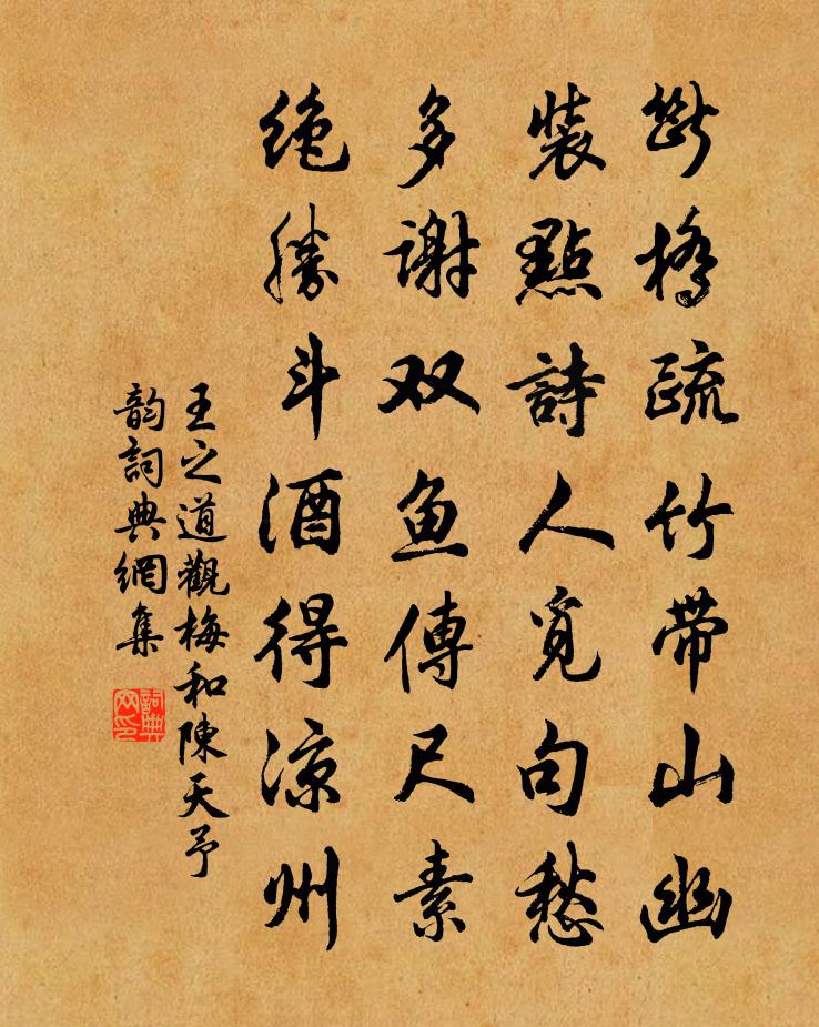 詩詞名句歷史字典書法欣賞書法字典國語詞典說文解字康熙字典古漢語字典標 題 作 者 詩 句 觀梅和陳天予韻作者:王之道 朝代:宋代觀梅和陳天予韻原文斷橋疏竹帶山幽,裝點詩人覓句愁。多謝雙魚傳尺素,絕勝斗酒得涼州。詩詞問答問:觀梅和陳天予韻的作者是誰?答:王之道問:觀梅和陳天予韻寫於哪個朝代?答:宋代王之道觀梅和陳天予韻書法欣賞觀梅和陳天予韻書法作品詩詞推薦贈陳師道黃庭堅〔宋代〕陳侯學詩如學道,又似秋蟲噫寒草。日晏腸鳴不俛眉,得意古人便忘老。君不見向來河伯負兩河,觀海乃知身一蠡柳閎展如子瞻甥也其才德甚美有意於學故以桃黃庭堅〔宋代〕任世萬鈞重,載言以為軒。空文誤來世,聖達欲無言。鹹池浴日月,深宅養靈根。胸中浩然氣,一家同化元。雜詠四首王安石〔宋代〕故畦拋汝水,新壟寄鍾山。為問揚州月,何時照我還。酹江月姬翼〔元代〕功名富貴,似無繩縛盡、英雄豪傑。古往今來同影戲,頃刻存亡興滅。羅綺妻孥,畫堂金玉,招感人窺竊。繁華妝宿中竺碧梧軒林季仲〔宋代〕夢破初驚枕簟秋,懶思身世獨搔頭。山禽強欲知人事,葉底移時語未休。答王卿送別韋應物〔唐代〕去馬嘶春草,歸人立夕陽。元知數日別,要使兩情傷。偶成釋善珍〔宋代〕長年狎樵牧,門外即荒郊。瘦草牛羊路,高松鸛鶴巢。病來勤習定,老去懶尋交。常愧逃名者,深山自縛茆。賦得春風扇微和豆盧榮〔唐代〕春晴生縹緲,軟吹和初遍。池影動淵淪,山容發蔥蒨。遲遲入綺閣,習習流芳甸。樹杪颺鶯啼,階前落花片。韶光新樓詩二十首·重台蓮李紳〔唐代〕綠荷舒捲涼風曉,紅萼開縈紫菂重。游女漢皋爭笑臉,二妃湘浦並愁容。自含秋露貞姿結,不競春妖冶態穠。終恐思患吟邵雍〔宋代〕仆奴凌主人,夷狄犯中國。自古知不平,無由能絕得。書事寄良長老陸游〔宋代〕素屏烏幾野人廬,山色蒼寒十月初。雨足四郊耕欲遍,霜高萬木脫無餘。一尊窗下澆愁酒,數卷床頭引睡書。寄語送包通判兼寄滕季度葉適〔宋代〕風雨逍遙地,衙排印簏新。鈿車分路闊,寶瑟聽歌頻。燈市曉侵月,花田晚占春。卻過張翰宅,方信有閒人。侍宴臨芳殿詩江總〔隋代〕鍾箭自徘徊。皇堂薦羽杯。橋平疑水落。石迥見山開。林前暝色靜。花處近香來。西嵫傷撫夕。北閣濫游陪。在滁苦雨歸桃花崦傷親友略盡顧況〔唐代〕廢棄忝殘生,後來亦先夭。詩人感風雨,長夜何時曉。去國宦情無,近鄉歸夢少。庇身絕中授,甘靜忘外擾。麗景同曼叔諸君登醴泉觀凝碧亭韓維〔宋代〕門前車馬塵,當晝塞昏霧。安知此亭上,秋色生四顧。黃花散晴陽,赤葉變寒露。境非遊覽舊,人得朋從素。樂幽中秋無月呈審知趙蕃〔宋代〕前年中秋月,痁鬼方見虐。徹曙不得眠,搘爐親煮藥。子時過橋來,勞我非赴約。評詩雜精粗,有味勝大嚼。去年記夢陸游〔宋代〕少日飛揚翰墨場,憶曾上疏動高皇。寧知老作功名夢,十萬全裝入晉陽?途中有懷駱賓王〔唐代〕眷然懷楚奏,悵矣背秦關。涸鱗驚照轍,墜羽怯虛彎。素服三川化,烏裘十上還。莫言無皓齒,時俗薄朱顏。將歸趙汝績〔宋代〕拄笏西山一笑中,掛帆猶及棟花風。此身可是屠羊說,餘事寧非失馬翁。不問鬢毛成早白,免將痴面發羞紅。故人寒夜宋祁〔宋代〕孤客傷時晏,遙帷對夜分。虛輪抱初月,側陣捲歸雲。霜蕙披寒穎,陂鳧叫暝群。村砧與營杵,不寐最先聞。名句推薦雙燕飛來,陌上相逢否?撩亂春愁如柳絮。馮延巳《鵲踏枝·幾日行云何處去》 江送巴南水,山橫塞北雲王勃《江亭夜月送別二首》 鳳凰台上鳳凰游,鳳去台空江自流。李白《登金陵鳳凰台》 主闇於上,臣詐於下,滅亡無日荀子《荀子·君道》 日日思君不見君,共飲長江水。李之儀《卜運算元·我住長江頭》 冰,水為之,而寒於水。荀子《勸學》 太高人愈妒,過潔世同嫌。曹雪芹《紅樓夢·第五回》 小人者其未得也,則憂不得;既已得之,又恐失之。是以有終身之憂,無一日之樂也。荀子《荀子·子道》 風波不信菱枝弱,月露誰教桂葉香李商隱《無題·重幃深下莫愁堂》 輕舟泛月尋溪轉,疑是山陰雪後來李白《東魯門泛舟二首》