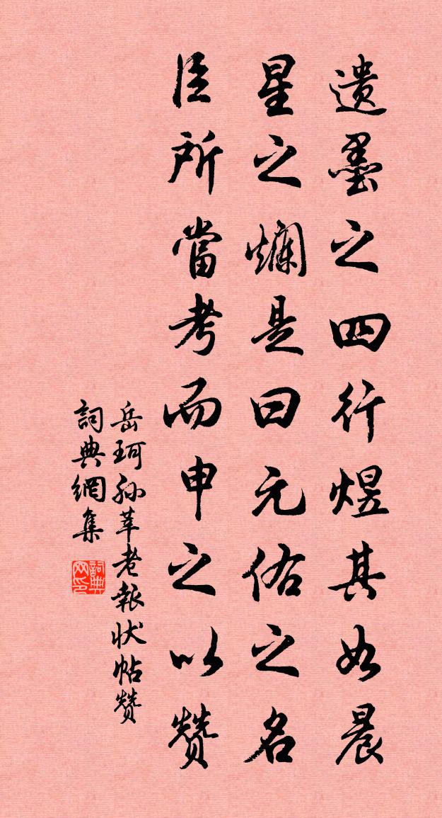 詩詞名句歷史字典書法欣賞書法字典國語詞典說文解字康熙字典古漢語字典標 題 作 者 詩 句 孫莘老報狀帖贊作者:岳珂 朝代:宋代孫莘老報狀帖贊原文遺墨之四行,煜其如晨星之爛。是曰元佑之名臣,所當考而申之以贊。詩詞問答問:孫莘老報狀帖贊的作者是誰?答:岳珂問:孫莘老報狀帖贊寫於哪個朝代?答:宋代岳珂孫莘老報狀帖贊書法欣賞孫莘老報狀帖贊書法作品詩詞推薦元夕葛天民〔宋代〕天街夜鼓徹雲霄,一望星河影動搖。佳節無如元夕盛,老懷不似少年豪。紅塵巷陌青絲鞚,明月樓台紫玉簫。誰料下第趙嘏〔唐代〕南溪抱瓮客,失意自懷羞。晚路誰攜手,殘春自白頭。山居雪後二首楊萬里〔宋代〕春近能余幾許寒,雪花才落便銷殘。青松梢上蘭根下,猶得三朝兩日看。洞庭晚望七首高善濂〔宋代〕擊汰涼風水面回,偃虹堤上夕陽開。含漿老蜌浮光起,迎棹神鴉舞翅回。醉唱難尋漁笛樂,羈懷易動暮笳哀。何能次韻馬季思禁體雪二首蘇泂〔宋代〕庭樹曉毿毿,行空馬脫驂。瑞臻平地尺,白見一年三。照眼花猶散,齊腰話可參。岑樓尋勝賞,溪泛此何慚。茅山贈洪(一作贈高洪)拾遺方乾〔唐代〕新地諫臣停諫舌,求歸故里傲雲霞。溪頭講樹纜漁艇,篋里朝衣輸酒家。但愛身閒辭祿俸,那嫌歲計在桑麻。我來賓暘來飲秀山予醉小跌次韻為吳體方回〔宋代〕無冰為水柘為漿,深入醉鄉心自涼。微官誤身魚中餌,俗士縛禮龜搘床。未妨賣書笑杜甫,寧能食乳羨張蒼。顛崖題道成上人院黃滔〔唐代〕花宮城郭內,師住亦清涼。何必天台寺,幽禪瀑布房。簟舒湘竹滑,茗煮蜀芽香。更看道高處,君侯題翠梁。題李氏山亭徐璣〔宋代〕斗建魁星地,城隅李氏亭。竹高隨路有,山靜隔 * 。人在雲間語,潮生戶外汀。憑高一長望,疑欲人滄溟。送裴員外往江南李嘉祐〔唐代〕公務江南遠,留歡幕下榮。楓林緣楚塞,水驛到湓城。岸草知春晚,沙禽好夜驚。風帆幾度泊,處處暮潮聲。人間詞話七則王國維〔清代〕有有我之境,有無我之境。“淚眼問花花不語,亂紅飛過鞦韆去。”“可堪孤館閉春寒,杜鵑聲里斜陽暮。”有我六月十七夜出寺門驟有所聞疑水與風即而觀之趙蕃〔宋代〕驟得疑傾峽,徐行若泛潮。胡為隔田畝,而不度林椒。爽氣雖能及,作波不可招。不眠如有待,衝口漫成謠。上喻史君重建霞起堂六首陳夢建〔宋代〕玉泉天上古仙伯,曾吏五雲書閣來。寄語家人須修我,有時騎鶴過丹台。《綺疏遺恨》之刀唐寅〔明代〕鳳頭交股雪花鑌,剪斷吳淞江水渾;只有相思淚難剪,舊痕才斷接新痕。呈潘潭州十首趙蕃〔宋代〕江邊石上白皚皚,遠對難分李與梅。因是欲占春早晚,桃花一樹有新開。題崇蘭圖二首陳與義〔宋代〕奕奕天風吹角巾,松聲水色一時新。冊林從此不牢落,照影溪頭共六人。鵲橋仙王惲〔元代〕沉酣往古。棲遲衡宇。*有弓招此舉。長林豐草野麋心,是中散、生平自許。日邊草賦。矛頭炊黍。誰道閒雲有雨紅梅 十三王冕〔元代〕昭陽殿里 * ,香隔瓊簾映淺紅。翠袖擁雲扶不起,玉簫吹過小樓東。過彭蠡口董嗣杲〔宋代〕雲凝入港大孤山,蘆荻翻風秋夕寒。水急亂從彭蠡出,來舟不似去舟難。送陳魯叟使君赴廣西漕劉克莊〔宋代〕闔郡留無計,匆匆奪父師。使君三月政,遺老百年思。遠宦生華髮,輕裝載舊碑。海山應有恨,未得謝公詩。名句推薦陰壑生虛籟,月林散清影杜甫《游龍門奉先寺》 秋聲萬戶竹,寒色五陵松。李頎《望秦川》 昨夜星辰昨夜風,畫樓西畔桂堂東。李商隱《無題·昨夜星辰昨夜風》 未知生,焉知死?孔子弟子《論語·先進篇》 穿針人在合歡樓,正月露、玉盤高瀉。嚴蕊《鵲橋仙·碧梧初出》 桃花流水窅然去,別有天地非人間。李白《山中問答》 野雲萬里無城郭,雨雪紛紛連大漠。李頎《古從軍行》 出師一表通今古,夜半挑燈更細看。陸游《病起書懷》 謹養勿勞,並氣積力。佚名《百戰奇略·第十卷·養戰》 今宵酒醒何處?楊柳岸,曉風殘月。柳永《雨霖鈴·寒蟬淒切》