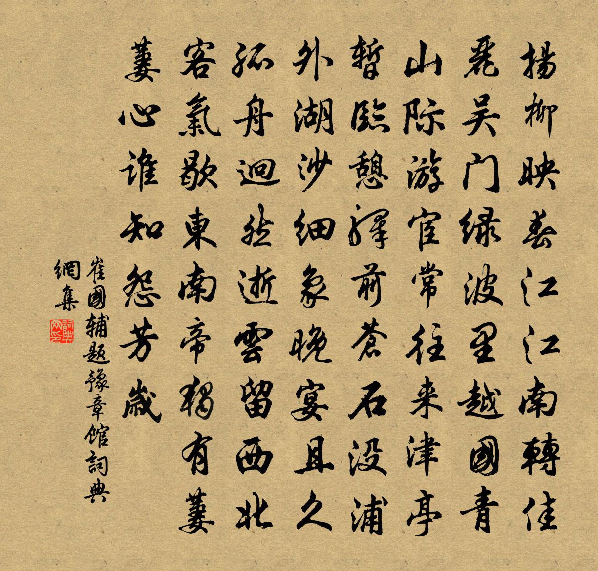 詩詞名句歷史字典書法欣賞書法字典國語詞典說文解字康熙字典古漢語字典標 題 作 者 詩 句 題豫章館作者:崔國輔 朝代:唐代題豫章館原文揚柳映春江,江南轉佳麗。吳門綠波里,越國青山際。遊宦常往來,津亭暫臨憩。驛前蒼石沒,浦外湖沙細。象晚宴且久,孤舟迥然逝。雲留西北客,氣歇東南帝。獨有萋萋心,誰知怨芳歲。詩詞問答問:題豫章館的作者是誰?答:崔國輔問:題豫章館寫於哪個朝代?答:唐代問:題豫章館是什麼體裁?答:五排崔國輔題豫章館書法欣賞題豫章館書法作品注釋全唐詩詩文賞析 與酤:一作興酣。何肯相救援:一作何處肯相救。詩詞推薦舶使王會溪太守趙見泰九日領客枉顧山中賦采蒲壽宬〔宋代〕百年豈非長,流光迅飛電。月渚愁濱鴻,風檐淒去燕。鴻燕胡獨乖,參辰豈相見。念此霜中英,良時不妨殿。哭韋大夫之晉杜甫〔唐代〕悽愴郇瑕色,差池弱冠年。丈人叨禮數,文律早周旋。台閣黃圖裡,簪裾紫蓋邊。尊榮真不忝,端雅獨翛然。貢喜送徐仲洪尉南安八首彭龜年〔宋代〕催科莫作擾人看,趁此登場早了官。坐視貪殘敗吾子,不如自放一分寬。再用前韻各賦三解吳潛〔宋代〕赤米炊香兩鼻噴,白鹽不用置牢盆。家家已了收藏計,物物何知造化恩。衣褐寬來姑喚婦,垣墉補處祖將孫。江鄉偈頌十二首釋如淨〔宋代〕晷運推移,日南長至。眼睛裡放光,鼻孔里出氣。飽飯快活屙一堆,超過瞿曇親授記。小重山佚名〔宋代〕竹里清香簾影明。一枝照水弄精神。樓頭橫管罷龍吟。休三弄,留為與調羹。紫陌與青門。溪邊浮動處,絕纖塵。次韻趙尉梅句方岳〔宋代〕冰雪之晨草木屯,南枝亦有未招魂。一愁泥就孤山骨,正恐詩談太不根。元日立春袁說友〔宋代〕春入簾幃線幾添,更隨桃茢快新瞻。曉看密密輕絲墮,晚作纖纖細雨兼。可喜田家余谷粟,也應澤國飽魚鹽。年豐山居雜詩九十首曹勛〔宋代〕歲華念將晚,寒色慘中抱。昔年困虀鹽,撥灰吟苦調。老來適其適,所樂在燕笑。招賓共一醉,圍爐不妨小。碧霄泉李彌遜〔宋代〕山根山清泉,雲自九天落。風潮帶江腥,天黑魚龍泊。何當寸雲敷,一灑偏寥廓。滄浪勿復歌,吾纓久已濯。菩薩蠻王安中〔宋代〕玉纖傳酒浮香菊。菊香浮酒傳纖玉。弦管沸歡筵。筵歡沸管弦。出簾珠袖蔌。蔌袖珠簾出。眉暈淺山低。低山淺暈玉井亭觀白蓮二首楊萬里〔宋代〕紅芙蕖雜白芙蕖,紅底終稠白底疏。速折當頭一蓮葉,莫令遮卻雪肌膚。送淳丞上虞樓鑰〔宋代〕我老不復仕,行將掛衣冠。兩子俱貳令,官職恰一般。剡川且書考,上虞亦之官。人言易捧檄,歸奉重親歡。我意秋思白玉蟾〔宋代〕滴盡池荷無奈雨,吹翻井葉可憐風。溪毛山骨猶無恙,尚有蘆花對蓼紅。蓬萊閣閒望寫懷張伯玉〔宋代〕越絕開 * ,姚虞啟後昆。昔聞句允霸,今作帝王藩。地得東南重,山侔岳瀆尊。平湖來萬壑,翠袖列千門。市井酬余求之二首裘萬頃〔宋代〕枕中久已黃粱熟,鏡里從教白髮垂。但得漁樵分半席,此生何必要人知。休假還舊業便使王維〔唐代〕〔一作盧象詩〕謝病始告歸。依依入桑梓。家人皆佇立。相候衡門裡。時輩皆長年。成人舊童子。上堂嘉慶畢。顧賀新郎劉克莊〔宋代〕吾少多奇節。頗揶揄、玉關定遠,壺頭新息。一劍防身行萬里,選甚南溟北極。看塞雁、銜來秋色。不但槊棋夸妙挽宜人李氏曾豐〔宋代〕養成中饋德,留與後人言。翰墨其餘事,詩書蓋上根。不徒為大母,猶復見曾孫。蕭瑟堂前意,青蔥雨後萱。淳祐祭海神十六首佚名〔宋代〕[宮一曲]堪興之間,最鉅惟瀛。包乾括坤,吐日滔星。祀典載新,禮樂孔明。鑒吾嘉賴,來燕來寧。名句推薦杜漸防萌,慎之在始。房玄齡《晉書·列傳·第六十八章》 長亭路,年去歲來,應折柔條過千尺。周邦彥《蘭陵王·柳》 馬穿山徑菊初黃,信馬悠悠野興長。王禹偁《村行·馬穿山徑菊初黃》 事莫貴乎有驗,言莫棄乎無徴。徐幹《中論·上卷·貴驗》 上林苑裡花徒發,細柳營前葉漫新。杜審言《春日京中有懷》 儻寄相思字,愁人定解顏。錢起《送夏侯審校書東歸》 扈蹕老臣身萬里,天寒來此聽江聲!陸游《龍興寺吊少陵先生寓居》 舉杯互敬屠蘇酒,散席分嘗勝利茶。 * 《元旦口占用柳亞子懷人韻》 想文君望久,倚竹愁生步羅襪。姜夔《八歸·湘中送胡德華》 士為知己者死,女為悅己者容。劉向《戰國策·趙一·晉畢陽之孫豫讓》