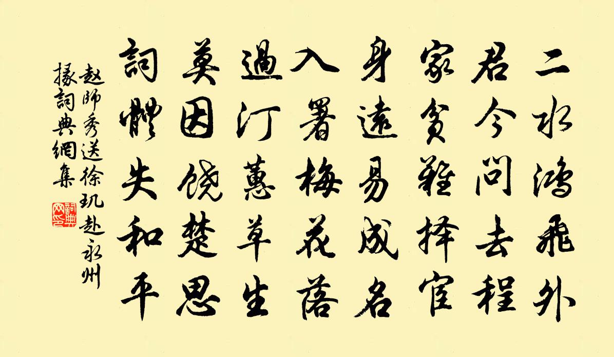 詩詞名句歷史字典書法欣賞書法字典國語詞典說文解字康熙字典古漢語字典標 題 作 者 詩 句 送徐璣赴永州掾作者:趙師秀 朝代:宋代送徐璣赴永州掾原文二水鴻飛外,君今問去程。家貧難擇宦,身遠易成名。入署梅花落,過汀蕙草生。莫因饒楚思,詞體失和平。詩詞問答問:送徐璣赴永州掾的作者是誰?答:趙師秀問:送徐璣赴永州掾寫於哪個朝代?答:宋代趙師秀送徐璣赴永州掾書法欣賞送徐璣赴永州掾書法作品詩詞推薦送絕粒僧施肩吾〔唐代〕碧洞青蘿不畏深,免將饑渴累禪心。若期野客來相訪,一室無煙何處尋。送同年張正臣赴海陵幕強至〔宋代〕早年登甲選,從事又東藩。地與淮流絕,城連海氣昏。好山供健筆,暇日樂清樽。多著太平策,歸來奏帝閽。吟社遞至詩卷足十四韻以答之為梅水村發也趙必象〔宋代〕對梅日一醉,無酒如梅何。塵世獨醒人,卑之毋甚高。香林四首陳與義〔宋代〕丈人延客非俗物,百和香中進一杯。乞取齊奴錦步障,與春遮斷曉風來。石帆夏日陸游〔宋代〕短棹飄然信所之,茶園漁市到無時。風從苹末蕭蕭起,月過花陰故故遲。蓴菜煮羹吳舊俗,竹枝度曲楚遺辭。頗聞生查子朱翌〔宋代〕宮紗蜂趁梅,寶扇鸞開翅。數折聚清風,一捻生秋意。搖搖雲母輕,裊裊瓊枝細。莫解玉連環,怕作飛花墜。次韻題畫卷四首其四西塞風雨蘇轍〔宋代〕雨細風斜欲暝時,淩波一葉去安歸。遙知夜宿蛟人室,浪卷波分不著衣。送僧之嚴釋智愚〔宋代〕對薄方話蘿窗底,又握山藤破曉煙。領取桐江到家句,子規啼在月明前。送沖公謁六祖道場汪應辰〔宋代〕直指嶺頭路,寧論幾日回。尋春有訊息,寄我一枝梅。蘇幕遮 曲江上,看月華澄淨,有個鳥飛潛真子〔元代〕燦燦明,天河曲。蚌上光輝,內長娑羅木。卯兔千年毛似玉。陰里生陽,只要人知悟。日中鳥烏,生三足。陽內藏清明日賜百僚新火王濯〔唐代〕御火傳香殿,華光及侍臣。星流中使馬,燭耀九衢人。轉影連金屋,分輝麗錦茵。焰迎紅蕊發,煙染綠條春。助律即事吟邵雍〔宋代〕事到患來頻,何由得任真。就新須果敢,從善莫因循。盜亦自有道,人而或不仁。義緣無定體,安處是行身。五貺詩太湖硯皮日休〔唐代〕求於花石間,怪狀乃天然。中瑩五寸劍,外差千疊蓮。月融還似洗,雲濕便堪研。寄與先生後,應添內外篇。偈頌一百零二首釋紹曇〔宋代〕判虛空筆,摛錦繡文。光騰萬太,入石三分。惡跡既被點破,只得飲氣吞聲。自有傍人道不平。早秋月夜雍陶〔唐代〕身閒伴月夜深行,風觸衣裳四體輕。為見近來天氣好,幾篇詩興入秋成。寄情(一作許渾代作)佚名〔唐代〕春風白馬紫絲韁,正值蠶娘未採桑。五夜有心隨暮雨,百年無節抱秋霜。重尋繡帶朱藤合,卻忍羅裙碧草長。為報賀新郎(再和)李處全〔宋代〕心事知誰許。政吾曹、摛辭弄翰,邀涼蠲暑。節物於人俱可喜,今夕渠偏媚嫵。笑曝腹、書生風度。河鼓天孫非世五哀詩李牧司馬光〔宋代〕椎牛饗壯士,拔距養奇材。虜帳方驚避,秦金已闇來。旌旗移幕府,荊棘蔓叢台。部曲依稀在,猶能話郭開。送虞丞相撫蜀宋孝宗〔宋代〕一德如公豈合閒,聊分西面欲憂寬。不辭論道虛台席,暫假宣威築將壇。風教已興三蜀靜,干戈載戢萬方安。歸來風流子 秋郊射獵納蘭性德〔清代〕平原草枯矣,重陽後,黃葉樹騷騷。記玉勒青絲,落花時節,曾逢拾翠,忽聽 * 。今來是、燒痕殘碧盡,霜影亂名句推薦照野瀰瀰淺浪,橫空隱隱層霄。蘇軾《西江月·頃在黃州》 相逢成夜宿,隴月向人圓。杜甫《宿贊公房》 冷艷全欺雪,余香乍入衣。丘為《左掖梨花》 清江一曲抱村流,長夏江村事事幽。杜甫《江村》 宜未雨而綢繆,毋臨渴而掘井。朱柏廬《朱子家訓·全文》 君子贈人以言,庶人贈人以財。荀子《荀子·大略》 自古明王聖帝,猶須勤學,況凡庶乎!顏之推《顏氏家訓·勉學篇》 天迥雲垂草,江空雪覆沙劉基《古戍》 鐘山抱金陵,霸氣昔騰發。李白《登梅岡望金陵贈族侄高座寺僧中孚》 但見淚痕濕,不知心恨誰。李白《怨情》