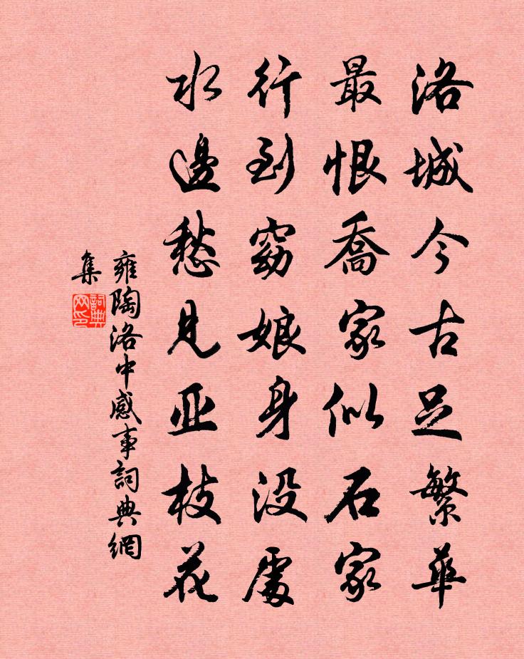詩詞名句歷史字典書法欣賞書法字典國語詞典說文解字康熙字典古漢語字典標 題 作 者 詩 句 洛中感事作者:雍陶 朝代:唐代洛中感事原文洛城今古足繁華,最恨喬家似石家。行到窈娘身沒處,水邊愁見亞枝花。詩詞問答問:洛中感事的作者是誰?答:雍陶問:洛中感事寫於哪個朝代?答:唐代問:洛中感事是什麼體裁?答:七絕雍陶洛中感事書法欣賞洛中感事書法作品注釋全唐詩:卷518-98詩詞推薦寄張先郎中王安石〔宋代〕留連山水住多時,年比馮唐未覺衰。篝火尚能書細字,郵筩還肯寄新詩。胡床月下知誰對,蠻榼花前想自隨。投老謝朱宜中隸字葉茵〔宋代〕隸法如公有典刑,拙中藏巧混天成。因觀體制超前輩,旋辟軒窗乞扁名。氣象晉人遒且勁,源流漢刻古而清。得來吊瑞新和尚梅堯臣〔宋代〕示化何悲戚,俱焚只衲衣。已隨原火盡,空見野雲飛。寫影誰方丈,栽松舊翠微。當年渡江缽,弟子獨將歸。張明遠自持其所居萃勝亭記來求詩為賦三篇馮時行〔宋代〕文章蓋代手,千載柳柳州。落筆記山水,奇香撼琳球。開卷一再續,宛若從之游。歷歷爽心目,毛髮為颼颼。若人柳梢青·與龜翁登研意觀雪懷癸卯歲臘朝斷橋並馬之游吳文英〔宋代〕斷夢遊輪。孤山路杳,越樹陰新。流水凝酥,征衫沾淚,都是離痕。玉屏風冷愁人。醉爛漫、梅花翠雲。傍夜船回郭帥遺蕨羹劉過〔宋代〕書生窮無食肉相,老不能官猶崛強。一杯紫蕨江西羹,萬戶封侯猶未當。主人幕下三千士,談王說伯如蜂起。日日踏雲行王處一〔元代〕一得沖和,重觀幽勝。烏飛兔走交相應。化成天理任縱橫,丹爐萬道金光迸。開度諸天,祝邀真聖。升騰發顯如如煉丹台吳通〔宋代〕我尋陶隱居,山中多古蹟。青障撫清泉,白雲抱蒼壁。入經碎玉橋,便是幽人宅。仙人昔煉丹,嶙嶒一卷石。俯視彭德器北堂太夫人輓詩張元乾〔宋代〕早歲嫠居久,儒家守志貧。白頭躬祭祀,老眼喜縫紉。哭婦無遺恨,憐孫不忍嗔。一朝違孝養,力疾叫蒼旻。九日陰雨不止病中把酒示諸子三首蘇轍〔宋代〕九日不能飲,呦呦覺胃寒。妻孥勸把盞,萸菊正堆盤。懶極久成病,年高終鮮歡。道人嫌服藥,心息自相安。建溪十詠其九延平津楊億〔宋代〕積水深無際,神龍此屈蟠。媚川珠彩動,射鬥劍光寒。燕脯誰能寄,犀燈豈易看。負書當瑞聖,何若蟄洪瀾。寓嘆陸游〔宋代〕人生各自有窮通,世事寧論拙與工。裹馬革心空許國,不龜手藥卻成功。早朝玉勒千門雪,夜坐蓬窗萬壑風。借得挽趙東岩簡叔彥侯四首王邁〔宋代〕已矣東岩不憗遺,年來雅道日陵夷。臞儒得似顏徒幾,良吏能為結輩誰。此老清修如玉悄,當官懇惻念茅茨。可伶臣龍瀑布陳文蔚〔宋代〕登陟百險艱,來看雲間瀑。飛從千仞峰,瀉作一條玉。冬夏有盈縮,古今無斷續。當日武夷翁,翩然來結屋。宿鄭州王維〔唐代〕朝與周人辭。暮投鄭人宿。他鄉絕儔侶。孤客親僮僕。宛洛望不見。秋霖晦平陸。田父草際歸。村童雨中牧。主人夜述張鎡〔宋代〕客去情宜獨,宵長睡未忺。露多應冒砌,香重欲蒸簾。較利真誰得,耽書肯自嫌。爐存金粟火,煨蕷不須添。奉和李右相賞會昌林亭孫逖〔唐代〕賢相初陪蹕,靈山本降神。作京雄近縣,開閣寵平津。地勝林亭好,時清宴賞頻。百泉縈草木,萬井布郊畛。德與楊柳枝白居易〔唐代〕前有別楊柳枝,夢得繼和有“春盡絮飛”之句。又復戲答。柳老春深日又斜,任他飛向別人家。誰能更學孩童戲,三峽歌陸游〔宋代〕萬州溪西花柳多,四鄰相應竹枝歌。問君今夕不痛飲,奈此滿川明月何!詠史鄭獬〔宋代〕漢家行賞盡論功,禍福於人豈易窮。解把舊恩酬項伯,獨將大義斬丁公。名句推薦過橋分野色,移石動雲根。賈島《題李凝幽居》 世事茫茫難自料,春愁黯黯獨成眠。韋應物《寄李儋元錫》 自春來、慘綠愁紅,芳心是事可可。柳永《定風波·自春來》 素富貴,行乎富貴;素貧賤,行乎貧賤子思《中庸·第十四章》 桃花潭水深千尺,不及汪倫送我情。李白《贈汪倫》 玉人初上木蘭時。懶妝斜立澹春姿。吳文英《浣溪沙·題李中齋舟中梅屏》 方以類聚,物以群分佚名《易傳·繫辭傳上·第一章》 明日隔山嶽,世事兩茫茫。杜甫《贈衛八處士》 坑灰未冷山東亂,劉項原來不讀書。章碣《焚書坑》 寄語天涯客,輕寒底用愁。于謙《除夜太原寒甚》