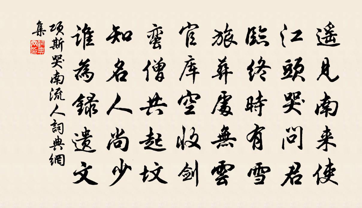詩詞名句歷史字典書法欣賞書法字典國語詞典說文解字康熙字典古漢語字典標 題 作 者 詩 句 哭南流人作者:項斯 朝代:唐代哭南流人原文遙見南來使,江頭哭問君。臨終時有雪,旅葬處無雲。官庫空收劍,蠻僧共起墳。知名人尚少,誰為錄遺文。詩詞問答問:哭南流人的作者是誰?答:項斯問:哭南流人寫於哪個朝代?答:唐代問:哭南流人是什麼體裁?答:五律項斯哭南流人書法欣賞哭南流人書法作品注釋全唐詩:卷554-41詩詞推薦偈頌六十五首釋普濟〔宋代〕地水水風先佛記,冷灰堆里無舍利。掃向長江白浪中,千古萬古第一義。入建平界二首楊萬里〔宋代〕漂水南頭接建平,丫頭兒子便勤耕。疏麻大豆已前輩,蕎麥晚菘初後生。席捲千山為一囿,天憐春種賜秋成。不如招桐柏李道士葛閎〔宋代〕海嶺重重接紫虛,高人還肯敞仙裾。玉蟾點滴有清露,少費研朱寫道書。戲作陸游〔宋代〕歸臥元知作餓夫,宦遊依舊是臞儒。免教妻子爭粳秫,秋稼連雲一棱無。和韓無咎使君吊李謫仙章甫〔宋代〕力士能令妃子嗔,長安無復謫仙人。宮袍卻換江東酒,野乳終為帝外臣。孤冢道旁空怨結,兩峰煙際自愁顰。騎鯨乾明節祝聖壽四錫〔宋代〕聖節思歸會帝京,得隨班列祝文明。河清見底為嘉瑞,海水無波表太平。月夜忽聞仙樂奏,宮中時有彩雲生。詩成江南道中王之道〔宋代〕江回山崦兩三家,招颭東風酒旆斜。羸馬送曛行自急,峭寒欺客晚還加。日邊雁足應傳信,竹外梅梢合放花。指點簡單周二子胡寅〔宋代〕音塵疎闊思悠哉,有底匆匆不我來。陣合鸛鵝須敵手,詩成珠玉要奇才。新荷雨定如蘭馥,曲沼風閒作鏡開。況是倚聲制曲三首張耒〔宋代〕不恨因緣不恨天,強持牙板向◇前。陽關一曲動山月,別淚千行盈酒船。薄命有情今已矣,傍人無意亦悽然。願君四十年前元夕與故人夜遊得此句蘇軾〔宋代〕午夜朧朧淡月黃,夢回猶有暗塵香。縱橫滿地霜槐影,寂寞蓮燈半在亡。寄張祜(祜亦未面,頻寄聲相聞)李群玉〔唐代〕越水吳山任興行,五湖雲月掛高情。不游都邑稱平子,只向江東作步兵。昔歲芳聲到童稚,老來佳句遍公卿。如君蕭宅二三子贈答詩二十首石答竹盧仝〔唐代〕石報孤竹君,此客甚高調。共我相共痴,不怕主人天下笑。我非蛺蝶兒,我非桃李枝。不要兒女撲,不要春風吹。山舍張耒〔宋代〕蕭蕭山舍靜,誰復與相親。琴酒忘塵事,詩書有古人。歲豐民事少,地闢土風淳。聊樂身無事,功名喪我真。浪淘沙·九曲黃河萬里沙劉禹錫〔唐代〕九曲黃河萬里沙,浪淘風簸自天涯。如今直上銀河去,同到牽牛織女家。武康縣治松桂林二首袁說友〔宋代〕詩競山川秀,亭隨草木新。弦歌魯言偃,吏隱漢梅真。淇苑雪霜操,廣寒宮殿春。相望不百里,一葦要身親。徐教下第歸釋善珍〔宋代〕奏賦長安不遇知,丈夫失意肯生悲。科名自古與風漢,造物至今猶小兒。道在布韋輕將相,時危耕釣隱英奇。渡江寒食程公許〔宋代〕賣餳簫咽紙鳶飛,愁思驚隨節物來。誓墓可能同逸少,操音誰復憫鍾儀。松楸此日空瞻望,桃李當年奉宴嬉。投老百牛圖趙文〔宋代〕浮沉隱見各從容,不借山童尺箠功。一梨春雨吾事濟,何用嘖嘖多牛翁。楊子禮輓詩魏了翁〔宋代〕事業古人詩,寒鐙耿夜篝。正青諸老眼,枉白一生頭。犖确秋難熟,崦嵫日易收。可憐鴻影斷,老淚滴監州。次丁嘉會韻二首陳造〔宋代〕塵里清風忽滿襟,詩成正始識遺音。才輕餘子今文舉,氣壓諸豪復季心。棋罷蠟燈銜燼暗,酒闌庭樹挾霜吟。百年名句推薦落花水香茅舍晚,斷橋頭賣魚人散。馬致遠《壽陽曲·遠浦帆歸》 人生得意須盡歡,莫使金樽空對月。李白《將進酒》 晚妝初了明肌雪,春殿嬪娥魚貫列。李煜《木蘭花·晚妝初了明肌雪》 形勝三分國,波流萬世功。潘大臨《江間作四首·其三》 君思潁水綠,忽復歸嵩岑。李白《送裴十八圖南歸嵩山二首》 觀棋不語真君子,把酒多言是小人。馮夢龍《醒世恆言·卷九》 深林人不知,明月來相照。王維《竹里館》 江淮度寒食,京洛縫春衣。王維《送綦毋潛落第還鄉 / 送別》 千里澄江似練,翠峰如簇。王安石《桂枝香·登臨送目》 偏皎潔,知他多少,陰晴圓缺。徐有貞《中秋月·中秋月》