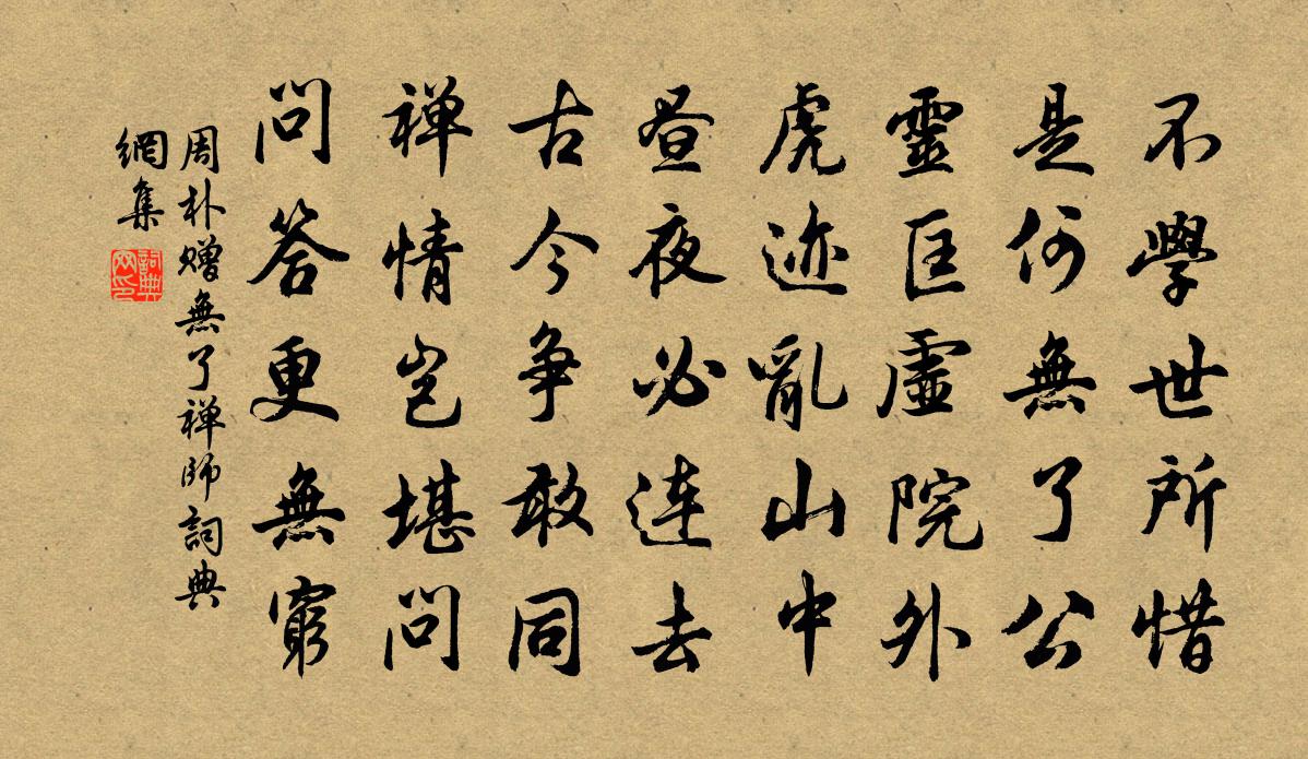 詩詞名句歷史字典書法欣賞書法字典國語詞典說文解字康熙字典古漢語字典標 題 作 者 詩 句 贈無了禪師作者:周朴 朝代:唐代贈無了禪師原文不學世所惜,是何無了公。靈匡虛院外,虎跡亂山中。晝夜必連去,古今爭敢同。禪情豈堪問,問答更無窮。詩詞問答問:贈無了禪師的作者是誰?答:周朴問:贈無了禪師寫於哪個朝代?答:唐代問:贈無了禪師是什麼體裁?答:五律周朴贈無了禪師書法欣賞贈無了禪師書法作品注釋全唐詩:卷673_15詩詞推薦二十四詩品司空圖〔唐代〕畸人乘真,手把芙蓉,泛彼浩劫,窅然空縱。月出東□,好風相從,太華夜碧,人聞清鍾。虛佇神素,脫然畦封,貧女曲陳舜俞〔宋代〕貧女四十無人問,不傅鉛華水梳鬢。非關顏色不如人,不肯出門羞失身。零落床頭舊機杼,池水漚麻還織布。布成晚游陸游〔宋代〕垣屋參差出,溝溪曲折通。亂鴉空際黑,落日竹間紅。軋軋輿竿語,搖搖旛腳風。吾行本無定,隨意入空濛。君子泉李申子〔宋代〕□岩峭□色斕斑,雲葉煙蘿□□□鬟。疑有仙琚時會集,唾珠霏屑落人間。人月圓 吳門懷古 北曲聊樂府前集今張可久〔元代〕山藏 * 雲藏寺,池上老梅枝。洞庭歸興,香柑紅樹,鱸膾銀絲。白家池館,吳王花草,長似坡詩。可人憐處,啼冬至後過吳張二子檀溪別業孟浩然〔唐代〕卜築因自然,檀溪不更穿。園廬二友接,水竹數家連。直取南山對,非關選地偏。卜鄰依孟母,共井讓王宣。曾是皇雅十首《耆武》三章尹洙〔宋代〕耆武定功,時惟二方。淮服其乂,海南遂荒。孰孱而盭,孰暴而猖。自底不譓,乃終滅亡。假日山行釋正覺〔宋代〕平生胸中雲外峰,有閒便與扶瘦筇。但知一世丘壑味,想得十分猿鳥從。明見秋容山洗雨,清可人意風吟松。歸來納火禮祀大辰十二首佚名〔宋代〕庶功備矣,休德昭明。天地醣和,在鬯斯清。玉瓚以酌,瑤觴載盈。周流常羊,來燕來寧。偈頌一百二十三首釋普度〔宋代〕徑山一椀上元燈,不是攢花剪簇成。等閒拈起當陽掛,爍破諸方鬼眼睛。和謝吏部鐵字韻三十四首游山三首鄧肅〔宋代〕門前如市不入耳,忘言隱几心如水。紛華時逐長安兒,清爽何似毛錐子。我雖事業未如人,天公不等吾弗嗔。獨步古圓鏡顧逢〔宋代〕翠剝青銅面,年深入手輕。似教藏美惡,不欲大分明。細雨波心碎,浮雲月底行。便令無點翳,誰解照前生。寄空上人曹勛〔宋代〕華頂峰頭空侍者,家在全閩九峰下。後山妙香今始聞,西江一口元非假。可但枯木已陽艷,更喜淮碑仍續雅。天風晨起陸游〔宋代〕海燕翩將乳,戎葵粲己繁。魚船初入市,蒪擔未過門。年耄停朝課,家貧省小餐。所欣行藥處,秧稻遍村村。旅火錢時〔宋代〕湖邊車馬日提壺,有眼何曾識野蔬。肯為肌羸忘內味,孰雲醫國世間無。橫吹曲辭關山月盧照鄰〔唐代〕塞垣通碣石,虜障抵祁連。相思在萬里,明月正孤懸。影移金岫北,光斷玉門前。寄書謝中婦,時看鴻雁天。堅老師相訪誦法華經如流李石〔宋代〕八十童顛抹霜雪,琉璃碧眼蓮華舌。不將象步蹴驢騾,坐與如來過小劫。震山岩曹訓〔宋代〕岩靜塵埃了不侵,公閒出郭喜登臨。雲山兀兀自朝暮,江水茫茫無古今。鷗鷺翩翩明遠目,漁樵歌唱動歸心。綠楊大眾仰觀釋印肅〔宋代〕多身一體少人知,不體無空自執迷。除非妙達斯三昧,個裹圓觀始不疑。倪秀才惠橄欖二首趙蕃〔宋代〕直道堪嗟故不容,更持諫味欲誰從。昏昏度日惟貪睡,茗椀聊充午後供。名句推薦夢入藍橋,幾點疏星映朱戶。吳文英《荔枝香近·七夕》 一寸相思一寸灰。蘇軾《南鄉子·集句》 明朝又是孤舟別,愁見河橋酒幔青。竇叔向《夏夜宿表兄話舊》 奇外無奇更出奇,一波才動萬波隨。元好問《論詩三十首·二十二》 對此懷素心,千里共明月德隱《新秋晚眺》 戰士軍前半死生,美人帳下猶歌舞。高適《燕歌行》 心以啟智,智以啟財,財以啟眾,眾以啟賢,賢之有啟,以王天下。姜子牙《六韜·武韜·三疑》 悔既往之失,亦要防將來之非。洪應明《菜根譚·概論》 二十餘年如一夢,此身雖在堪驚。陳與義《臨江仙·夜登小閣憶洛中舊遊》 酒能成事,酒能敗事施耐庵《水滸傳·第四回》
