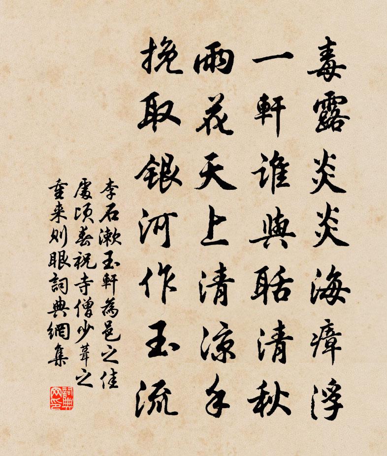 詩詞名句歷史字典書法欣賞書法字典國語詞典說文解字康熙字典古漢語字典標 題 作 者 詩 句 漱玉軒為邑之佳處頃春祝寺僧少葺之重來則眼作者:李石 朝代:宋代原文毒露炎炎海瘴浮,一軒誰與聒清秋。雨花天上清涼手,挽取銀河作玉流。詩詞問答問:《漱玉軒為邑之佳處頃春祝寺僧少葺之重來則眼》的作者是誰?答:李石問:該詩寫於哪個朝代?答:宋代書法欣賞漱玉軒為邑之佳處頃春祝寺僧少葺之重來則眼書法作品詩文賞析【原題】:漱玉軒為邑之佳處頃春祝寺僧少葺之重來則眼界增明矣因拉王和叟劉曼卿相與碎建茗瀹之泉上石作觀音像通悟禪師手琢亦甚靈異賦三絕詩詞推薦過嚴瀨寄陸守務觀喻良能〔宋代〕翰墨場中老伏波,揮毫快馬下晴坡。三年睿主思獻納,千里疲民賴撫摩。瀟灑郡齋方在望,飄搖征棹未能過。擬求始晴至城東別墅二首方回〔宋代〕逾月黃梅雨,河流屢溢涯。蟻宮危智伯,螢燭困欒巴。忽喜迎初日,猶嫌見早霞。淡晴城外路,緩馬過荷花。喜遷鶯(福唐平盪海寇宴犒將士席上作)曾覿〔宋代〕七閩形勝。鎮南紀會府,山川交映。簫鼓喧天,綺羅盈市,不負四時風景。共喜太平無事,豈料潢池不逞。殄群醜與李叔夔錢子云同遊興教寺約齊都巡劉黻〔宋代〕古寺壞壁存菩提,又有達磨蒼龍如。我來問訊若舊積,宇宙中間真蘧廬。朋儕邂逅誰親疏,秋風相對一笑醵。杯行虞美人·波聲拍枕長淮曉蘇軾〔宋代〕波聲拍枕長淮曉,隙月窺人小。無情汴水自東流,只載一船離恨向西州。竹溪花浦曾同醉,酒味多於淚。誰教風鑒梅關李龍高〔宋代〕南窺海嶺北江津,截斷青山客路塵。千載子真應冷笑,吾儂不是守門人。迷神引 貶玉溪,對不山作晁補之〔宋代〕黯黯青山紅日暮。浩浩大江東注。餘霞散綺,向煙波路。使人愁,長安遠,在何處。幾點漁燈小,迷近塢。一片客洪澤守閘和二十二弟韻晁說之〔宋代〕小舟洪澤嘆嗟余,欲說人間孰得如。蝙蝠倒懸徒頡頏,獼猴徐步謾趑趄。歲窮雲際行求雁,日暮溪頭坐羨魚。何處題陸放翁詩卷樓鑰〔宋代〕妙畫初驚渴驥奔,新詩熟讀嘆微言。四明知我豈相屬,一水思君誰與論。茶灶筆床懷甫里,青鞋布襪想雲門。何當寄尚顏師吳融〔唐代〕僧中難得靜,靜得是吾師。到闕不求紫,歸山只愛詩。臨風翹雪足,向日剃霜髭。自嘆眠漳久,雙林動所思。送賈島及鍾渾姚合〔唐代〕日日攻詩亦自強,年年供應在名場。春風驛路歸何處,紫閣山邊是草堂。憶江南馮延巳〔唐代〕今日相逢花未發,正是去年,別離時節。東風次第有花開,恁時須約卻重來。重來不怕花堪折,只怕明年,花發人融州老君洞敕賜真仙岩之圖杜應然〔宋代〕古號黔南今號融,真仙第一勝高嵩。仙關標榜門增麗,聖像威靈民名崇。帝賜御書藏寶閣,天生石像老仙翁。瓶爐自遣四首張耒〔宋代〕是非得失一區區,蚊蚋啾啾共一壺。不學退之求羽翼,惟憑一夢到華胥。政和鹿鳴宴五首佚名〔宋代〕首善京師,灼於四方。孫我髦士,金玉其相。飲酒樂曲,吹笙鼓簧。勉武徒御,觀國之光。清明陳與義〔宋代〕雨晴閒步澗邊沙,行入荒林聞亂鴉。寒食清明驚客意,暖風遲日醉梨花。書生投老王官谷,壯士偷生漂母家。不用偶作釋智圓〔宋代〕急急西落日,浩浩東去波。日落波不停,浮生能幾何。青雲身未上,白髮頭已多。金印未佩腰,道路成蹉跎。一朝頌古一百二十一首釋宗杲〔宋代〕眼中無翳休挑刮,鏡上無塵不用磨。信腳出門行大路,橫擔拄杖唱山歌。山花子(春暮)劉辰翁〔宋代〕東風解手即天涯。曲曲青山不可遮。如此蒼茫君莫怪,是歸家。閶闔相迎悲最苦,英雄知道鬢先華。更欲徘徊春尚草亭遠望鄭剛中〔宋代〕酴醿試玉在新條,風肅朝陽宿霧消。侵曉不知花有露,清寒惟覺夢無聊。名句推薦想雁空、北落冬深,澹墨晚天雲闊。吳文英《暗香疏影·夾鍾宮賦墨梅》 佳節又重陽,玉枕紗廚,半夜涼初透。李清照《醉花陰·薄霧濃雲愁永晝》 琴書倦,鷓鴣喚起南窗睡。謝逸《千秋歲·詠夏景》 勤苦守恆業,始有數月糧。黃燮清《秋日田家雜詠》 十分不耐煩,乃為人大病;一味學吃虧,是處事良方。王永彬《圍爐夜話·第五四則》 學問無大小,能者為尊。李汝珍《鏡花緣·第二十三回》 路逢險處須迴避,事到臨頭不自由。佚名《增廣賢文·上集》 相尋夢裡路,飛雨落花中。晏幾道《臨江仙·鬥草階前初見》 馬作的盧飛快,弓如霹靂弦驚。辛棄疾《破陣子·為陳同甫賦壯詞以寄之》 雪消門外千山綠,花發江邊二月晴。歐陽修《春日西湖寄謝法曹歌》