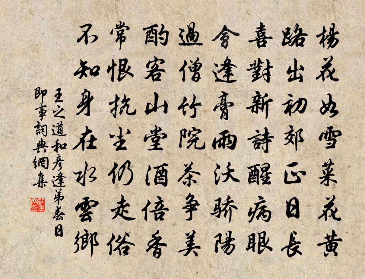 詩詞名句歷史字典書法欣賞書法字典國語詞典說文解字康熙字典古漢語字典標 題 作 者 詩 句 和彥逢弟春日即事作者:王之道 朝代:宋代和彥逢弟春日即事原文楊花如雪菜花黃,路出初郊正日長。喜對新詩醒病眼,會逢膏雨沃驕陽。過僧竹院茶爭美,酌客山堂酒倍香。常恨抗塵仍走俗,不知身在水雲鄉。詩詞問答問:和彥逢弟春日即事的作者是誰?答:王之道問:和彥逢弟春日即事寫於哪個朝代?答:宋代王之道和彥逢弟春日即事書法欣賞和彥逢弟春日即事書法作品詩詞推薦頌古三十八首釋慧方〔宋代〕風信不來春色老,卻憶後園驢吃草。滿天明月贈行人,野客溪邊歸路早。黃雀鄭獬〔宋代〕啾啾蓋黃雀竹間蓋飛,日晚蓋復歸枝上蓋棲。雪粒蓋地三寸玉,地膚凍裂不作泥。錦韝公子臂蒼鶻,快馬踏下黃雲減字木蘭花·春情王安國〔宋代〕畫橋流水。雨濕落紅飛不起。月破黃昏。簾里餘香馬上聞。徘徊不語。今夜夢魂何處去。不似垂楊。猶解飛花入洞寄贈田倉曹灣楊巨源〔唐代〕芳蘭媚庭除,灼灼紅英舒。身為陋巷客,門有絳轅車。朝覽夷吾傳,暮習潁陽書。眄雲高羽翼,待賈蘊璠璵。纓弁春遊陸游〔宋代〕右軍不復見清真,賞會猶須我輩人。幽夢斷時雞唱曉,短章成處鳥呼春。出山茶筍村墟鬧,上市蓴鱸七筋新。速覓寄朝宗二首吳芾〔宋代〕湖水春來拍岸平,山光幻出小蓬瀛。幽深未許凡人到,只待君來共落成。續古二十九首陳陶〔唐代〕大堯登寶位,麟鳳煥宸居。海曲沾恩澤,還生比目魚。生值揖遜歷,長歌東南春。釣鰲年三十,未見天子巡。軒轅依韻和王安之卿六老詩仍見率成七邵雍〔宋代〕六翁誰讓少年場,老不羞不任意狂。同向靜中觀物動,共於閒處看人忙。天心月滿蟾蜍動,水面風微{上艹下函}和崔侍御日用游開化寺閣吳少微〔唐代〕左憲多才雄,故人尤鷙鶚。護贈單于使,休軺太原郭。館次厭煩歊,清懷尋寂寞。西緣十里餘,北上開化閣。初入獨旦蕈次九五從叔韻樓鑰〔宋代〕朝菌晦朔雖不知,食之實冠東南味。庾郎二十有七品,一見流涎驚絕異。擷蔬剪韮皆可卻,味苦應無夏蟲避。大阮夜聞雪聲鄭剛中〔宋代〕怒號中夜忽收聲,枯葉寒梢細細鳴。曉起一杯檐外立,滿階無處認梅英。六月十七夜出寺門驟有所聞疑水與風即而觀之趙蕃〔宋代〕昨日真聊爾,今宵頗快哉。無嫌雨腳短,故喜旱頭開。一飽歸天賜,群凶勿幸災。誰驅霹靂駕,更起阿香雷。宮詞張公庠〔宋代〕二月猶塞水有雷,江梅纏謝小桃開。宮娥不放珠簾下,待得東風送燕來。禁中庭樹錢惟演〔宋代〕紫闥分陰地,凡條擢秀時。高枝接溫樹,密葉覆辛夷。夜影瑤光接,晨英玉露滋。乘春好封殖,為賦角弓詩。崔十六少府攝伊陽,以詩及書見投,因酬三十韻韓愈〔唐代〕崔君初來時,相識頗未慣。但聞赤縣尉,不比博士慢。賃屋得連牆,往來忻莫間。我時亦新居,觸事苦難辦。蔬飧挽劉中遠侍郎史堯弼〔宋代〕精神曾感會,帝念老臣餘。內閣升嚴直,褒章賜命書。同時那得有,回首卻成虛。露電從渠過,吾游自物初。南海第七十五文天祥〔宋代〕開帆駕洪濤,血戰乾坤赤。風雨聞號呼,流涕灑丹極。夜行船侯善淵〔元代〕設誓明言衷腸話。棄般般物情俱舍。心口相違,不分真假。把玄門返成功價。縱意為非難勸化。業深大罪愆無舍。送白糍與囊山老子王邁〔宋代〕東坡以春筍,名為玉版師。我獨謂玉版,正可名白糍。吃筍令人瘦,吃糍充人飢。慧眼曰不然,不如飲水肥。句張釜〔宋代〕賴有好山供客眼。名句推薦愛人者必見愛也,而惡人者必見惡也。墨子《墨子·16章 兼愛(下)》 靄芳陰未解,乍天氣、過元宵。周端臣《木蘭花慢·送人之官九華》 試玉要燒三日滿,辨材須待七年期。白居易《放言五首·其三》 一年三百六十日,多是橫戈馬上行。戚繼光《馬上作》 殘燈明滅枕頭欹,諳盡孤眠滋味。范仲淹《御街行·秋日懷舊》 我家洗硯池邊樹,朵朵花開淡墨痕。王冕《墨梅》 凡道字,重且舒。勿急疾,勿模糊。李毓秀《弟子規·信》 名豈文章著,官應老病休。杜甫《旅夜書懷》 玲瓏骰子安紅豆,入骨相思知不知。溫庭筠《南歌子詞二首 / 新添聲楊柳枝詞》 逃生不避路,到處便為家。施耐庵《水滸傳·第三回》