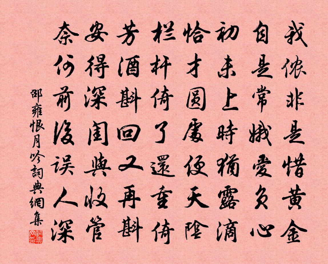 詩詞名句歷史字典書法欣賞書法字典國語詞典說文解字康熙字典古漢語字典標 題 作 者 詩 句 恨月吟作者:邵雍 朝代:宋代恨月吟原文我儂非是惜黃金,自是常娥愛負心。初未上時猶露滴,恰才圓處便天陰。欄桿倚了還重倚,芳酒斟回又再斟。安得深閨與收管,奈何前後誤人深。詩詞問答問:恨月吟的作者是誰?答:邵雍問:恨月吟寫於哪個朝代?答:宋代邵雍恨月吟書法欣賞恨月吟書法作品詩詞推薦雞菜嶺李洪〔宋代〕煙雨濛濛不濕衣,春風欺客逞寒威。籃輿無著新愁處,小酌村醪款竹扉。醉落魄(荔枝)韓元吉〔宋代〕霓裳弄月。冰肌不受人間熱。分明密露枝枝結。碧樹珊瑚,容易與君折。玉環舊事誰能說。迢迢驛路香風徹。故人曹山寺釋晦山〔宋代〕千年荷玉紫雲蟠,偶翳浮塵影欲寒。不是老人重著力,雨花洞口棘漫漫。和鮑倅吳芾〔宋代〕彯纓誰不是王臣,抗志如今有幾人。墜典固嘗深探討,頹綱猶未許彌綸。擬歸舊隱消殘臘,旋買新田作好春。聖主送劉繼鄴秀才歸當塗梅堯臣〔宋代〕鵷雛始出巢,欲矜五色羽。乃見郡鴟盤,壤中將有取。梧桐與竹實,安得在平土。所趣固已殊,而何不遠舉。幸失有懷施文叔寄之趙蕃〔宋代〕超果寺前江抱村,數株喬木擁山門。先生得酒日成醉,不負春風野外昏。點絳唇(庚戌生日)程大昌〔宋代〕春草池塘,茸茸短碧通芳信。更饒華潤。不解膏霜鬢。池上詩翁,別帶超遙韻。陽和進。香苞翠暈。物物皆沾分。夢遊仙/戚氏張鎡〔宋代〕驂鸞侶,嬌小怯雲期。柳戲花游能幾日,頓拋塵幻學希夷。清夢到瑤池。霞袂穩,那顧縷金衣。自與長生分姓譜,次韻顏運使伏龍山諸葛祠堂二首項安世〔宋代〕羽扇白綸巾,堂堂六尺身。我評秦漢下,宇宙只斯人。宰予晝寢佚名〔唐代〕宰予晝寢,子曰:“朽木不可雕也,糞土之牆不可圬也!於予與何誅?”子曰:“始吾於人也,聽其言而信其行;偈頌七十一首釋了惠〔宋代〕明星照得眼睛穿,眼睛覷得明星落。夜半依前是子時,敢保不曾成正覺。送曹深叟之越趙汝鐩〔宋代〕幾時重握手,未可便輕離。路指千岩去,程寬一月期。捫蘿窺禹穴,剝蘚讀曹碑。必自蘭亭過,方當春暮時。奉使契丹二十八首 傷足蘇轍〔宋代〕少年謬聞道,直往寡所疑。不知避礙險,造次逢顛危。中歲飽憂患,進退每自持。長存鄙夫計,未免達士嗤。前日折檻行杜甫〔唐代〕嗚呼房魏不復見,秦王學士時難羨。青衿胄子困泥塗,白馬將軍若雷電。千載少似朱雲人,至今折檻空嶙峋。婁公楊花宛轉曲馬祖常〔元代〕空中遊絲已無賴,宛轉楊花猶百態。隨風撲帳拂香奩,度水點衣縈錦帶。輕薄顛狂風上下,燕子鶯兒各新嫁。釵頭次韻舉老見嘲未歸石湖范成大〔宋代〕半世吟客舍柳,長年憶後園花。為報廬山莫笑,雲丘今屬誰家失題四首曾國藩〔清代〕蜒雨蠻煙日日催,側身周望重低徊。海濱膏血深無極,帳下笠歌自莫哀。安得賈生時痛哭,可憐楊仆本庸才。投章秋思白玉蟾〔宋代〕萬蠢懼寒皆向蟄,千岩涼風舞黃葉。雨痕印水如撮纈,蟲聲入夜如彈鑷。酒澆心緒轉悽愴,帶減腰圍增瘦怯。夢向宴崔明府宅夜觀妓孟浩然〔唐代〕畫堂觀妙妓,長夜正留賓。燭吐蓮花艷,妝成桃李春。髻鬟低舞席,衫袖掩歌唇。汗濕偏宜粉,羅輕詎著身?調移和柳子玉喜雪次韻仍呈述古蘇軾〔宋代〕詩翁愛酒長如渴,瓶盡欲沽囊已竭。燈青火冷不成眠,一夜捻須吟喜雪。詩成就我覓歡處,我窮正與君仿佛。曷不名句推薦雷雨窈冥而未半,皦日籠光於綺寮。左思《三都賦》 今朝有酒今朝醉,明日愁來明日愁。羅隱《自遣》 吹燈窗更明,月照一天雪。袁枚《十二月十五夜》 蘭帳玉人睡覺,怪春衣、雪沾瓊綴。章楶《水龍吟·燕忙鶯懶芳殘》 不聞不若聞之,聞之不若見之,見之不若知之,知之不若行之。荀子《荀子·儒效》 迢遞路回清野,人語漸無聞,空帶愁歸周邦彥《夜飛鵲·河橋送人處》 離愁不管人飄泊。年年孤負黃花約。黃機《憶秦娥·秋蕭索》 八年十二月,五日雪紛紛。白居易《村居苦寒》 憶昔花間相見後,只憑縴手,暗拋紅豆。歐陽炯《賀明朝·憶昔花間相見後》 留戀海棠顏色、過清明。張輯《南歌子·柳戶朝雲濕》