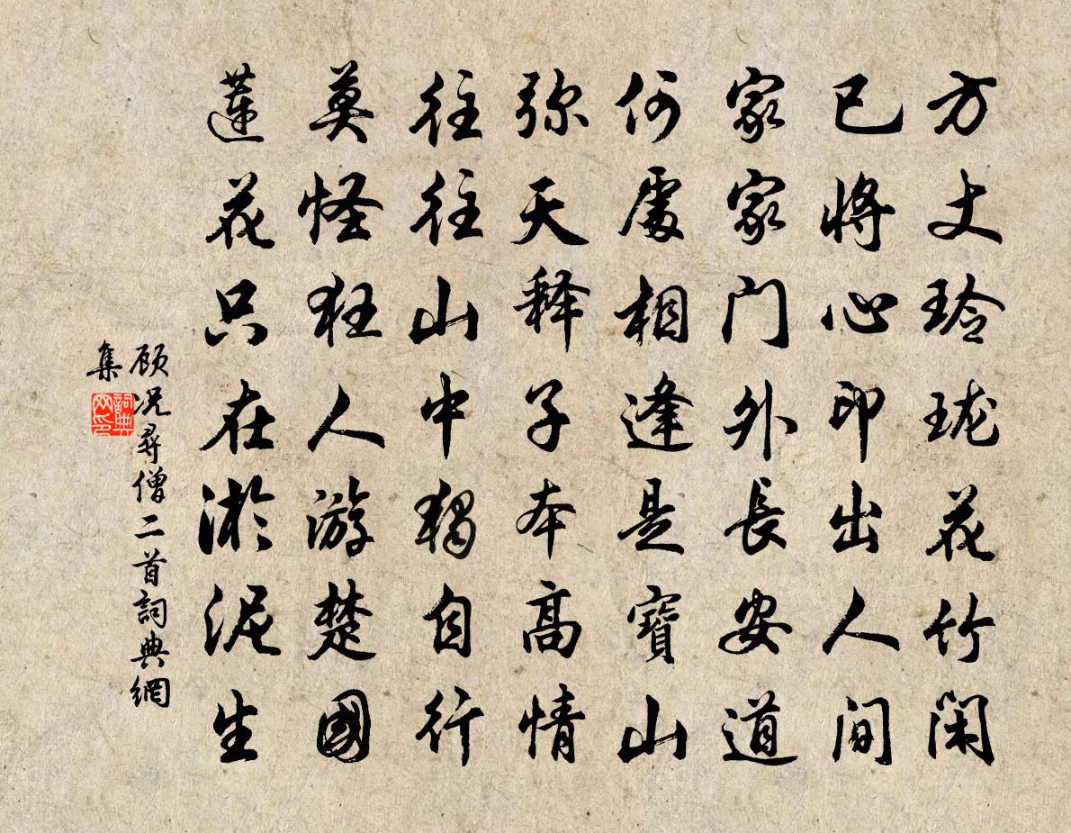 詩詞名句歷史字典書法欣賞書法字典國語詞典說文解字康熙字典古漢語字典標 題 作 者 詩 句 尋僧二首作者:顧況 朝代:唐代尋僧二首原文方丈玲瓏花竹閒,已將心印出人間。家家門外長安道,何處相逢是寶山。彌天釋子本高情,往往山中獨自行。莫怪狂人游楚國,蓮花只在淤泥生。詩詞問答問:尋僧二首的作者是誰?答:顧況問:尋僧二首寫於哪個朝代?答:唐代問:尋僧二首是什麼體裁?答:七絕顧況尋僧二首書法欣賞尋僧二首書法作品注釋全唐詩:卷267_89詩詞推薦冬日雜書六首張耒〔宋代〕地僻秋將老,山深客未歸。閉門朝對雨。搜篋冷添衣。圖暗經陰畫,琴昏在匣徽。妻孥慣山藪,不復問珠璣。辭世偈釋法照〔宋代〕佛壽八十,我多九年。虛空掇轉,大用現前。到大坂王炎〔宋代〕經年不踏鱅溪路,此日重來訪舊遊。溪上老人今不見,涼風細雨四山秋。德興開化道中三首吳師道〔元代〕春晨氣澄穆,雜卉香滿路。百舌鳴高林,墟煙淡如霧。農夫啟門出,在野各有務。行人獨何為,憧憧自來去。郊祀慶成周麟之〔宋代〕紫極三階正,黃宮一氣旋。迎陽周吉土,練日漢甘泉。考典陳商輅,占祥察舜璿。朝冠紛璀璨,齋幄湛蟺蜎。荔席次韻張安撫李侍郎同賦茯苓酥項安世〔宋代〕山人採藥晞喬松,披雲扶石松根空。搗霜鉺玉得不死,大樂真與神靈通。論功合在金石上,何意坐隨脂澤融。誰令離別難薛昭蘊〔唐代〕寶馬曉鞴雕鞍,羅幃乍別情難。那堪春景媚,送君千萬里。半妝珠翠落,露華寒。紅蠟燭,青絲曲,偏能鉤引淚闌感塞薛逢〔唐代〕滿塞旌旗鎮上游,各分天子一方憂。無因得見歌舒翰,可惜西山十八州。日本慈源禪人歸國請偈釋紹曇〔宋代〕牧間今睥六十八,湖上掩關期養拙。萬緣不掛一絲頭,對客懶饒三寸舌。問吾道,秧田潑綠農夸好。問吾禪,煙林題洛陽村寺張度〔宋代〕金谷花時醉一場,舊遊無日不思量。誰知萬水千山里,枉被人傳過洛陽。竹花文天祥〔宋代〕黃家紫家斗魏姚,夷齊玉立青蕭蕭。便是人間小天地,不特水上作萍漂。滿庭芳 寄與平杜公馬鈺〔元代〕星移斗轉,四時交換。無人暫時思算。恰做嬰童,不覺漸為老漢。酒色氣財歷遍。好休心、也好捨棄。好回首,好新寒楊萬里〔宋代〕寒力欺誰得?知儂典卻衣。暮禽差慰眼,不作一行歸。遣興杜甫〔唐代〕驥子好男兒,前年學語時。問知人客姓,誦得老夫詩。世亂憐渠小,家貧仰母慈。鹿門攜不遂,雁足系難期。天地泊廬江縣界幾遭寇掠董嗣杲〔宋代〕酒興那如歸興濃,此行誰信破囊空。扁舟小艤廬江外,雨夜深埋虎穴中。獨客痛心無可說,何人料事偶相同。昏時偶得兄字再成一詩蔡戡〔宋代〕年來習氣尚書生,不覺文書几上盈。顧我塵埃敗佳思,羨君心跡得雙清。也知靜色撩詩興,無奈蕪辭愧俊英。得句喜遷鶯佚名〔宋代〕物中雙美。惟鄴縣雙鳧,禹門雙鯉。太華雙蓮,藍田雙璧,劍豐城而已。爭是一門雙秀,又是一朝雙喜。人總道,從江西至彭蠡入浙西淮南界道中寄齊相公顧況〔唐代〕大賢舊丞相,作鎮江山雄。自鎮江山來,何人得如公。處士待徐孺,仙人期葛洪。一身控上游,八郡趨下風。比屋和黃伯淵見寄二首洪咨夔〔宋代〕流轉風光不暫違,等無地角與天涯。故人書到幾青李,生面客來時紫芝。窮裹埋頭傾啞酒,涼邊趁手應盲棋。寂寥彭澤汪遵〔唐代〕鶴愛孤松雲愛山,宦情微祿免相關。栽成五柳吟歸去,漉酒巾邊伴菊閒。名句推薦知君慣度祁連城,豈能愁見輪台月。岑參《送李副使赴磧西官軍》 君子求諸己,小人求諸人。孔子弟子《論語·衛靈公篇》 閒碾鳳團消短夢,靜看燕子壘新巢。周邦彥《浣溪沙·水漲魚天拍柳橋》 福善之門莫美於和睦,患咎之首莫大於內離。班固《漢書·傳·宣元六王傳》 二十餘年如一夢,此身雖在堪驚。陳與義《臨江仙·夜登小閣憶洛中舊遊》 我行殊未已,何日復歸來。宋之問《題大庾嶺北驛》 性者、本始材朴也;偽者、文理隆盛也。無性則偽之無所加,無偽則性不能自美。荀子《荀子·禮論》 今夜月明江上、酒初醒。黃庭堅《南歌子·槐綠低窗暗》 樓頭小婦鳴箏坐,遙見飛塵入建章。王昌齡《青樓曲二首》 塞雁高飛人未還,一簾風月閒。李煜《長相思·一重山》