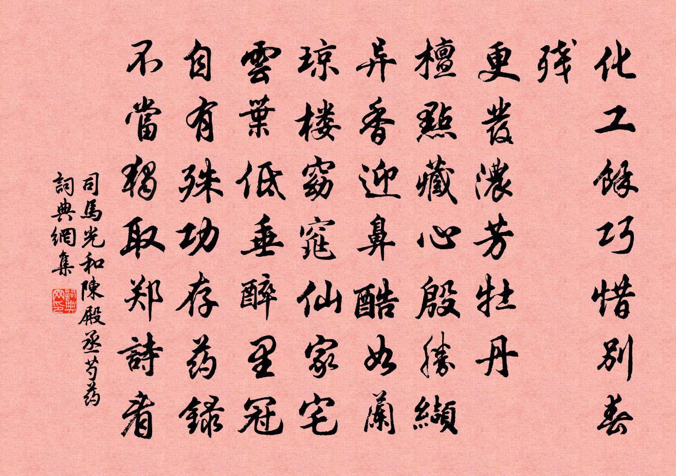 化工余巧惜別春殘,更發濃芳牡丹。檀點藏心殷勝纈,異香迎鼻酷如蘭。
