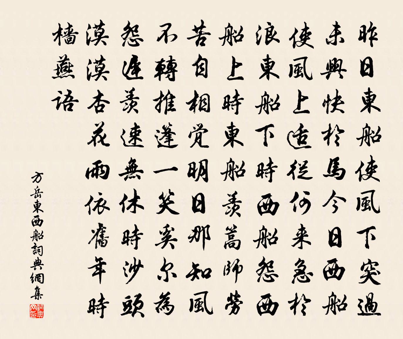 詩詞名句歷史字典書法欣賞書法字典國語詞典說文解字康熙字典古漢語字典標 題 作 者 詩 句 東西船作者:方岳 朝代:宋代東西船原文昨日東船使風下,突過未興快於馬。今日西船使風上,適從何來急於浪。東船下時西船怨,西船上時東船羨。篙師勞苦自相覺,明日那知風不轉。推篷一笑奚爾為,怨遲羨速無休時。沙頭漠漠杏花雨,依舊年時檣燕語。詩詞問答問:東西船的作者是誰?答:方岳問:東西船寫於哪個朝代?答:宋代方岳東西船書法欣賞東西船書法作品詩詞推薦上西平/金人捧露盤張元乾〔宋代〕臥扁舟,聞寒雨,數佳期。又還是、輕誤仙姿。小樓夢冷,覺來應恨我歸遲。鬢雲松處,枕檀斜、露泣花枝。名利虞美人黃大輿〔宋代〕世間離恨何時了。不為英雄少。楚歌聲起霸圖休。玉帳佳人血淚、滿東流。葛荒葵老蕪城暮。玉貌知何處。至今芳偈頌一百三十六首釋惟一〔宋代〕初二出城,歸來初五。十字街頭撞見張三,元是山前舊李四。面目如前,語言如前,語言如故。再三道佛法澆漓,句呂誨〔宋代〕料峭東風不易禁。早春歸山中舊居(一作寓居有懷呈舊知)薛能〔唐代〕綠草閉閒院,悄然花正開。新年人未去,戊日燕還來。雨地殘枯沫,燈窗積舊煤。歸田語不忘,樗散料非才。出城鄭獬〔宋代〕塵土滿城黑,出城雙眼寬。山川秋意惡,風雨晚潮寒。物象颯以變,泥污不可蟠。英豪重節概,兒女感衰殘。霜老甿入城行趙執信〔清代〕村甿終歲不入城,入城怕逢縣令行。行逢縣令猶自可,莫見當衙據案坐。但聞坐處已驚魂,何事喧轟來向村。鋃鐺林子中知府輓詩虞儔〔宋代〕疇昔因難弟,夤緣幸識君。宦途俱別日,苕水再披雲。勞苦驚多病,悲涼惜離群。斗金峰下路,鐸挽不堪聞。訊黃乙山於壽寧寺黃敏求〔宋代〕客中聽雨況僧寮,盡日無人訪寂寥。一枕秋聲供痛快,隔窗風裡有芭蕉。至靈吟邵雍〔宋代〕至靈之謂人,至貴之謂君。明則有日月,幽則有鬼神。和蘇適春雪八首張耒〔宋代〕春城北斗轉招搖,寒御初還陣尚囂。一夜雪聲欺布被,定知貧舍故相撩。四言詩十一首 其十一嵇康〔兩漢〕微風清扇。雲氣四除。皎皎亮月。麗於高隅。興命公子。攜手同車。龍驥翼翼。揚鑣踟躕。肅肅宵征。造我友廬。暮景楊冠卿〔宋代〕客行無常期,遠適亦有歸。家人具膏沐,垢發幸一晞。可憐兒時面,坐受塞色欺。看鏡恍如失,功名定何時。又登碧雲亭感懷三十首吳芾〔宋代〕晚上危亭側耳聽,新蟬噪罷亂蛙鳴。老來只是便幽靜,頗厭人間強聒聲。被檄出城洪咨夔〔宋代〕引卻東風觱栗聲,竹輿如半作春行。山中祗怪天能窄,棧外方知地本平。黔袂煉{上艹下都}斜屋小,黃纓淘礦亂聞雁篇楊維楨〔元代〕樓頭聞過雁,隻影不成雙。一夜狂夫夢,相隨到九江。子期台張至龍〔宋代〕拾葉題詩愧不才,袖遮微日上層台。山僧分我松陰坐,隔岸花香渡水來。和子華兄方惜鶯聲之晚今忽聞之韓維〔宋代〕山鳥凡禽處處鳴,獨憐清囀久無聲。起從岩谷春風晚,飛過林塘霽日明。不為好音輕俗耳,自逢真賞動詩情。少年暮春宴東園方良翰有詩入夏追和黃公度〔宋代〕要洗襟懷萬斛埃,一尊相屬莫遲回。顛狂柳絮將春去,排比荷花刺水開。懶矣宦情甘冗長,拙於句法強追陪。人生千秋歲司馬遷〔兩漢〕寶香盈袖。約腕金條瘦。裙兒細襉如肩皺。笑多簪髻側,語小絲簧奏。洞房晚,千金未直橫波溜。緣短歡難又。人名句推薦松花釀酒,春水煎茶。張可久《人月圓·山中書事》 似花還似非花,也無人惜從教墜。蘇軾《水龍吟·次韻章質夫楊花詞》 集中什九從軍樂,亘古男兒一放翁。梁啓超《讀陸放翁集》 花意爭春,先出歲寒枝。辛棄疾《江神子·賦梅寄余叔良》 波瀾誓不起,妾心古井水。孟郊《列女操 / 烈女操》 聚散匆匆,此恨年年有。魏夫人《點絳唇·波上清風》 話不在多說,有理不在高聲!佚名《增廣賢文·下集》 玉爐香,紅蠟淚,偏照畫堂秋思。溫庭筠《更漏子·玉爐香》 聖人見微以知萌,見端以知末,故見象箸而怖,知天下之不足也。韓非及後人《韓非子·說林上》 走馬西來欲到天,辭家見月兩回圓。岑參《磧中作》