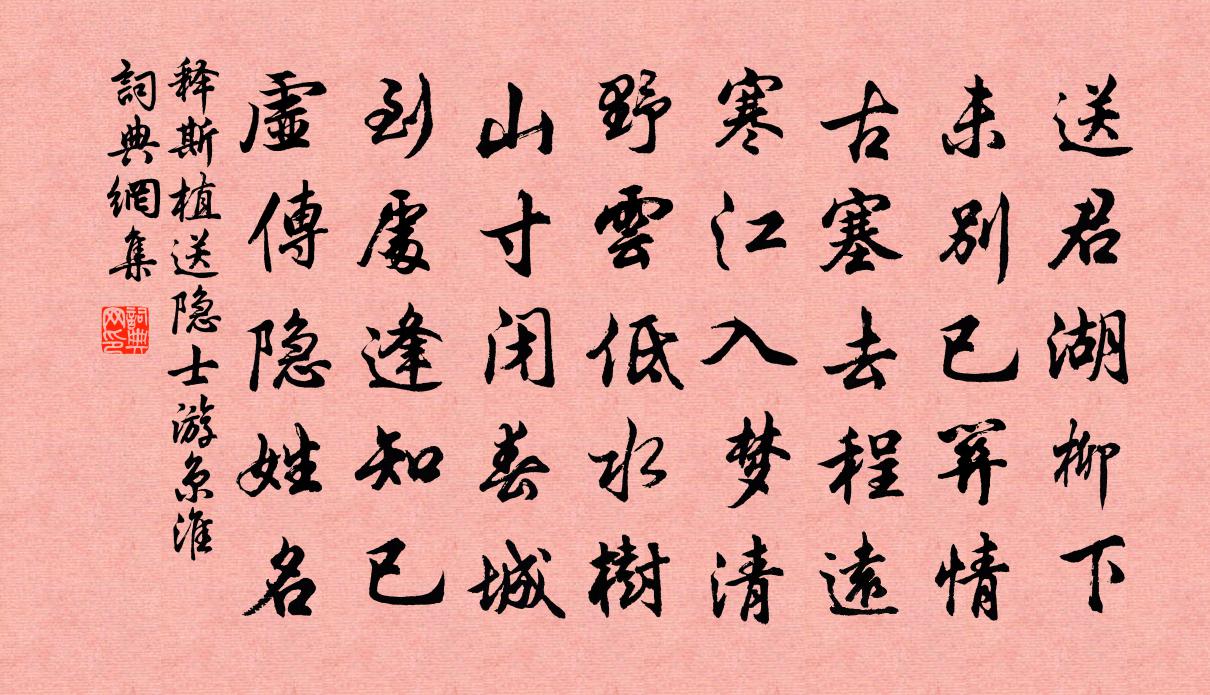 詩詞名句歷史字典書法欣賞書法字典國語詞典說文解字康熙字典古漢語字典標 題 作 者 詩 句 送隱士游京淮作者:釋斯植 朝代:宋代送隱士游京淮原文送君湖柳下,未別已關情。古塞去程遠,寒江入夢清。野雲低水樹,山寸閉春城。到處逢知已,虛傳隱姓名。詩詞問答問:送隱士游京淮的作者是誰?答:釋斯植問:送隱士游京淮寫於哪個朝代?答:宋代釋斯植送隱士游京淮書法欣賞送隱士游京淮書法作品詩詞推薦酬崔侍御早秋臥病書情見寄時君亦抱疾在假中盧綸〔唐代〕擲地金聲信有之,瑩然冰玉見清詞。元凱癖成官始貴,相如渴甚貌逾衰。荒園每覺蟲鳴早,華館常聞客散遲。寂寞和鄭府判韻杜范〔宋代〕萬里扶搖整飛翮,自是凌雲九霄客。黃槐白紵秋風高,借君彈壓添顏色。奉檄校文真誤推,多才視我蚿與夔。竭力挽吳丞相胡寅〔宋代〕妙齡一月了群書,未壯聲華眾已孚。器遠況曾師舊德,時來俄看獻嘉謨。親扶日轂升天路,不許金戈入帝都。大節酒泉子(同前)晁補之〔宋代〕萱草戎葵,松菊堂深猶畏暑,晚雲催雨靄簾櫳。滿樓風。池蓮翻倒小蓮紅。看掃鑒、天清似水,一輪明月卻當空。酬次李辰甫所寄三首吳說〔宋代〕桐花竹實幾時生,桑野秋繭未定成。肯信饑寒能累道,唯余寂寞許尋盟。年顏已愧神仙事,江海難忘故舊情。何日點絳唇曹勛〔宋代〕秋雨彌空,冷侵窗戶琴書潤。四檐成韻。孤坐無人問。壯志消沈,喜入清閒運。常安分。炷煙飄盡。更撥餘香燼。祭天神(歇指調)柳永〔宋代〕憶繡衾相向輕輕語。屏山掩、紅蠟長明,金獸盛熏蘭炷。何期到此,酒態花情頓孤負。柔腸斷、還是黃昏,那更滿戎州蘇轍〔宋代〕江水通三峽,州城控百蠻。沙昏行旅倦,邊靜禁軍閒。漢虜更成市,羅紈靳不還。投氈撿精密,換馬瘦孱顏。兀兀晴潘牥〔宋代〕西風一夜與晴期,紅日當天燒陸離。雲似敗棋無著處,山如宿酒頓醒時。陳子厚送韶鴨將以七絕因次其韻吳芾〔宋代〕投跡山林不厭深,老來寧復計升沉。水禽得得來相伴,應識幽人一片主。壽李夔州乃陽枋〔宋代〕乾月生真賢,老子其猶龍。主靜以觀動,萬籟鳴秋蟲。片心間淵明,結社同遠公。俯仰身世浮,妍華收晴虹。堂迥推官惠李庶子鄂州篆字文同〔宋代〕天下有奇篆,陽冰書鄂州。異獸呀五口,狂咬掉三頭。磥砢玻璃碗,詰屈珊瑚鉤。愧無希世寶,何以為子酬。識喜陸游〔宋代〕本自怕沾京洛塵,固應不吐相君茵。偶逃鼉作鯨吞地,幸保詩狂酒病身。傲世曾歌楚人鳳,著書久絕魯郊麟。山村寄曹松(一作洛中作)裴說〔唐代〕莫怪苦吟遲,詩成鬢亦絲。鬢絲猶可染,詩病卻難醫。山暝雲橫處,星沈月側時。冥搜不可得,一句至公知。偈頌一百一十七首釋紹曇〔宋代〕十二瑞峰前,一火白拈賊。佛面夜叉心,是何等相識。燒香供養,使自知非,剪月初無陷 * 。水龍吟(次韻林聖予惜春)晁補之〔宋代〕問春何苦匆匆,帶風伴雨如馳驟。幽葩細萼,小園低檻,壅培未就。吹盡繁紅,占春長久,不如垂柳。算春長不老蝶戀花辛棄疾〔宋代〕何物能令公怒喜。山要人來,人要山無意。恰似哀箏弦下齒。千情萬意無時已。自要溪堂韓作記。今代機雲,好語雨中登安福寺塔陸游〔宋代〕平生喜登高,醉眼無強界。北顧極幽并,東望跨海岱。喟然撫手嘆,從古幾成敗?英雄如過鳥,城郭但遺塊。今朝頌古二十六首釋嗣宗〔宋代〕烏龜三眼紅如火,一角麒麟快似錐。土宿夜遊南贍部,泥牛腳下火星飛。宮詞張公庠〔宋代〕交直歸來繡幕開,紅爐互勸辟寒杯。誰知飛雪輕獨意,倒學佳人舞袖回。名句推薦凡事之本,必先治身呂不韋《呂氏春秋·紀·季春紀》 暗塵隨馬去,明月逐人來。蘇味道《正月十五夜》 奔車之上無仲尼,覆舟之下無伯夷。韓非及後人《韓非子·安危》 還君明珠雙淚垂,恨不相逢未嫁時。張籍《節婦吟·寄東平李司空師道》 諂諛在側,善議障塞,則國危矣。墨子《墨子·01章 親士》 奇卓異非至人,至人只是常。洪應明《菜根譚·概論》 天下熙熙,皆為利來;天下攘攘,皆為利往。司馬遷《史記·貨殖列傳》 讀書破萬卷,下筆如有神。杜甫《奉贈韋左丞丈二十二韻》 曲闌深處重相見,勻淚偎人顫。納蘭性德《虞美人·曲闌深處重相見》 棲霞山裂;沂水陷穴,廣數畝蒲松齡《地震》
