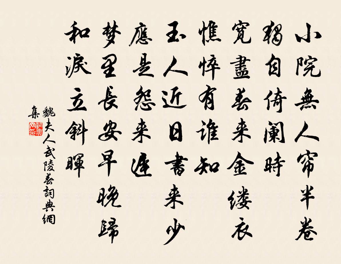 詩詞名句歷史字典書法欣賞書法字典國語詞典說文解字康熙字典古漢語字典標 題 作 者 詩 句 武陵春作者:魏夫人 朝代:宋代武陵春原文小院無人簾半卷,獨自倚闌時。寬盡春來金縷衣。憔悴有誰知。玉人近日書來少,應是怨來遲。夢裡長安早晚歸。和淚立斜暉。詩詞問答問:武陵春的作者是誰?答:魏夫人問:武陵春寫於哪個朝代?答:宋代問:武陵春是什麼體裁?答:詞魏夫人武陵春書法欣賞武陵春書法作品詩詞推薦梅夏應教詩薛道衡〔隋代〕長廊連紫殿。細雨應黃梅。浮雲半空上。清吹隔池來。集鳳桐花散。勝龜蓮葉開。幸逢為善樂。頻降濟時才。和張倅行縣楊時〔宋代〕江浮疊巘弄清輝,雲外冥鴻江上歸。擊目自多幽興在,揮毫時見彩箋飛。應愁零雨侵星駕,好為援戈卻晚暉。帝室大滌洞留題趙汝諿〔宋代〕坡老吟來今幾齡,翠蛟飛舞若天成。欄乾小倚揮觴處,最愛泉聲亂雨聲。家近雲山九鎖深,誅茅已負十年心。筍輿送悅齋先生程公許〔宋代〕風塵三十年,世途日險峰窄。嬋娟棄土梗,倚市競容澤。大雅何寂寥,志士三歡息。難持惠斯文,為國永壽脈。靈及第後還家過峴嶺李頻〔唐代〕魏馱山前一朵花,嶺西更有幾千家。石斑魚鮓香沖鼻,淺水沙田飯繞牙。題清水寺曾從龍〔宋代〕壁立崢嶸萬仞峰,騎鯨俄蛻葛陂筇。空流詩句傳千古,今在蓬萊第幾重。岩上勝游成幻夢,壁間遺蹟暗塵容。山僧和方機宜陳宓〔宋代〕絕頂樵翁總是仙,花紅草綠自年年。瓊樓玉宇成虛誕,盤石長松足醉眠。小竇偏能施雨澤,深崖常恐出雲煙。遊人送王璋長官赴真定孫和甫辟書蘇轍〔宋代〕昔年旅南服,始識王荊州。威動千里肅,恩寬行客留。從容見少子,風采傾凡儔。溫然吐詞氣,已覺清且修。不見雙槐晚秀三月一日初見新葉張耒〔宋代〕東皇無處著繁華,亦復分張到我家。他日老蒼悲敗枾,今晨嫩綠出新芽。禿翁承弁纖纖發,村婦縈鬟草草花。桃李月夜散策縣圃,有飛蝶,仍聞笛聲楊萬里〔宋代〕月明未許人早睡,笛聲鮮與秋爭清。夜深不應有飛蝶,渠儂似欲伴人行。鄧掾知言再和暮春詩見視過形推獎有意論詩報晁說之〔宋代〕江左多才士,君詩醉玉紅。幾篇愁客恨,九畹任春空。便欲傾家釀,誰知出谷風。劉楊名一代,可惜義山窮。臨江仙葉夢得〔宋代〕唱徹陽關分別袂,佳人粉淚空零。請君重作醉歌行。一歡須痛飲,回首念平生。卻怪老來風味減,半酣易逐愁醒。再和項安世〔宋代〕湖海崢嶸老氣,風雲慘澹高情。可惜元龍雙鬢,江南江北詩聲。晚出尋人不遇白居易〔唐代〕籃輿不乘乘晚涼,相尋不遇亦無妨。輕衣穩馬槐陰下,自要閒行一兩坊。薛野鶴薛嵎〔宋代〕瘦形如鶴頭如雪,流浪江湖歲月深。但是胸中有丘壑,何分城市與山林。齒脫釋文珦〔宋代〕老齒皆脫落,十中無二三。存者一動搖,咀嚼寧復堪。荼薺均一咽,盡略苦與甘。世味非道腴,正爾不欲耽。九張機佚名〔宋代〕一張機。織梭光景去如飛。蘭房夜永愁無寐。嘔嘔軋軋,織成春恨,留著待郎歸。鳩史彌寧〔宋代〕著詩催得雨垂垂,連累林鳩逐婦歸。為汝賦晴休怨望,自今已後免分飛。舟中遣興陸游〔宋代〕湖海渺雲濤,浮家得養高。方床展蘄簟,短褐束郿絛。酒里亦何好,人間聊可逃。酣歌柂樓底,萬事一秋豪。橘林張嵲〔宋代〕後皇毓珍木,翠蓋如停雲。徠服茲南土,素艷方氛氳。眷言在深固,非用似封君。名句推薦白雪卻嫌春色晚,故穿庭樹作飛花。韓愈《春雪》 口言之,身必行之。墨子《墨子·48章 公孟》 但知江湖者,都是薄命人。佚名《增廣賢文·下集》 君子成人之美,不成人之惡;小人反是。孔子弟子《論語·顏淵篇》 報答春光知有處,應須美酒送生涯。杜甫《江畔獨步尋花七絕句》 萬里人南去,三春雁北飛。韋承慶《南中詠雁詩》 秋逼暗蟲通夕響,征衣未寄莫飛霜。張仲素《秋夜曲》 莫飲卯時酒,昏昏醉到酉。佚名《增廣賢文·上集》 世人解聽不解賞,長飆風中自來往。李頎《聽安萬善吹觱篥歌》 待到重陽日,還來就菊花。孟浩然《過故人莊》