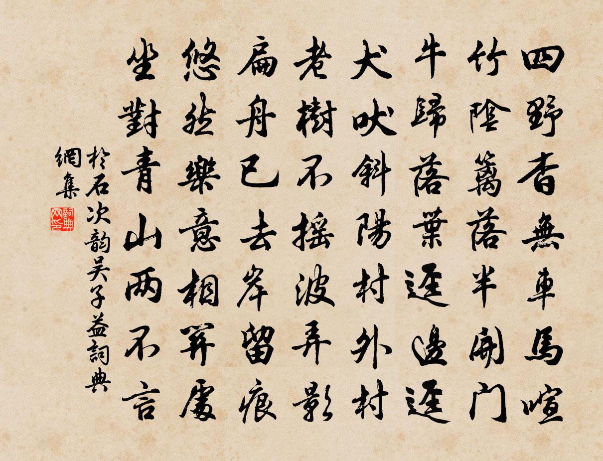詩詞名句歷史字典書法欣賞書法字典國語詞典說文解字康熙字典古漢語字典標 題 作 者 詩 句 次韻吳子益作者:於石 朝代:宋代次韻吳子益原文四野杳無車馬喧,竹陰籬落半開門。牛歸落葉逕邊逕,犬吠斜陽村外村。老樹不搖波弄影,扁舟已去岸留痕。悠然樂意相關處,坐對青山兩不言。詩詞問答問:次韻吳子益的作者是誰?答:於石問:次韻吳子益寫於哪個朝代?答:宋代於石次韻吳子益書法欣賞次韻吳子益書法作品詩詞推薦送趙司理歸永嘉劉克莊〔宋代〕終歲閉柴荊,於君面尚生。客談花判健,民道李官清。方喜片言折,忽因微罪行。呂侯今秉鉞,羔雁必來迎。端午詞內廷晏殊〔宋代〕披風別殿地無塵,辟惡靈符自有神。九子粽香仙醴熟,共瞻宸極祝千春。順風至採石袁說友〔宋代〕快哉真得楚王風,鉦鼓喧江四面雄。但欲帆檣催上水,敢辭井路傍西戎。江空歲晚飛煙外,人靜霜明過浪中。少泊奉和立春遊苑迎春李適適〔唐代〕金輿翠輦迎嘉節,御苑仙宮待獻春。淑氣初銜梅色淺,條風半拂柳牆新。天杯慶壽齊南嶽,聖藻光輝動北辰。稍覺金陵十二釵又副冊——晴雯曹雪芹〔清代〕霽月難逢,彩雲易散。心比天高,身為 * 。風流靈巧招人怨。壽夭多因誹謗生,多情公子空牽念!曲江憶元九白居易〔唐代〕春來無伴閒遊少,行樂三分減二分。何況今朝杏園裡,閒人逢盡不逢君。秋懷 其一王冕〔元代〕悲風度古木,吹我屋上茅。茅去屋見底,風聲尚蕭蕭。人心一何苦?人情一何驕?卻將眼下淚,散作炎上膏。立春後連雨強至〔宋代〕東風自動故園枝,未見終期不雨時。遮莫年光浮水嫩,定應春色上花遲。山川慘澹隨人意,車馬艱難誤客期。萬瓦過建封寺下連魚灘二首楊萬里〔宋代〕江收眾水赴單槽,石壁當流斗雪濤。將取危舟飛過去,黃頭郎只雨三篙。頌古二十首釋道顏〔宋代〕東西南北捉虛空,海角天涯信不通。力盡神疲無處覓,萬年松在祝融峰。酬成少尹駱谷行見呈岑參〔唐代〕聞君行路難,惆悵臨長衢。豈不憚險艱,王程剩相拘。憶昨蓬萊宮,新授刺史符。明主仍賜衣,價值千萬餘。何幸謝彭大夫惠寒山詩三首曹勛〔宋代〕老彭臨安來,惠我以寒山。儘是化導意,更無一句閒。頓驅迷悞心,盡置針石間。久久得受用,誰畏凋朱顏。寄金陵僧周賀〔唐代〕水石致身閒自得,平雲竹閣少炎蒸。齋床幾減供禽食,禪徑寒通照像燈。覓句當秋山落葉,臨書近臘硯生冰。行登疊韻吳宮詞二首陸龜蒙〔唐代〕膚愉吳都姝,眷戀便殿宴。逡巡新春人,轉面見戰箭。紅櫳通東風,翠珥醉易墜。平明兵盈城,棄置遂至地。過青陽齊丘舊隱周南〔宋代〕利盡漁民五季年,誰蠲丁口畝輸錢。不將公量收家邑,漫把徵賢改應天。十二月二十八日,蒙恩責授檢校水部員外郎黃蘇軾〔宋代〕百日歸期恰及春,餘年樂事最關身。出門便旋風吹面,走馬聯翩鵲啅人。卻對酒杯疑是夢,試拈詩筆已如神。此災潺湲閣小立陸游〔宋代〕飽食何曾補縣官,潺湲閣上倚闌乾。水紋靴皺風初緊,花色*紅露未乾。薄酒愁邊供醉醒,故人夢裡話悲歡。孤城宣州罷任再贈文天祥〔宋代〕貧賤元無富貴思,泥塗滑滑總危機。世無徐庶不如臥,見到淵明便合歸。流落丹心天肯未,崢嶸青眼古來稀。西風鄉友嚴上舍過我妙山逆旅中示二絕句隨繼韻謝曾豐〔宋代〕相逢初不出相期,笑見熙間喜見眉。總是廬陵老憚客,未詢其價已先知。邃谷釋文珦〔宋代〕邃谷居來久,寥寥絕眾喧。雲深通藥徑,草長失柴門。靜愛寒山色,閒尋野水源。清虛乃吾事,不與俗人言。名句推薦相思黃葉落,白露濕青苔。李白《長相思三首》 可憐處處巢居室,何異飄飄托此身。杜甫《燕子來舟中作》 喜得故人同待詔,擬沽春酒醉京華。高啟《清明呈館中諸公》 挾飛仙以遨遊,抱明月而長終。蘇軾《前赤壁賦》 名不徒生,而譽不自長。功成名遂。墨子《墨子·02章 修身》 夜雨做成秋,恰上心頭。納蘭性德《浪淘沙·夜雨做成秋》 晴風初破凍,柳眼梅腮,已覺春心動。李清照《蝶戀花·暖雨晴風初破凍》 天秋月又滿,城闕夜千重。戴叔倫《客夜與故人偶集 / 江鄉故人偶集客舍》 明日隔山嶽,世事兩茫茫。杜甫《贈衛八處士》 眾口鑠金,積毀銷骨。司馬遷《史記·張儀列傳》