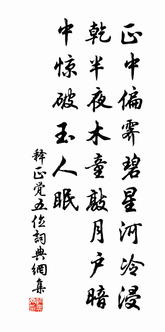 詩詞名句歷史字典書法欣賞書法字典國語詞典說文解字康熙字典古漢語字典標 題 作 者 詩 句 五位作者:釋正覺 朝代:宋代五位原文正中偏,霽碧星河冷浸乾。半夜木童敲月戶,暗中驚破玉人眠。詩詞問答問:五位的作者是誰?答:釋正覺問:五位寫於哪個朝代?答:宋代釋正覺五位書法欣賞五位書法作品詩詞推薦壽許侯楊公遠〔宋代〕星輝南極彩雲邊,律轉黃鐘一日前。河嶽間生賢太守,樁松齊算老神仙。心猶秋月燭千里,人在春風度兩年。只恐過永寧白居易〔唐代〕村杏野桃繁似雪,行人不醉為誰開。賴逢山縣盧明府,引我花前勸一杯。天作佚名〔先秦〕天作高山,大王荒之。彼作矣,文王康之。彼徂矣,岐有夷之行。子孫保之。湛露佚名〔先秦〕湛湛露斯,匪陽不晞。厭厭夜飲,不醉無歸。湛湛露斯,在彼豐草。厭厭夜飲,在宗載考。湛湛露斯,在彼杞棘。華山慶雲見佚名〔唐代〕聖主祠名岳,高風發慶雲。金柯初繚繞,玉葉漸氛氳。氣色含珠日,光明吐翠雰。依稀來鶴態,仿佛列仙群。萬樹過堅上人故院與李端同賦司空曙〔唐代〕舊依支遁宿,曾與戴顒來。今日空林下,唯知見綠苔。次韻子瞻武昌西山黃庭堅〔宋代〕漫郎江南酒隱處,古木參天應手栽。石坳為尊酌花鳥,自許作鼎調鹽梅。平生四海蘇太史,酒澆不下胸崔嵬。黃州桃花李流謙〔宋代〕自然穠臉與深唇,一味繁紅也絕倫。滄海浪傳千歲種,武陵慶有四時春。去年崔護詩仍在,前度劉郎意獨親。亦要和文與可洋川園池三十首 望雲樓蘇軾〔宋代〕陰晴朝暮幾回新,已向虛空付此身。出本無心歸亦好,白雲還似望雲人。碧泉獨步胡宏〔宋代〕淅淅秋風動,前橋晚步還。小魚沖岸側,白鳥立溪灣。明月照秋水,淡煙籠遠山。此時知造物,憐我一身閒。自詠白居易〔唐代〕須白面微紅,醺醺半醉中。百年隨手過,萬事轉頭空。臥疾瘦居士,行歌狂老翁。仍聞好事者,將我畫屏風。減字木蘭花朱敦儒〔宋代〕無人請我。我自鋪氈松下坐。酌酒栽詩。調弄梅花作侍兒。心歡易醉。明月飛來花下睡。醉舞誰知。花滿紗巾月滿頌古十七首釋宗演〔宋代〕紅輪決定沉西去,未委魂靈往那方。孝子盡情宣說了,槃山無處可遮藏。藏不得,堪與人天為軌則。次韻蚤蚊范成大〔宋代〕羽蟲ㄠ魔塞區寰,造化胡為弗疾頑。長養淤泥草木處,縱橫大地山河間。夜聲雷動人力屈,秋喙花開天理還。但願神宗皇帝輓辭二首王安石〔宋代〕城闕宮車轉,山林隧路歸。蒼梧雲未遠,姑射露先曦。玉暗蛟龍蟄,金寒雁鶩飛。老臣他日淚,湖海想遺衣。再和二首劉克莊〔宋代〕古柏每經寒聳秀,朝花不待夕離披。舉揚壹似德山棒,摧拉過於力士椎。化鶴仙歸見孫老,感麟翁泣嘆吾衰。楚狂晚游新亭張嵲〔宋代〕秋至今幾日,山雲峰尚奇。新亭獨騁望,詠我秋懷詩。碧水縈麓轉,幽蟬映葉悲。古藤依翠壁,茂樹鏡清池。賞會山胡蘇轍〔宋代〕山胡擁蒼毳,兩耳白茸茸。野樹啼終日,黔山深幾重。啄溪探細石,噪虎上孤峰。被執應多恨,筠籠僅不容。奉和滎陽公離筵作元稹〔唐代〕南郡生徒辭絳帳,東山妓樂擁油旌。鈞天排比簫韶待,猶顧人間有別情。李留守相公見過池上泛舟舉酒話及翰林舊事…以獻之白居易〔唐代〕引棹尋池岸,移尊就菊叢。何言濟川後,相訪釣船中。白首故情在,青雲往事空。同時六學士,五相一漁翁。名句推薦只在此山中,雲深不知處。賈島《尋隱者不遇 / 孫革訪羊尊師詩》 艱難苦恨繁霜鬢,潦倒新停濁酒杯。杜甫《登高》 把酒送春春不語。黃昏卻下瀟瀟雨。朱淑真《蝶戀花·送春》 艷妝臨水最相宜。風來吹繡漪。吳文英《醉桃源·芙蓉》 行善濟人,人遂得以安全,即在我亦為快意王永彬《圍爐夜話·第五一則》 蠶無夏織桑充寨,田廢春耕犢勞軍。杜荀鶴《題所居村舍》 稽於眾,捨己從人,不虐無告,不廢困窮佚名《尚書·虞書·大禹謨》 北風吹白雲,萬里渡河汾。蘇頲《汾上驚秋》 玉梅消瘦,恨東皇命薄。汪元量《傳言玉女·錢塘元夕》 雲外好呼南去雁,系書先為報江鄉。齊之鸞《九日登清水營城》