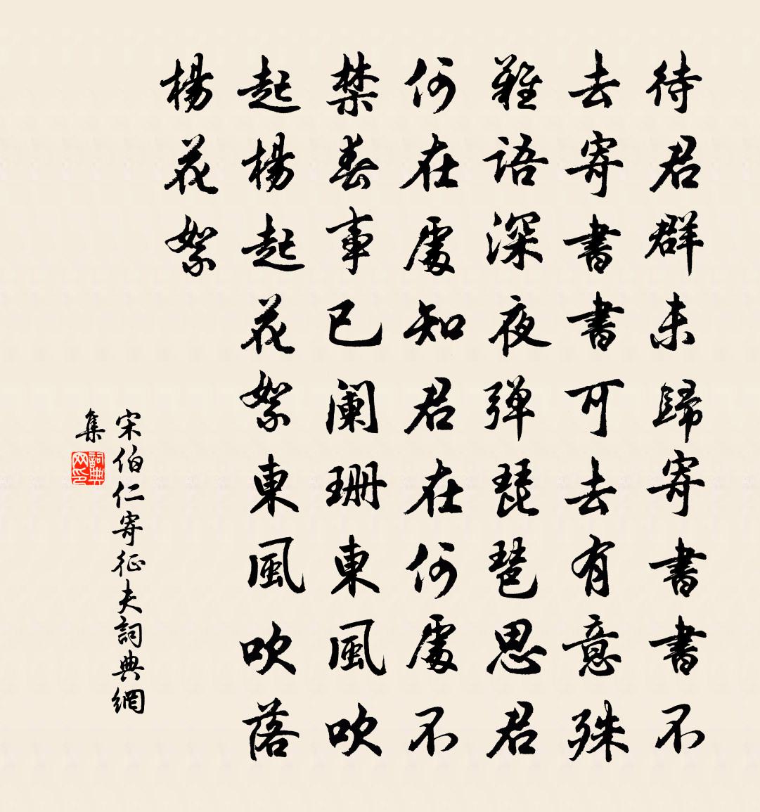 詩詞名句歷史字典書法欣賞書法字典國語詞典說文解字康熙字典古漢語字典標 題 作 者 詩 句 寄征夫作者:宋伯仁 朝代:宋代寄征夫原文待君群未歸,寄書書不去。寄書書可去,有意殊難語。深夜彈琵琶,思君何在處,知君在何處。不禁春事已闌珊,東風吹起楊起花絮,東風吹落楊花絮。詩詞問答問:寄征夫的作者是誰?答:宋伯仁問:寄征夫寫於哪個朝代?答:宋代宋伯仁寄征夫書法欣賞寄征夫書法作品詩詞推薦游小洞庭白居易〔唐代〕湖山上頭別有湖,芰荷香氣占仙都。夜含星斗分乾象,曉映雷雲作畫圖。風動綠蘋天上浪,鳥栖寒照月中烏。若非和叔崇兩絕王柏〔宋代〕春來風雪無虛日,老去光陰如箭急。窗外梅花猶未殘,高標卻被寒留得。詠月三首王安石〔宋代〕一片清光萬里兼,幾回圓極又纖纖。君看出沒非無意,豈為辛懃養玉蟾。喜晴章甫〔宋代〕連山春雨來,徑滑不容足。行人相攀援,泥濘及馬腹。欲往不得前,野店可投宿。朝來天宇佳,笑語聞童僕。宣城漁家傲(斜月)黃裳〔宋代〕已送清歌歸去後。東南樓上人聲悄。冷落尤臨弦上調。歡意少。空將萬感收殘照。窗外劍光初出鞘。斜窺夢斷人年喜七兄疾愈二首張耒〔宋代〕南鄰隱士龍虎鼎,東寺比丘堅密身。欲知十室有信處,顧此兩賢非世人。戰勝天魔初起定,寶成丹灶不妨貧。何時記正月二十五日西湖之游十五首方回〔宋代〕空埋貞觀蘭亭字,再出文城玉枕書。想見八梅冢無物,生前曾笑馬相如。緣識宋太宗〔宋代〕駈駈席不蹔安時。勤苦終朝景易移。達得物情深道理,無為堪作後人命。送王明府入道戎昱〔唐代〕何事陶彭澤,明時又掛冠。為耽泉石趣,不憚薜蘿寒。輕雪籠紗帽,孤猿傍醮壇。懸懸老松下,金灶夜燒丹。江城子·密州出獵蘇軾〔宋代〕老夫聊發少年狂,左牽黃,右擎蒼,錦帽貂裘,千騎卷平岡。為報傾城隨太守,親射虎,看孫郎。酒酣胸膽尚開張枕上六言二首范成大〔宋代〕獨眠被出圭角,晏起帳承隙光。一老綢繆牖戶,幾人顛倒衣裳。寒松草閣詹初〔宋代〕數椽草閣構新成,四面蒼松入戶清。霜雪須教長不改,後凋端與爾為盟。紅芍藥王哲〔元代〕這王哲知明,見菊花堅操。便將重陽子為號。正好相倚靠。每常卻要,綴作詩詞,筆無停自然來到。心香起、印出送鄭嚴州四首陳鑒之〔宋代〕諸賢適江海,梧竹孤鳳吟。願言正王度,祈招嗣清音。亦為膠西董,反慰及物心。未可賦柏舟,天眷宗社深。重題郭文廟釋文珦〔宋代〕嘗聞郭文舉,雅志在山林。內以道自勝,不為外物淫。人皆戀妻子,先生獨幽尋。人皆厭輕肥,先生無衣衾。人皆惜花李建勛〔唐代〕白髮今如此,紅芳莫更催。預愁多日謝,翻怕十分開。點滴無時雨,荒涼滿地苔。閒階一杯酒,惟待故人來。明復作文房四物詩因用其韻郭印〔宋代〕銳精文字里,今古嘆毛錐。職在中書貴,功因大手奇。楮君頻借重,墨客最相知。絕跡頭童日,麟經萬世師。周先生元稹〔唐代〕寥寥空山岑,冷冷風松林。流月垂鱗光,懸泉揚高音。希夷周先生,燒香調琴心。神力盈三千,誰能還黃金。相思兒令張先〔宋代〕春去幾時還,問桃李無言。燕子歸棲風緊,梨雪亂西園,猶有月嬋娟。似人人、難近如天。願教清影長相見,更乞春中興慶宮酺宴李隆基〔唐代〕九達長安道,三陽別館春。還將聽朝暇,回作豫游晨。不戰要荒服,無刑禮樂新。合酺覃土宇,歡宴接群臣。玉斝名句推薦積於不涸之倉者,務五穀也管仲《管子·牧民》 辭柯霜葉,飛來就我題紅。朱庭玉《天淨沙·秋》 父兄教子弟,必正其身以率子,無庸徒事言詞也。王永彬《圍爐夜話·第三三則》 世情薄,人情惡,雨送黃昏花易落。唐婉《釵頭鳳·世情薄》 參橫斗轉欲三更,苦雨終風也解晴。蘇軾《六月二十日夜渡海》 山頭堆白雪,風裡卷黃沙。楊守禮《三月巡邊曉發夏城》 苦心中常得悅心之趣;得意時便一失意之悲。洪應明《菜根譚·概論》 剛待不思量,吹一片、簫聲過牆。項鴻祚《太常引·客中聞歌》 穠艷一枝細看取,芳心千重似束。蘇軾《賀新郎·夏景》 世界微塵里,吾寧愛與憎。李商隱《北青蘿》
