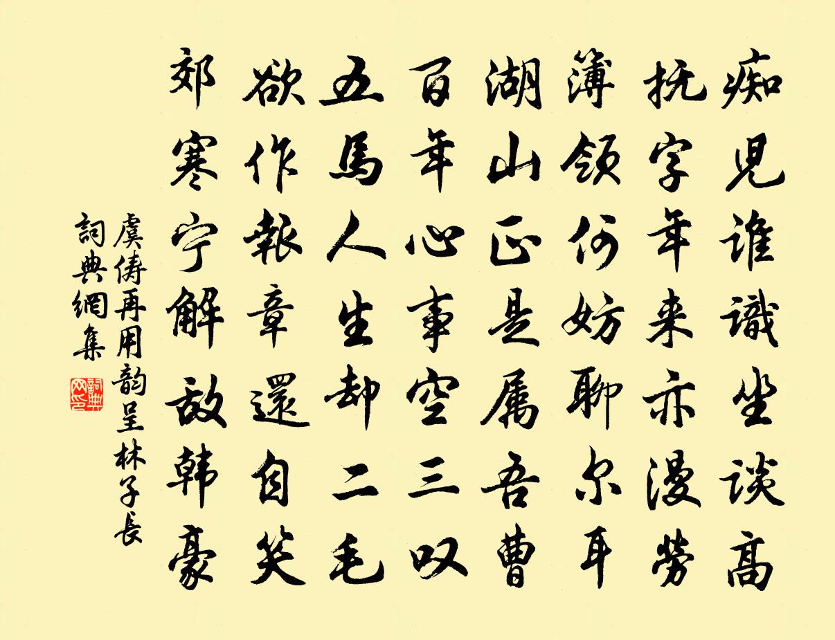 詩詞名句歷史字典書法欣賞書法字典國語詞典說文解字康熙字典古漢語字典標 題 作 者 詩 句 再用韻呈林子長作者:虞儔 朝代:宋代再用韻呈林子長原文痴兒誰識坐談高,撫字年來亦漫勞。簿領何妨聊爾耳,湖山正是屬吾曹。百年心事空三嘆,五馬人生卻二毛。欲作報章還自笑,郊寒寧解敵韓豪。詩詞問答問:再用韻呈林子長的作者是誰?答:虞儔問:再用韻呈林子長寫於哪個朝代?答:宋代虞儔再用韻呈林子長書法欣賞再用韻呈林子長書法作品詩詞推薦曉抵埔頭就陳氏食陳宓〔宋代〕幸有安閒日,那無自在身。人如年易老,詩與事長新。雨霽還佳境,途窮得主人。馳驅四十里,盤礴縣成闉。巳未春日山居雜興十二解楊萬里〔宋代〕半月春晴探物華,山園走得腳酸麻。從教三日風和雨,閉戶燒香不看花。蓬屋一首王阮〔宋代〕和檐十尺庇堂東,疎漏從來儘是蓬。日影碎如秋葉下,雨聲灑似夜船中。竹因蠹盡多垂地,箬到枯時半掩空。此處傷鄰家鸚鵡詞王建〔唐代〕東家小女不惜錢,買得鸚鵡獨自憐。自從死卻家中女,無人更共鸚鵡語。十日不飲一滴漿,淚漬綠毛頭似鼠。舌關答本堂先生歌趙必興〔宋代〕往事兮浮雲,偕老兮天倫。樂莫樂兮天真,如良人何兮良人。東谷沿小澗樹木叢蔚中有圓潭愛之久坐書所見文同〔宋代〕野水瀉古穴,石岸盤迴淵。飛塵不可入,竹樹圍清漣。靜往得勝玩,深居逃俗緣。寒光照煩襟,景寂心自圓。枯篁萬年歡(慶元聖節)趙以夫〔宋代〕鳳歷開新,正微和乍轉,麗景初曉。五莢蓂舒,光映玉階瑤草。在在東風語笑。慶此日、虹流電繞。鯨波靜,翠涌思蜀陸游〔宋代〕蜀莊鳴飛隘九區,超然豈止山澤臞。荒台古井無處所,行子但覓房公湖。雞張繼先〔宋代〕雞德靈居五,峨冠鳳彩新。五更大張口,喚醒夢中人。沁園春(賦靜齋叔溪堂)李曾伯〔宋代〕我愛臨川,簪紱叢林,有宅一區。記謝墩名字,百年猶在,平泉孫子,三世重居。皂蓋新營,青氈舊識,此復古春簡蔡天任吳則禮〔宋代〕天公與此強健身,故遣雨洗南徐春。梅柳暮年經老眼,江湖疇昔著覉臣。要穿遙集腳底屐,不負淵明頭上巾。頗欲戲言寄霅溪使君唐司勛鄭獬〔宋代〕水精宮殿從來小,寂寞蓬萊不可游。十萬人家明鏡里,神仙都會是杭州。憶秦娥仇遠〔宋代〕秋乍覺。露涼頓覺羅衾薄。羅衾薄。黃昏庭院,水風簾幕。闌乾待月花時約。愁長夢短渾忘卻。渾忘卻。南山猿鶴山齋陳與義〔宋代〕夏郊綠已遍,山齋晝自遲。雲物忽分散,余碧暮逶迤。寒暑送萬古,榮枯各一時。世紛幸莫及,我麈得常持。郡界閔雨州將率官屬禳禬宋祁〔宋代〕劭農方狎野,熯旱嘆焦原。六幕沈雲族,千箱害稼孫。都人望天漢,國相閉陽門。盛怒風生穴,汙邪祝有豚。征徒和謝吏部鐵字韻三十四首對酒二首鄧肅〔宋代〕世上鬼紛華蟻穴鬼耳,東流不作西歸水。號寒那用學孟郊,捉月要須追李子。一樽忽爾逢故人,高談往往鬼神嗔。送王伯初通判婺州司馬光〔宋代〕煜熗屏星駕,迢遙婺女區。嵐光晴向背,溪溜暖縈紆。萬室鳴機杼,千艘隘舳艫。若逢耆舊問,能說隱侯無。次韻滕元發許仲途秦少游蘇軾〔宋代〕二公詩格老彌新,醉後狂吟許野人。坐看青丘吞澤芥,自慚黃潦薦溪蘋。兩邦旌纛光相照,十畝鋤犁手自親。何似過邵堯夫先生富弼〔宋代〕先生自衛客西畿,樂道安間絕世機。再命初筵終不起,獨甘窮巷寂無依。貫穿百代嘗探古,吟詠千篇亦造微。珍重廣陵五題其五次韻子由題光化塔秦觀〔宋代〕古佛悲憐得度人,應緣來現比丘身。水流月落知何處,花發鶯啼又一春。方外笑談清似玉,夢中煩惱細如塵。老僧名句推薦秋波落泗水,海色明徂徠。李白《魯郡東石門送杜二甫》 問姓驚初見,稱名憶舊容。李益《喜見外弟又言別》 賭近盜,淫近殺。馮夢龍《警世通言·卷三十五》 回眸一笑百媚生,六宮粉黛無顏色。白居易《長恨歌》 眉尖早識愁滋味,嬌羞未解論心事。黃公度《菩薩蠻·眉尖早識愁滋味》 一晌凝情無語,手捻梅花何處。王之道《如夢令·一晌凝情無語》 東風隨春歸,發我枝上花。李白《落日憶山中》 芳草已雲暮,故人殊未來。韋莊《章台夜思》 過目成誦,出口成章。馮夢龍《警世通言·卷三》 過橋分野色,移石動雲根。賈島《題李凝幽居》