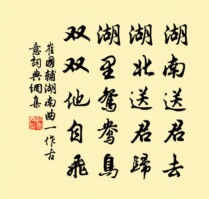 詩詞名句歷史字典書法欣賞書法字典國語詞典說文解字康熙字典古漢語字典標 題 作 者 詩 句 湖南曲(一作古意)作者:崔國輔 朝代:唐代湖南曲(一作古意)原文湖南送君去,湖北送君歸。湖裡鴛鴦鳥,雙雙他自飛。詩詞問答問:湖南曲(一作古意)的作者是誰?答:崔國輔問:湖南曲(一作古意)寫於哪個朝代?答:唐代問:湖南曲(一作古意)是什麼體裁?答:樂府崔國輔湖南曲(一作古意)書法欣賞湖南曲(一作古意)書法作品注釋全唐詩全唐詩:卷119_21詩文賞析 春日:一作春草。詩詞推薦李侍御歸炭谷山居同宿華嚴寺趙嘏〔唐代〕家在青山近玉京,白雲紅樹滿歸程。相逢一宿最高寺,半夜翠微泉落聲。七夕唐彥謙〔唐代〕露白風清夜向晨,小星垂佩月埋輪。絳河浪淺休相隔,滄海波深尚作塵。天外鳳凰何寂寞,世間烏鵲漫辛勤。倚闌文淵閣賜茶乾隆〔清代〕層閣文華殿後峨,昨春慶宴覺無何。具瞻楠架四庫貯,且喜芸編三面羅。十載春秋成不日,極天淵海尚餘波。待鈔大孤山祠晁補之〔宋代〕江吞湖卷氣俱豪,崛起孤峰百仞高。歸為嬋娟買絲屨,卻應還我所忘刀。採蓮子·菡萏香蓮十頃陂皇甫松〔唐代〕菡萏香連十頃陂,小姑貪戲採蓮遲。晚來弄水船頭濕,更脫紅裙裹鴨兒。漁婦觀音贊釋師範〔宋代〕腥稼通身不自知,更來漁市討便宜。就中活底無多子,提向風前賣與誰。三塔寺寒光亭張於湖書詞寺柱吳毅夫命名後軒岳珂〔宋代〕雲煙千嶂遠,風月四時新。笠澤昔魯望,鏡明今季真。何時脫塵絆,來此寄垂綸。一艇葦間宿,寒光長是鄰。鷺楊公遠〔宋代〕飄然片雪下晴空,終日盤旋淺瀨中。行近鷗鳧風致別,立依蒲蓼畫圖同。數莖絲髮心何慮,一世魚餐體不豐。歷遍追和東坡雨中睡熟至晚王之道〔宋代〕春睡酣帶酒,晚食美當肉。細觀東坡詩,萬事貴精熟。一陰七十日,雨意猶未足。山雲開複合,檐溜斷還續。東鄰蒲中霽後晚望薛能〔唐代〕河邊霽色無人見,身帶春風立岸頭。濁水茫茫有何意,日斜還向古蒲州。邯鄲才人嫁為廝養卒婦曹勛〔宋代〕落葉逐驚風,落花逐流水。漂零無定端,寄託隨所委。朝榮瑤圃中,暮落窮轍里。豈不惡糟糠,豈不原羅綺。羅綺蜆子和尚贊釋法薰〔宋代〕把個裡撈波,做盡窮伎倆。推出酒台盤,至今收不上。小惠陳杰〔宋代〕初持小惠釣聲華,祿厚官高譽轉加。過客廚豐路碑炫,中朝賂重里言夸。黃金何但買身貴,多粟尤堪作傳佳。百世華曄曄劉徹〔兩漢〕華曄曄,固靈根。神之斿,過天門,車千乘,敦崑崙。神之出,排玉房,周流雜,拔蘭堂。神之行,旌容容,騎沓細雨李商隱〔唐代〕蕭灑傍回汀,依微過短亭。氣涼先動竹,點細未開萍。稍促高高燕,微疏的的螢。故園菸草色,仍近五門青。宣城道中華岳〔宋代〕躍馬上宣城,千山翠欲顰。蕙風輕捲舌,櫻雨細沾唇。柳絮難驅臘,榆錢不 * 。何如澆一斗,爛醉石湖濱。題宅後井張耒〔宋代〕清泉十丈白如漿,甘似醍醐透◇涼。君欲道中無渴死,百尋操綆莫辭長。送晁秘丞通判雄州司馬光〔宋代〕少傳名德重,蔚然人物師。群孫滿丹穴,嘉瑞盡長離。勿嘆毛羽短,已驚文采奇。勉哉勤志業,餘慶未應衰。同薛侍御登黎陽縣樓眺黃河楊巨源〔唐代〕倚檻恣流目,高城臨大川。九回紆白浪,一半在青天。氣肅晴空外,光翻曉日邊。開襟值佳景,懷抱更悠然。同德精舍舊居傷懷韋應物〔唐代〕洛京十載別,東林訪舊扉。山河不可望,存沒意多違。時遷跡尚在,同去獨來歸。還見窗中鴿,日暮繞庭飛。名句推薦天與三台座,人當萬里城。張九齡《奉和聖制送尚書燕國公赴朔方》 記得武陵相見日,六年往事堪驚周紫芝《臨江仙·送光州曾使君》 芙蓉金菊斗馨香。天氣欲重陽。晏殊《訴衷情·芙蓉金菊斗馨香》 本理則國固,本亂則國危。管仲《管子·霸言》 又似賈客蜀道間,千鐸萬磬鳴空山牛殳《琵琶行》 秋天一夜靜無雲,斷續鴻聲到曉聞。張仲素《秋閨思二首》 到頭來,依舊是風塵骯髒違心愿。曹雪芹《紅樓夢·第五回》 鬢絲日日添白頭,榴錦年年照眼明;殷堯藩《端午日》 恨身翻不作車塵,萬里得隨君。歐陽炯《巫山一段雲·春去秋來也》 弱柳青槐拂地垂,佳氣紅塵暗天起。盧照鄰《長安古意》